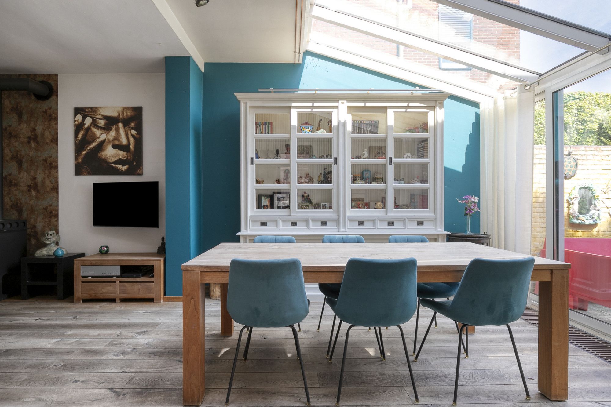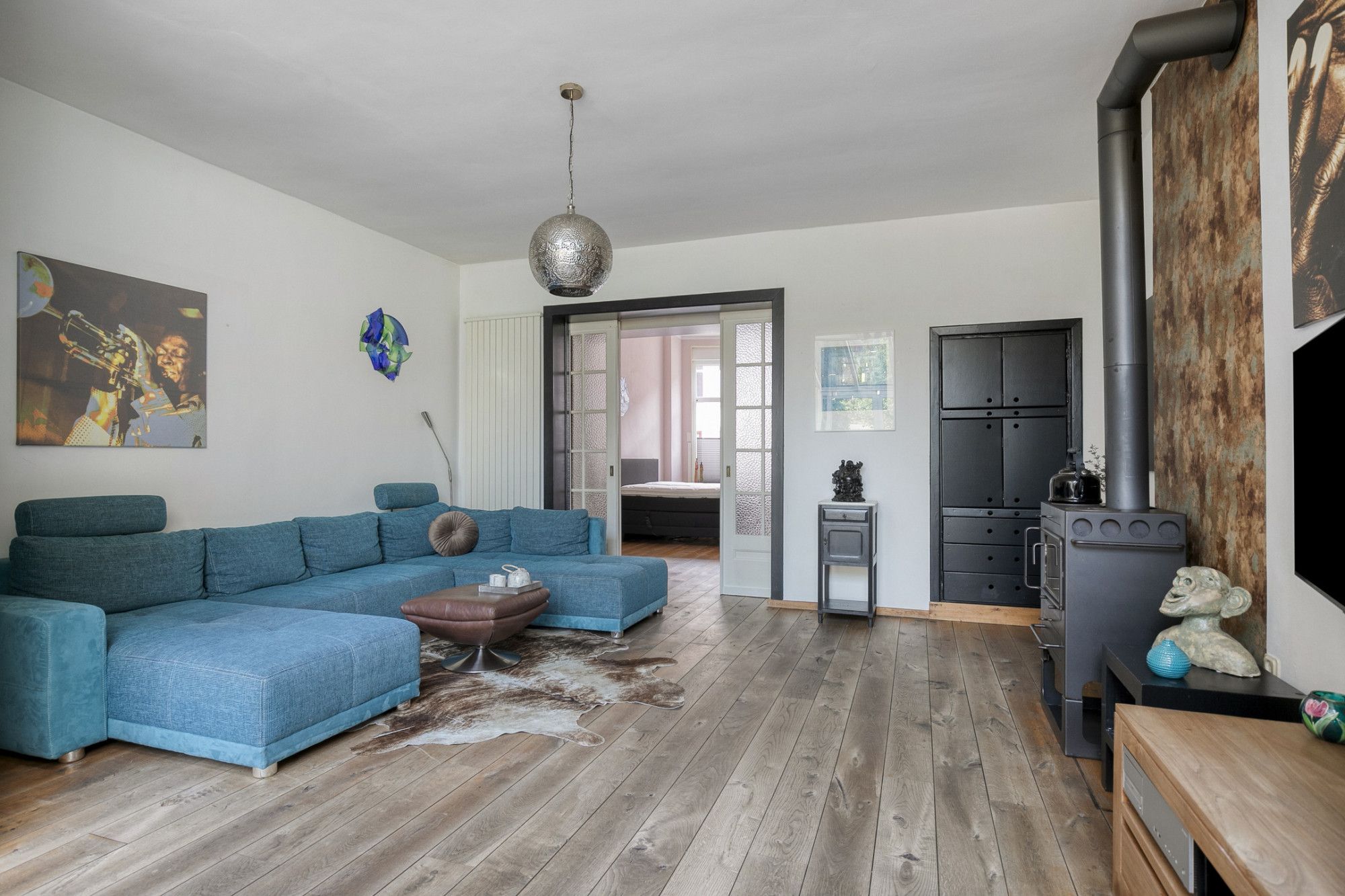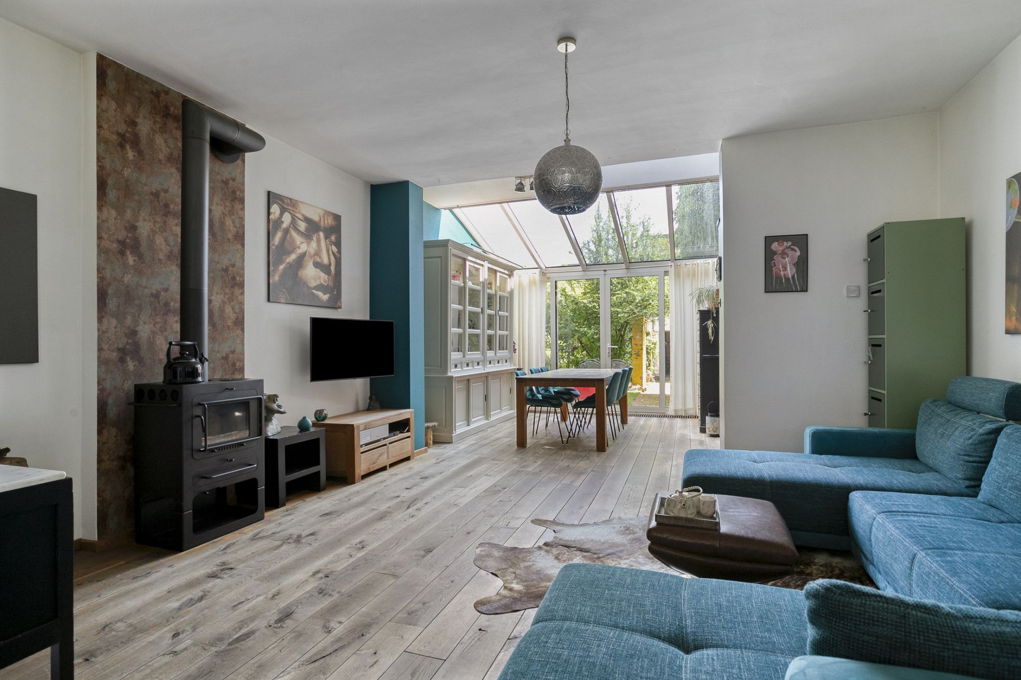 De slaapkamer ligt aan de voorzijde en heeft schuifdeuren naar de woonkamer. Deze woonkamer is afgewerkt met een houtenvloer, strak gestucte wanden en plafonds, en beschikt over een TV-aansluiting en houtkachel. Aansluitend bevindt zich de eetkamer met een glazen serre en openslaande deuren naar de tuin.