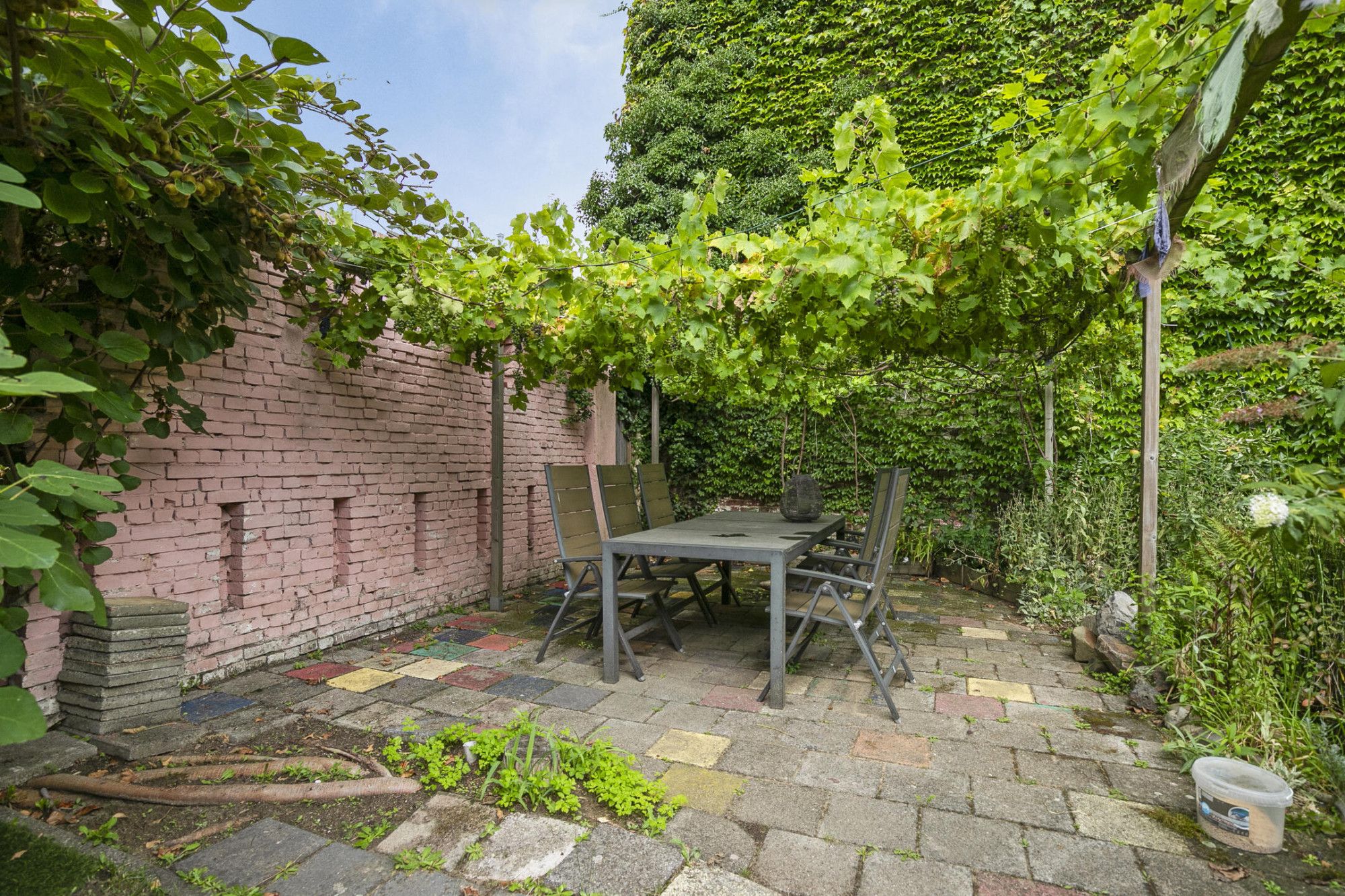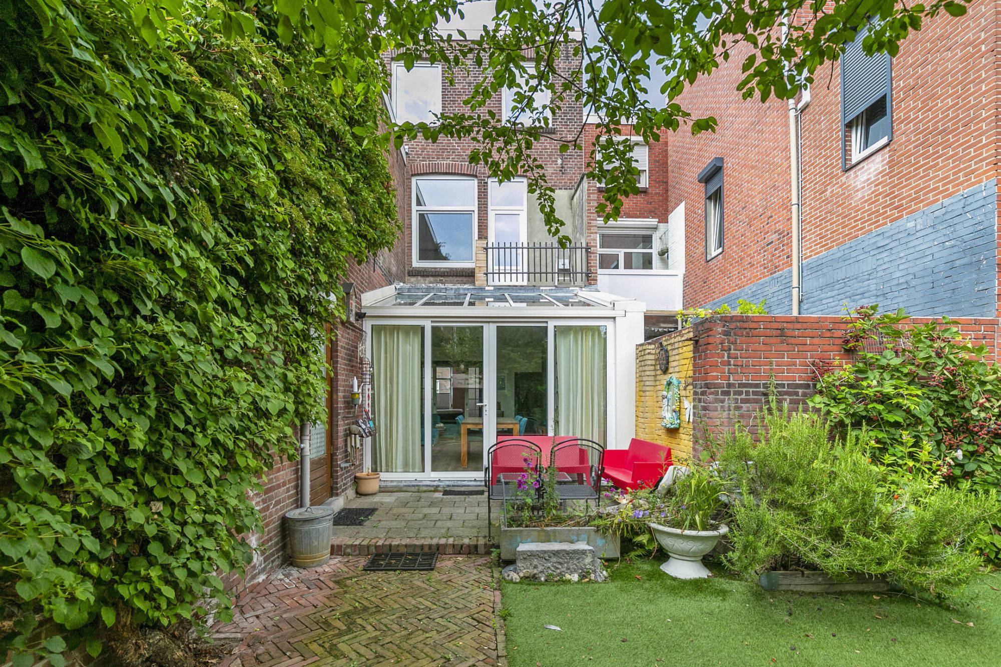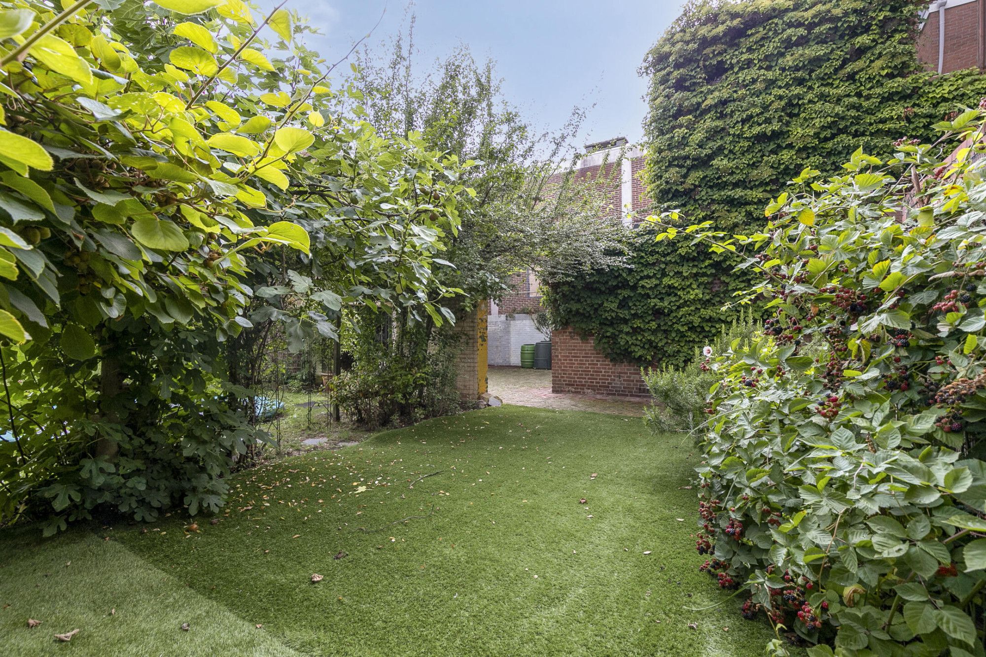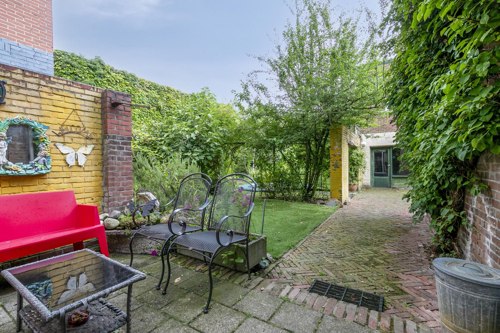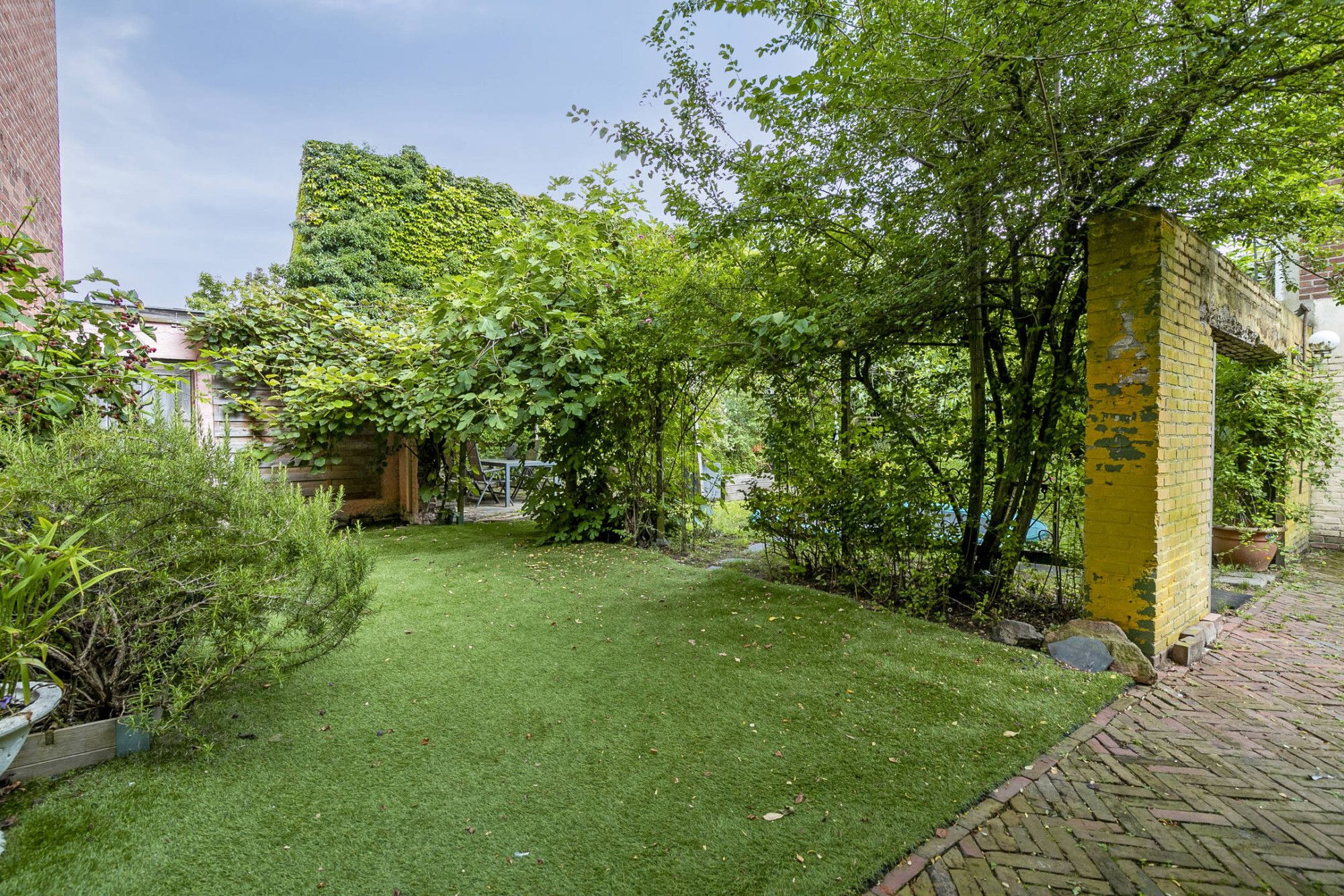 De riante achtertuin (ca. 280 m²) is toegankelijk via de openslaande deuren in de eetkamer (huisnummer 28), via de zijkant van de woning en via het tussenportaal op de begane grond (huisnummer 28). De tuin is rijk aan groen en beplanting, en beschikt over een ruime schuur (ca. 25 m²).