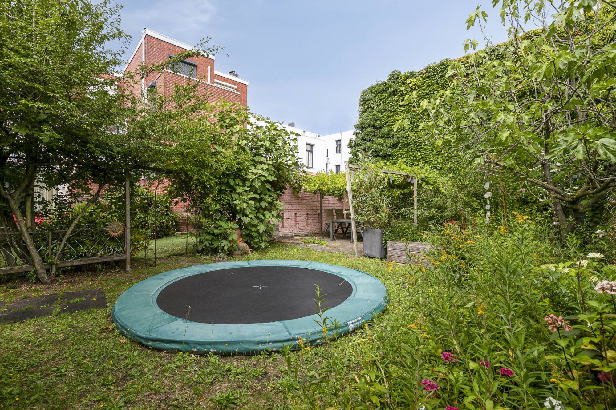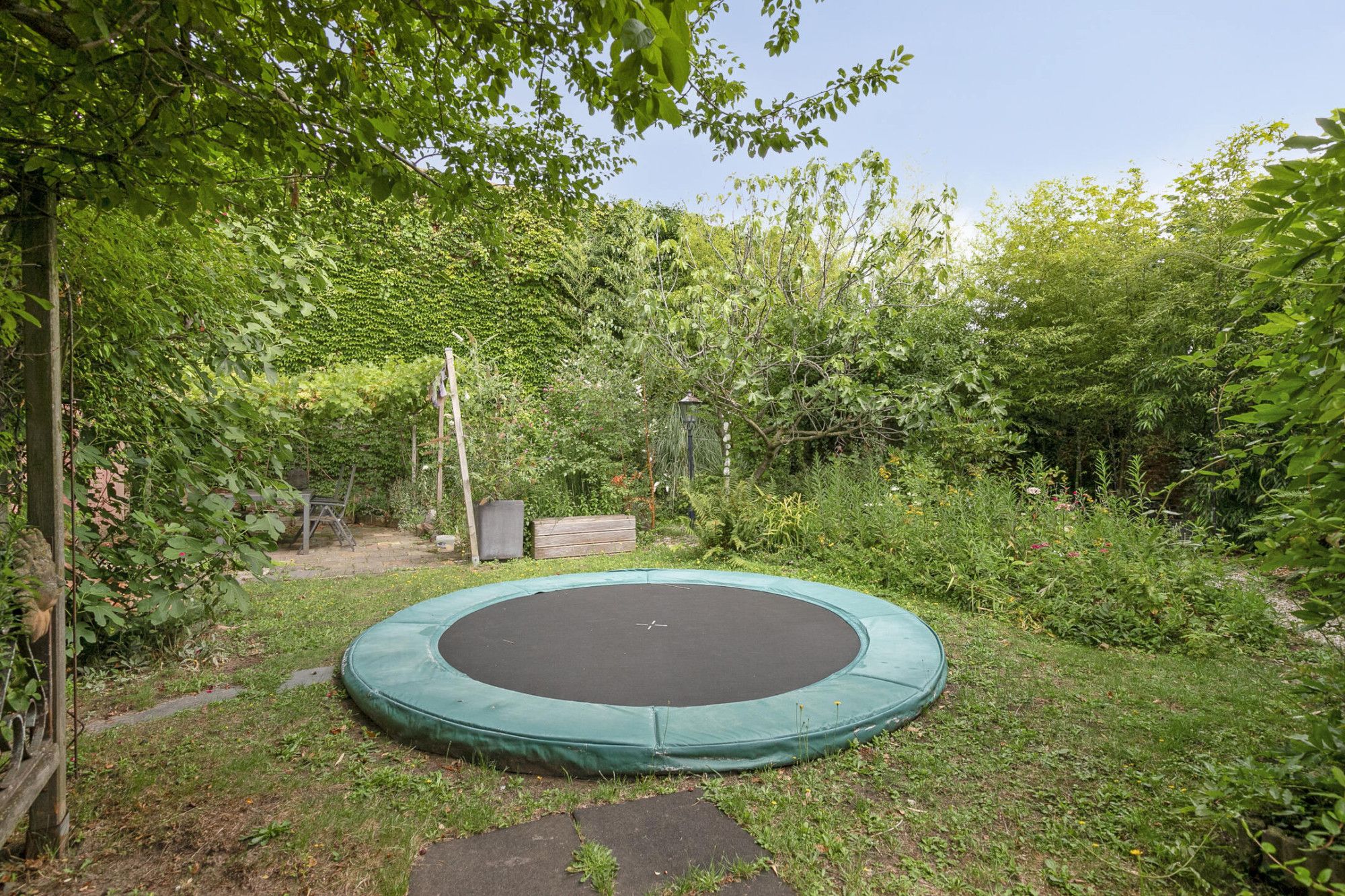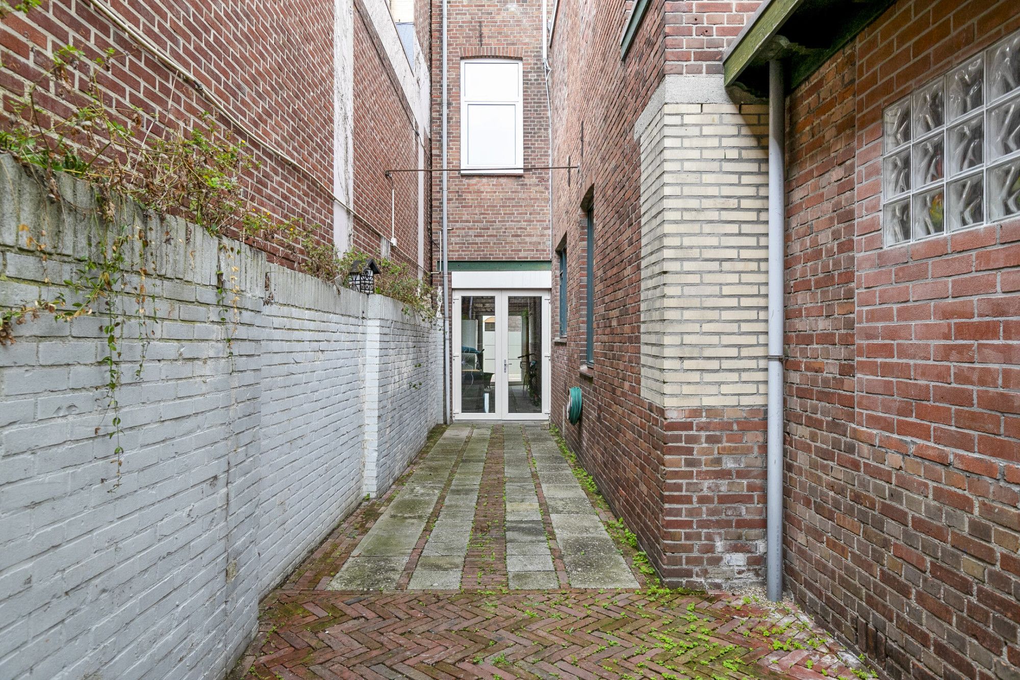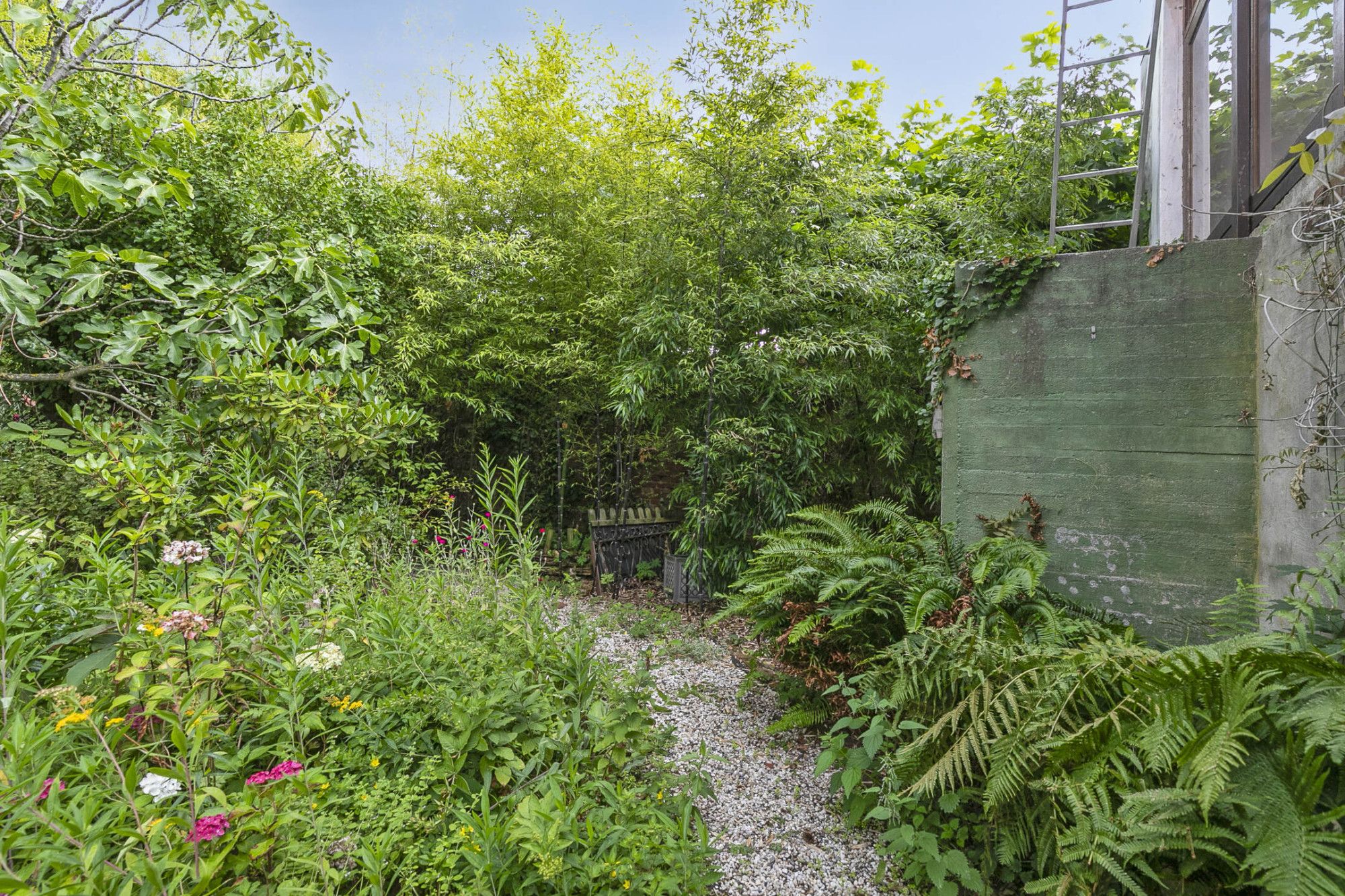 De riante achtertuin (ca. 280 m²) is toegankelijk via de openslaande deuren in de eetkamer (huisnummer 28), via de zijkant van de woning en via het tussenportaal op de begane grond (huisnummer 28). De tuin is rijk aan groen en beplanting, en beschikt over een ruime schuur (ca. 25 m²).