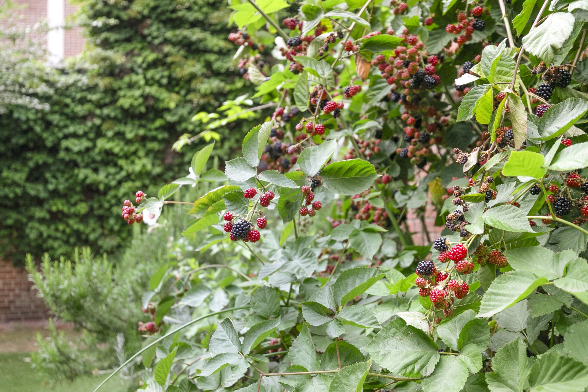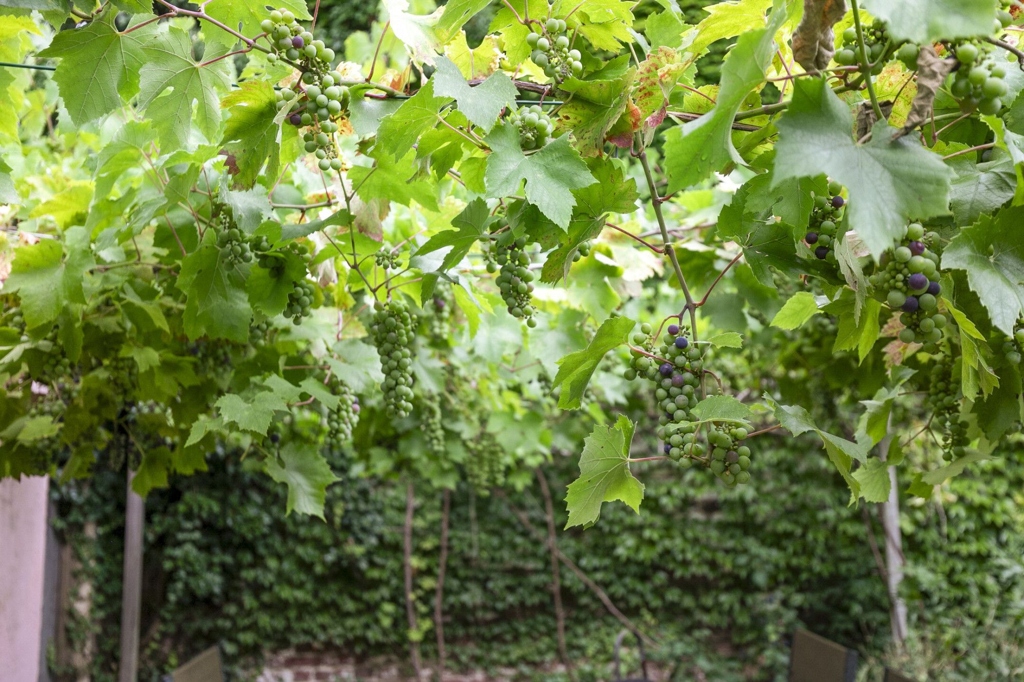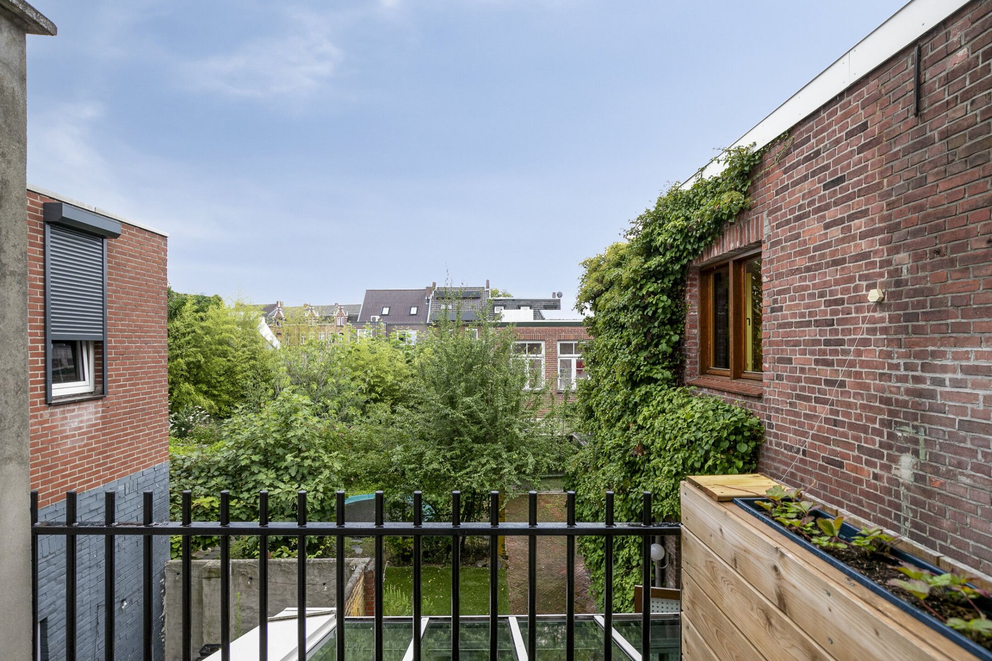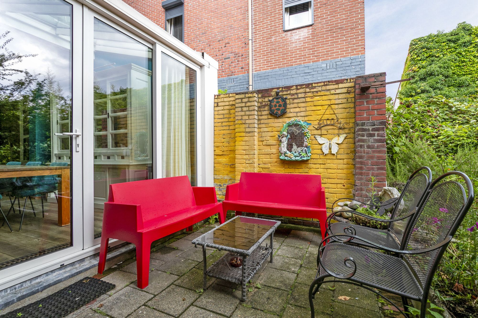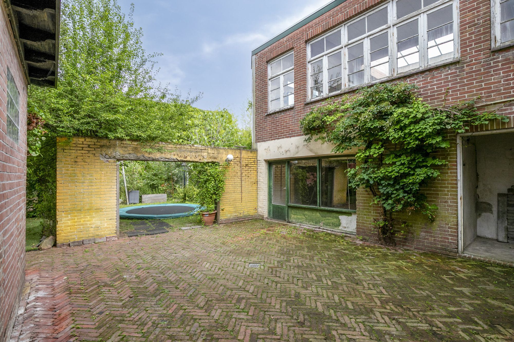 De riante achtertuin (ca. 280 m²) is toegankelijk via de openslaande deuren in de eetkamer (huisnummer 28), via de zijkant van de woning en via het tussenportaal op de begane grond (huisnummer 28). De tuin is rijk aan groen en beplanting, en beschikt over een ruime schuur (ca. 25 m²).