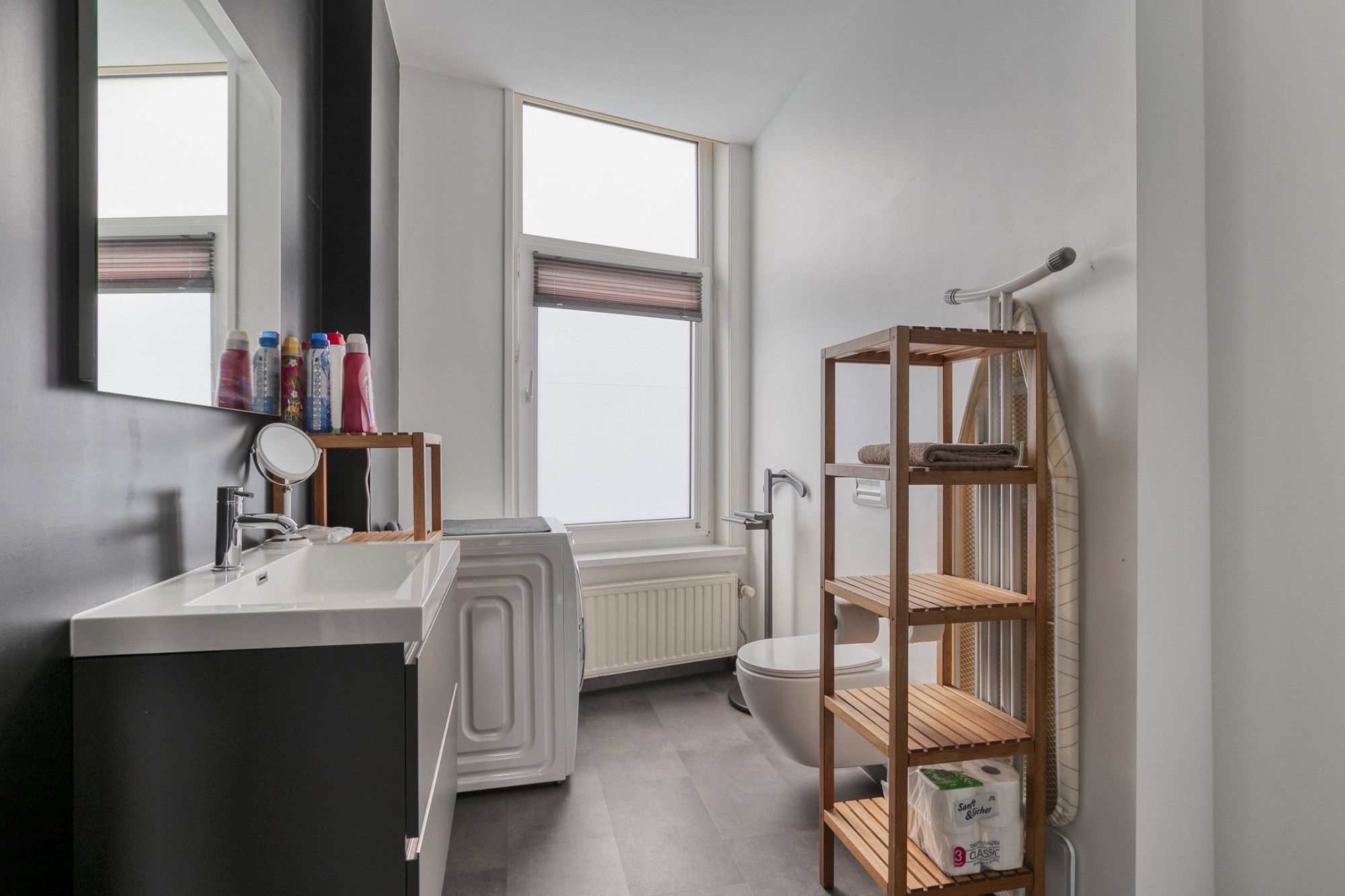 Via de entree aan huisnummer 30 bereikt u de tweede wooneenheid. De overloop geeft toegang tot de keuken met balkon (ca. 7 m²), de badkamer (ca. 8 m²) en de woonkamer (ca. 28 m²) met lichtgrijze laminaatvloer, kachel en TV-aansluiting.