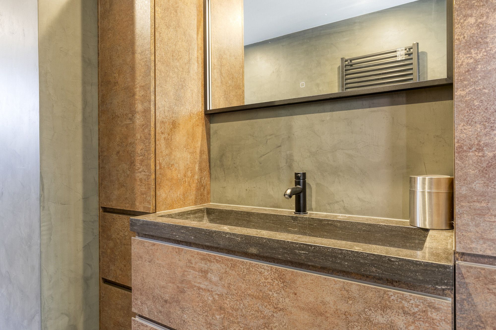 De keuken is eenvoudig uitgevoerd met keukenblok, kooktoestel, koelkast en vriezer. De badkamer beschikt over een douchecabine, wastafelmeubel, zwevend toilet en wasmachineaansluiting.
