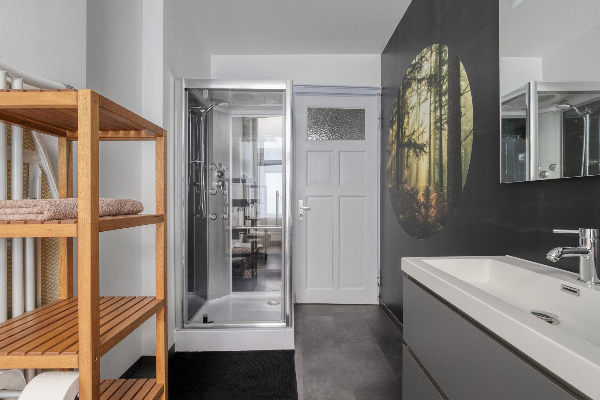 Via de trap op de eerste verdieping bereikt u de derde wooneenheid. Hier vindt u een keuken (ca. 8 m²) met 4-pits gasfornuis, combi-oven en spoelbak, een ruime woonkamer (ca. 32 m²) met laminaatvloer en airconditioning, en drie slaapkamers (ca. 12 m², 8 m² en 8 m²). Twee slaapkamers hebben dezelfde laminaatvloer als de woonkamer; de derde heeft een lichtere tint. Vanuit één slaapkamer is er toegang tot het platte dak. De badkamer (ca. 7 m²) is voorzien van moderne sanitaire voorzieningen.