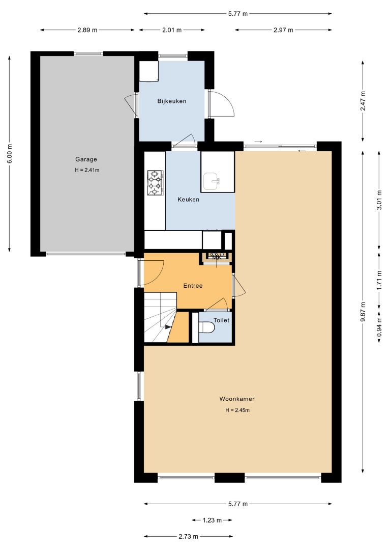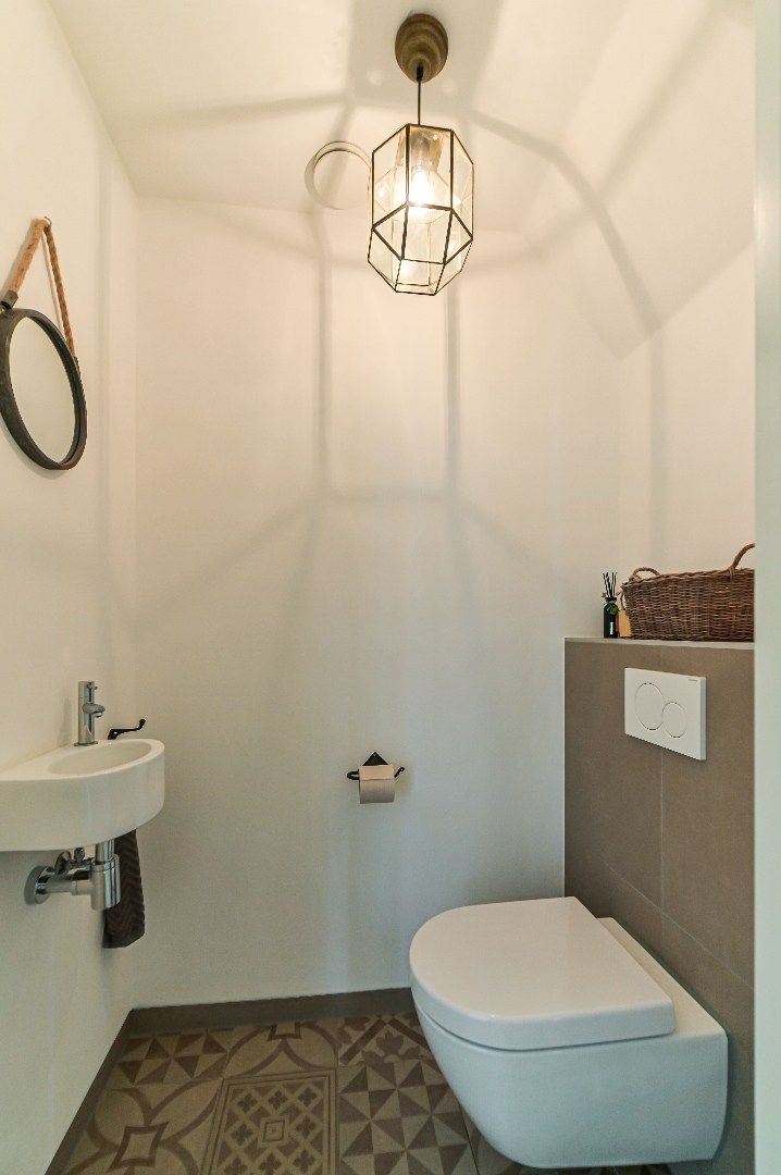 Begane grond: In de hal bevinden zich het modern toilet, de meterkast en de trap naar de 1e verdieping. De eikenhouten lamelparketvloer (geschikt voor vloerverwarming) loopt naadloos door in de royale U-vormige woonruimte (ca. 50m2). Grote raampartijen brengen veel daglicht binnen en de openslaande tuindeuren creëren een directe verbinding met de tuin.