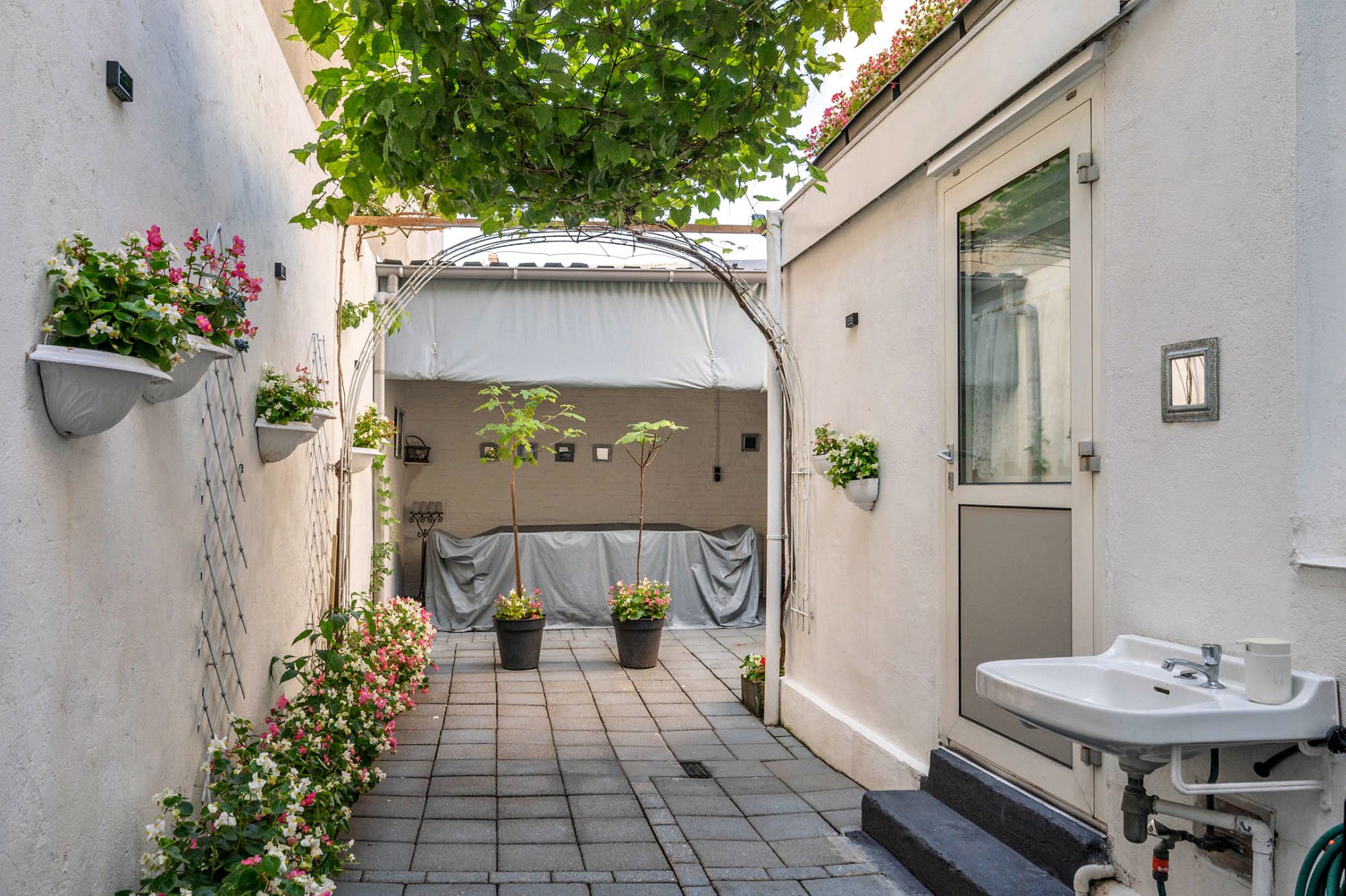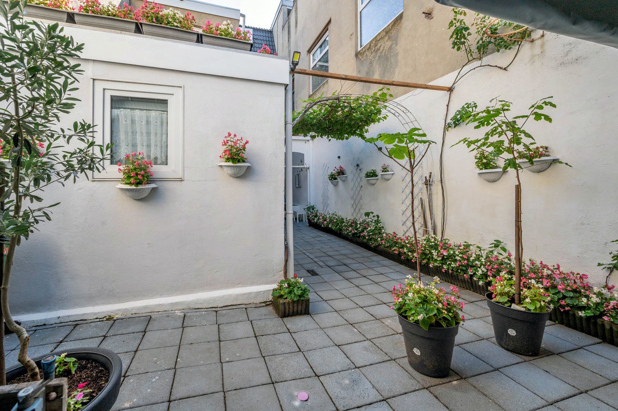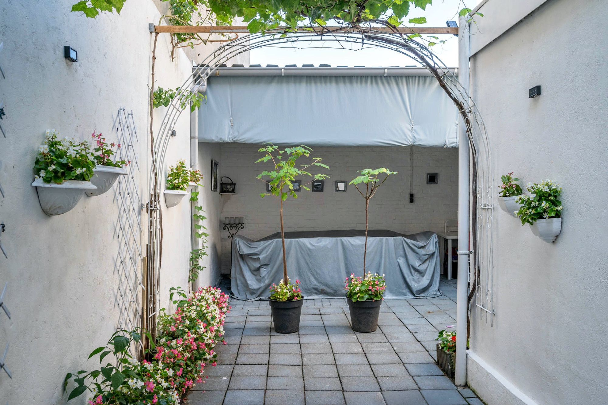 De tuin is onderhoudsvrij, geheel betegeld en voorzien van een overkapping aan de achtergevel en een terras met overkapping in de achtertuin.