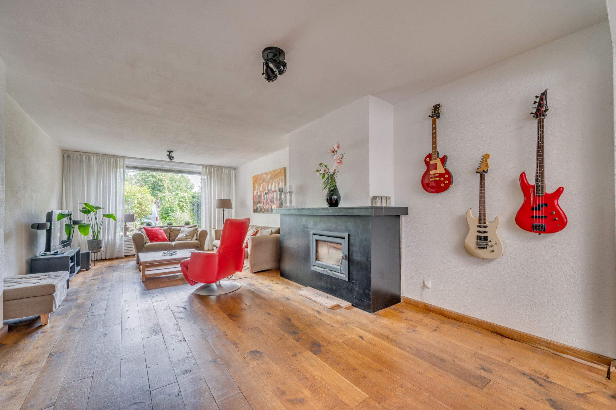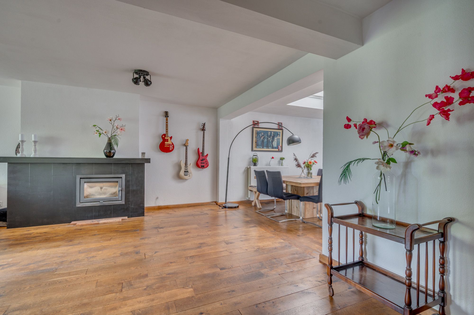 Vanuit de voortuin is de entree van de woning te bereiken. De entree/ hal met garderobe, geeft toegang tot de separate toiletruimte, meterkast, trapopgang naar de 1e verdieping en loopdeur naar de woonkamer. De toiletruimte is geheel betegeld en voorzien van een zwevend toilet. Middels een loopdeur is de woonkamer te bereiken. De zithoek met houtkachel is aan de voorzijde gelegen. Aan de achterzijde is de zithoek met keuken geplaatst. Door de ruime aanbouw is de woonkamer met aansluitend de eetkamer ca. 60m² groot. De keuken is naast de eetkamer gelegen en beschikt over een inductiekookplaat, afzuigkap, vaatwasmachine, combioven/ magnetron, koelkast en zeer veel opbergruimte. Tevens is er een loopdeur naar de bijkeuken. De gehele begane grond met uitzondering van de keuken is voorzien van een houten plankenvloer. Middels twee schuifpuien is de achtertuin te bereiken.