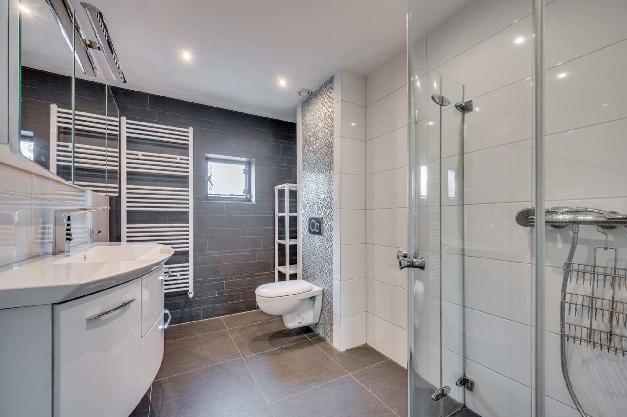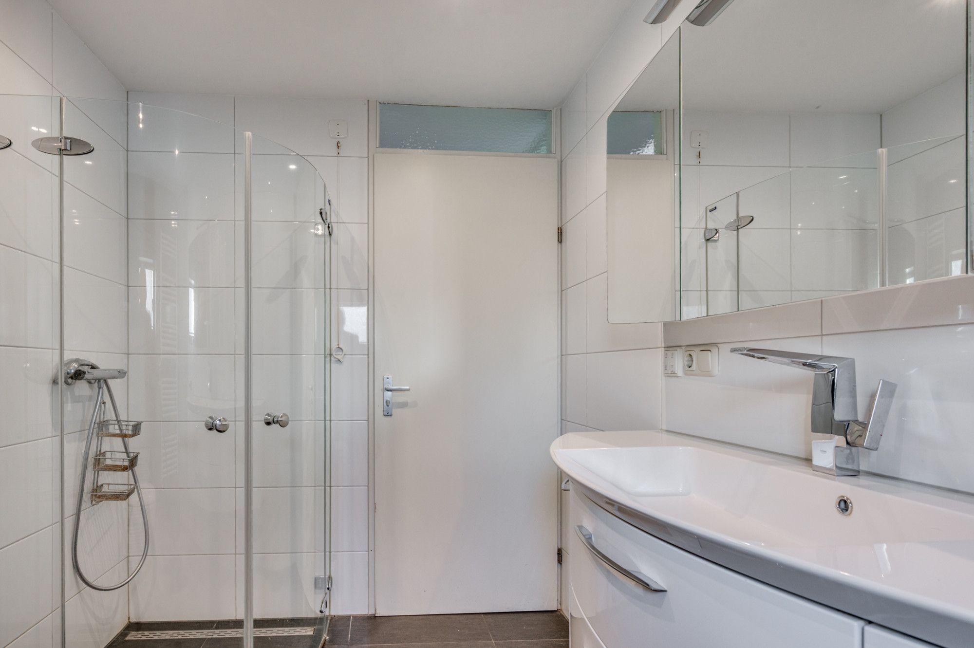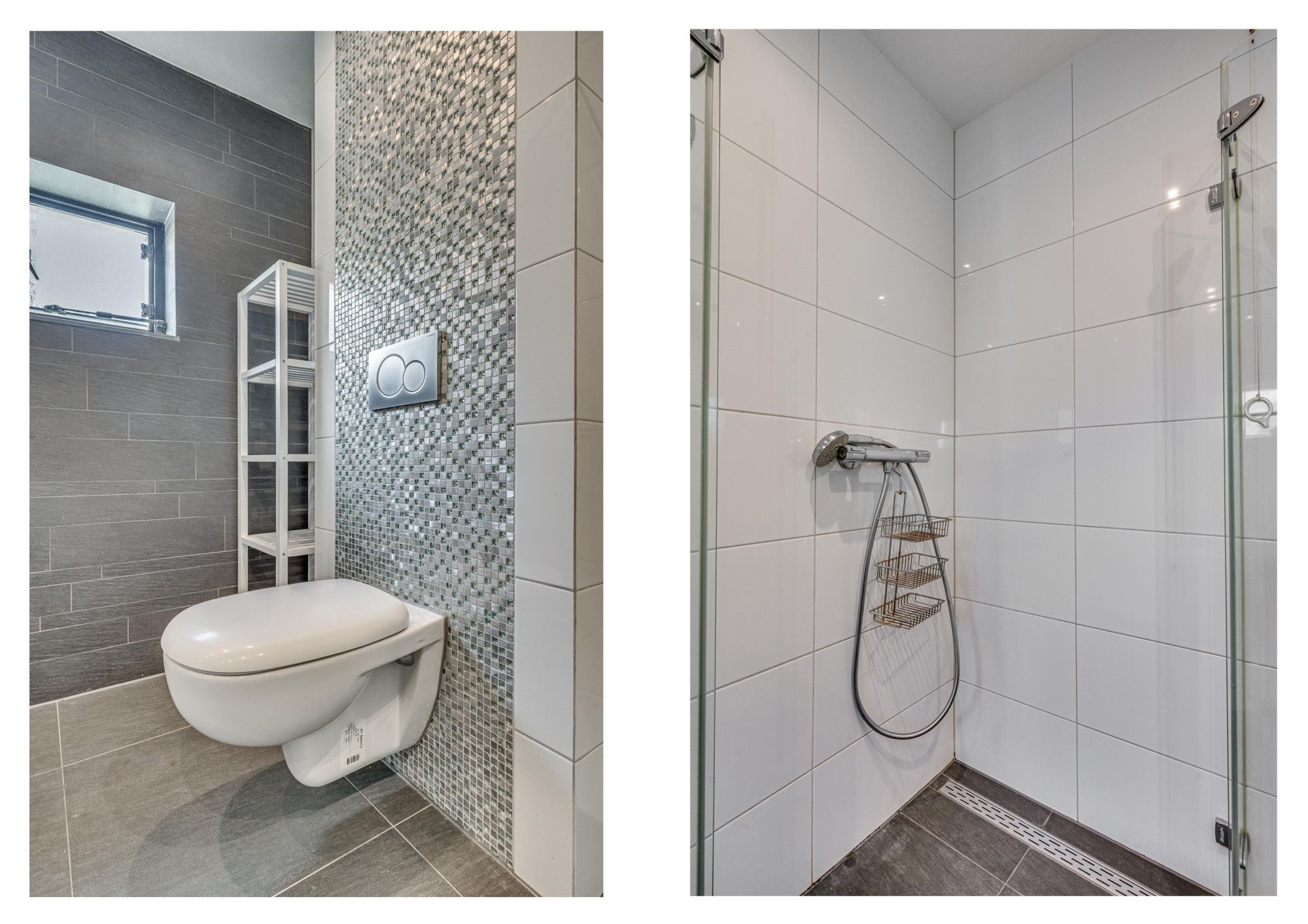 De overloop geeft toegang tot 3 zeer ruime slaapkamers, de badkamer en de vaste trapopgang naar de 2e verdieping. De slaapkamers zijn ca. 8m², 13,5m² en 15m² groot. De slaapkamers en de hal zijn voorzien van eenzelfde laminaatvloer en rolluiken. De badkamer is ca. 6m² groot en geheel betegeld. De badkamer is voorzien van een inloopdouche, zwevend toilet, wastafel met meubel, designradiator, buitenraam en mechanische ventilatie.