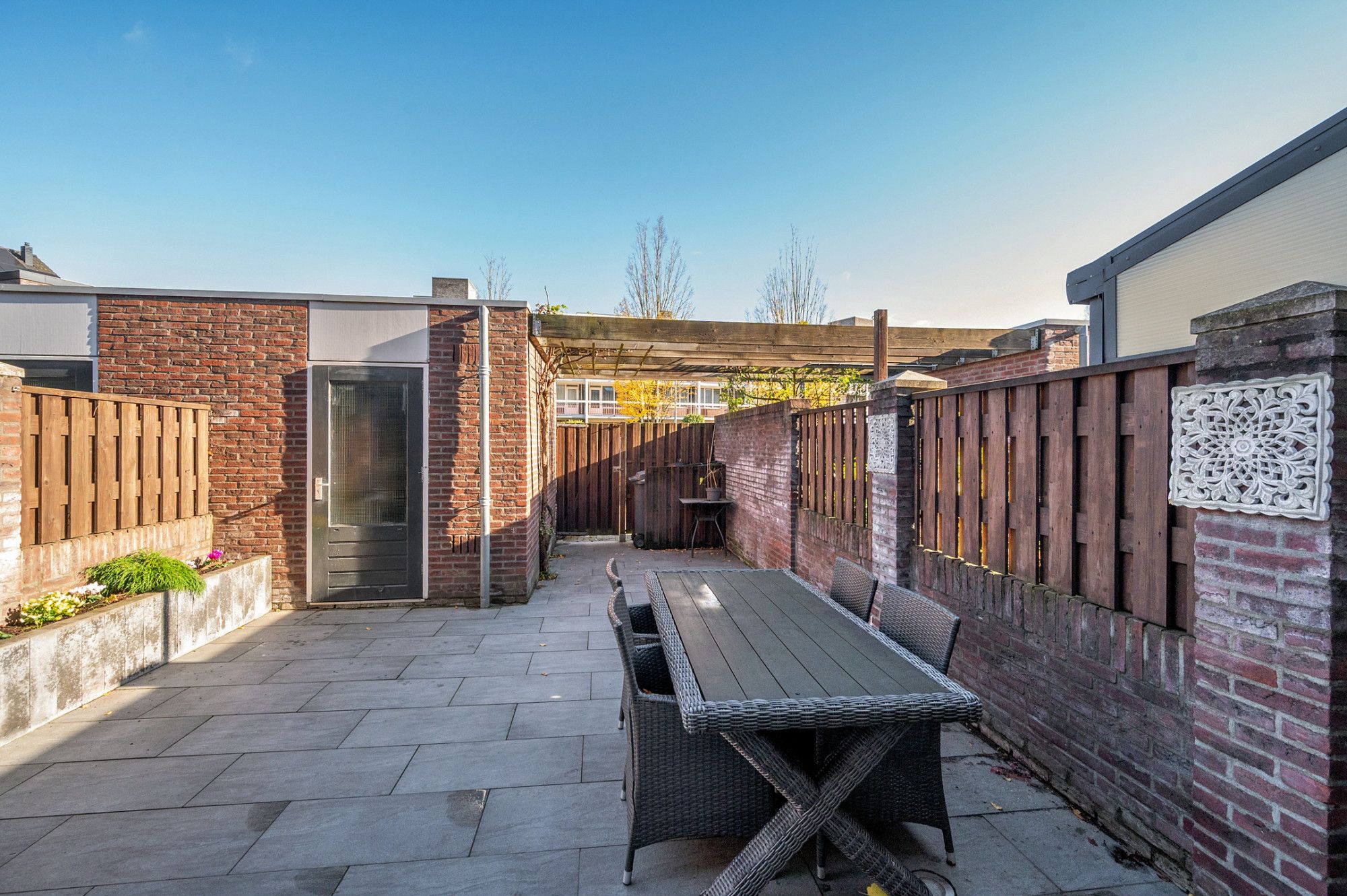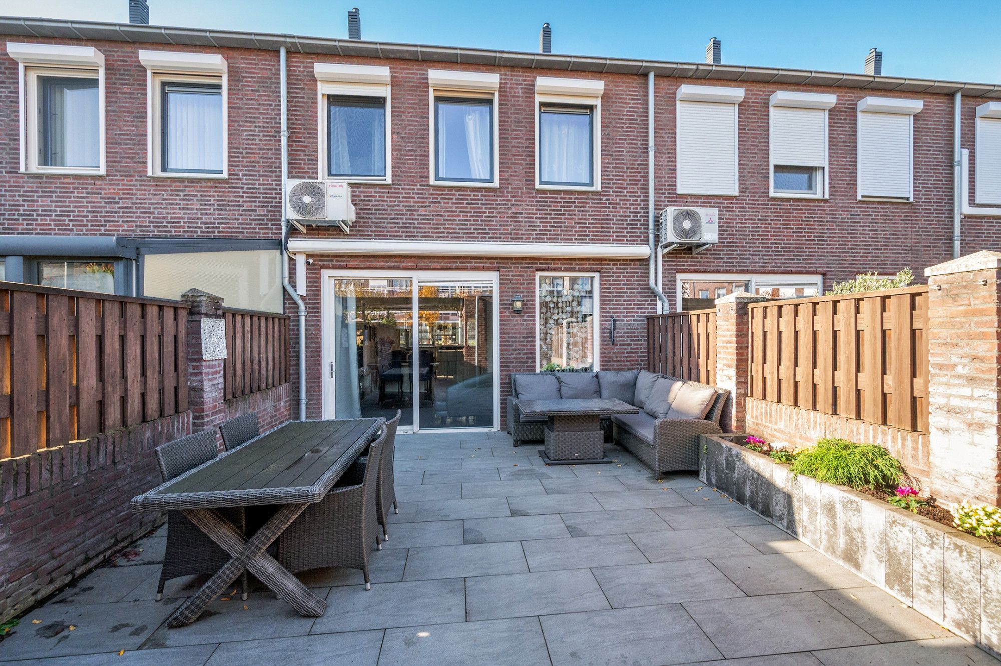 De onderhoudsvrije achtertuin is nagenoeg geheel betegeld en voorzien van een border met beplanting. In de tuin bevindt zich een stenen berging. Verder is er aan de achterkant van de woning een groot zonnescherm aanwezig. De tuin is gelegen op het noordoosten en is te bereiken middels een vrije achterom.