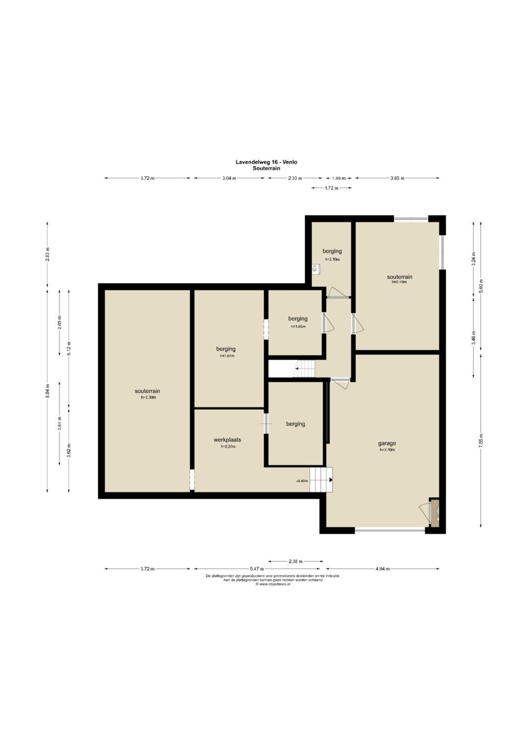 De woning is nagenoeg geheel onderkelderd en middels de bijkeuken of de inpandige garage te bereiken. Het souterrain is voorzien van 8 compartimenten. In de garage is het mogelijk om een auto te plaatsen. Verder beschikt het souterrain over meerdere bergingen, werkplaats etc.