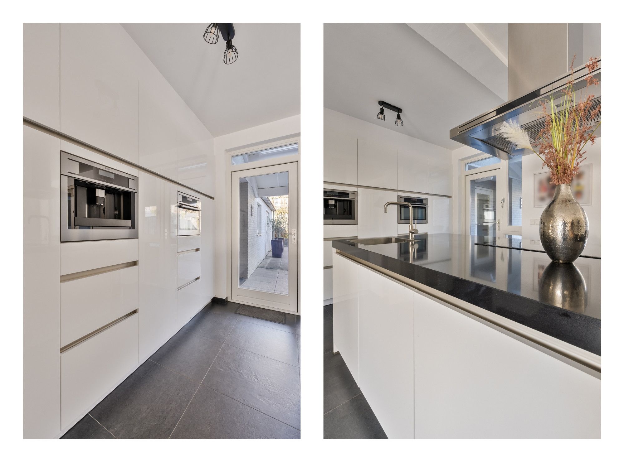 De moderne keuken is voorzien van een stijlvol kookeiland, een natuurstenen werkblad, veel bergruimte en diverse inbouwapparatuur zoals een vaatwasser, koelkast, diepvries, combi-oven, inbouw koffiemachine, inductiekookplaat en afzuigkap.