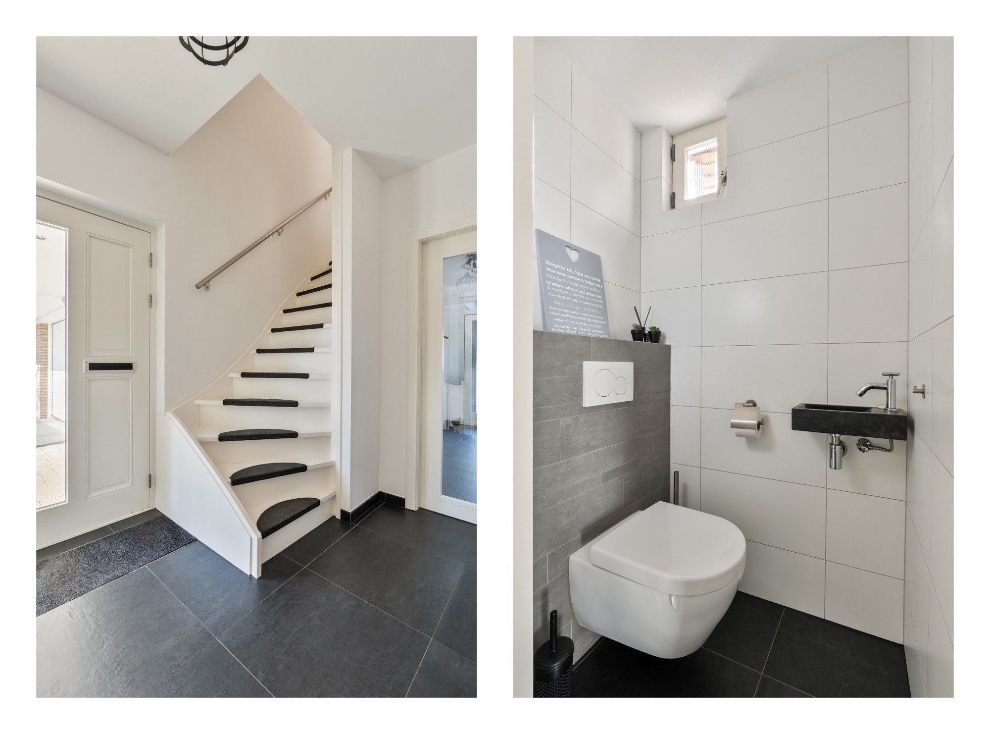 Via de entree komt u in de hal met modern toilet (hangend closet en fontein). De ruime en lichte woonkamer beschikt over een praktische trapkast en staat in open verbinding met de luxe keuken.