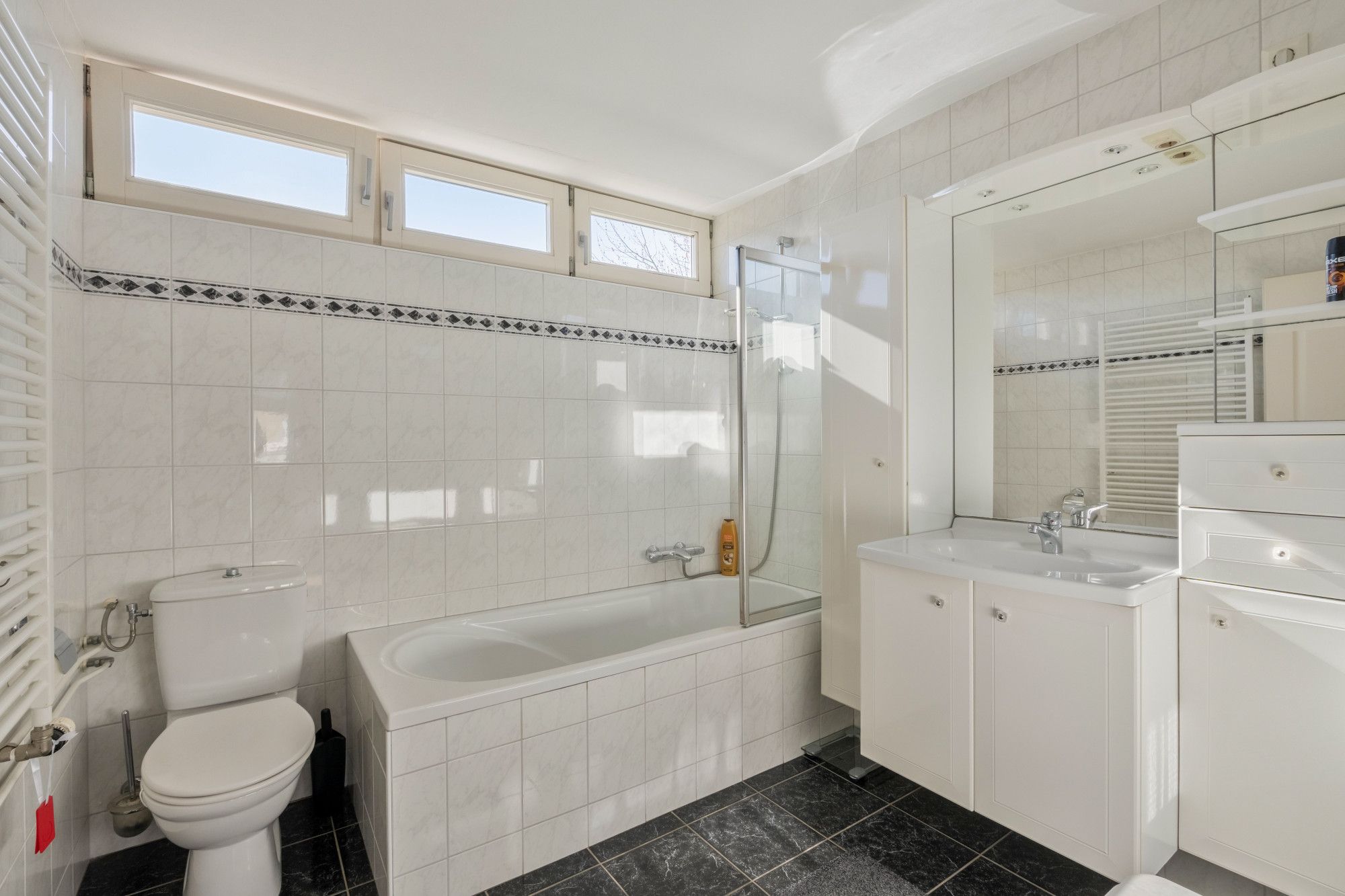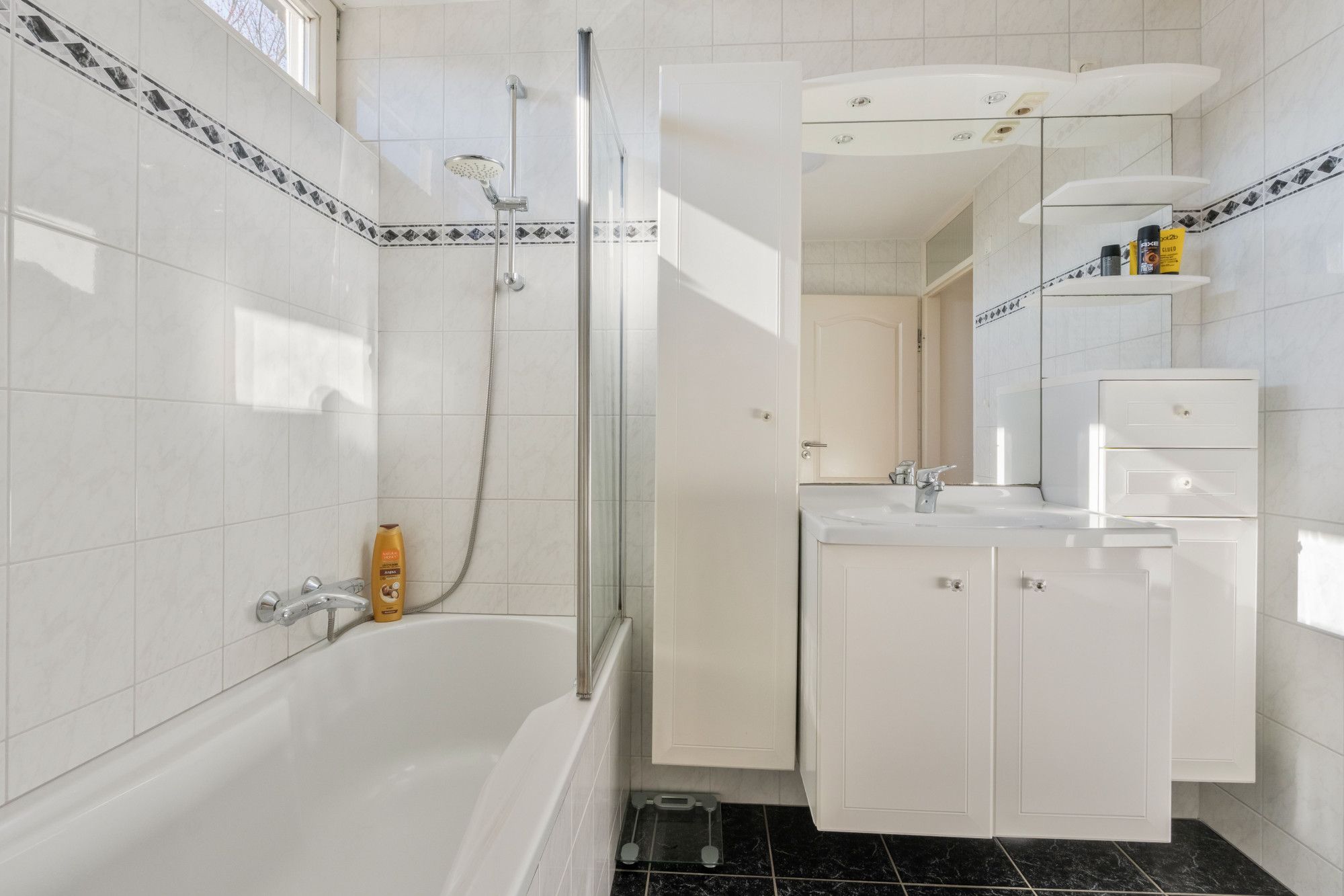 De verzorgde badkamer (ca. 6 m2) is uitgerust met een ligbad met douchecombinatie, een wastafel met meubel en een tweede toilet. De overloop en slaapkamers zijn afgewerkt met nette laminaatvloeren.