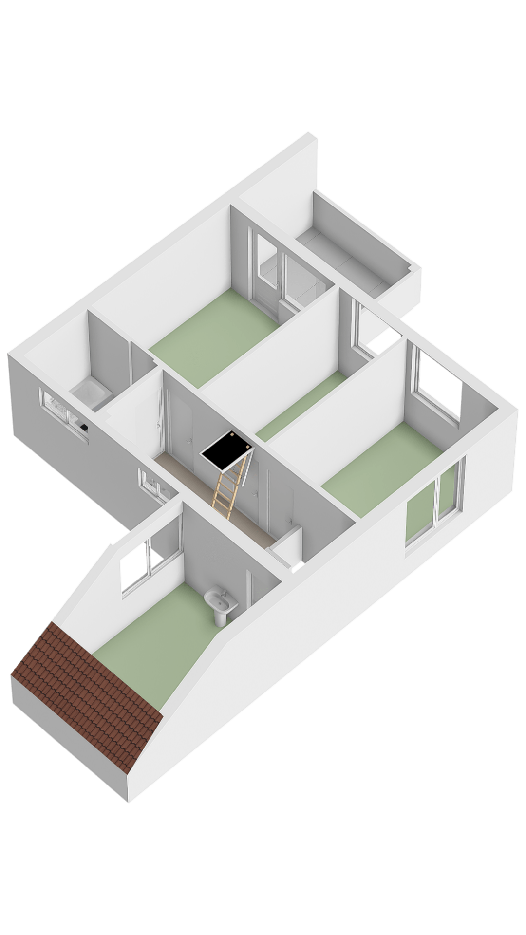 De overige drie slaapkamers variëren in formaat en indeling. Een van deze kamers beschikt over een deur naar het balkon, dat is gelegen op het noordwesten. Vanaf hier heb je uitzicht over de tuin en de groene omgeving. De kamers bieden, net als de rest van de woning, de mogelijkheid om naar eigen wens en inzicht verder te worden afgewerkt en ingericht.