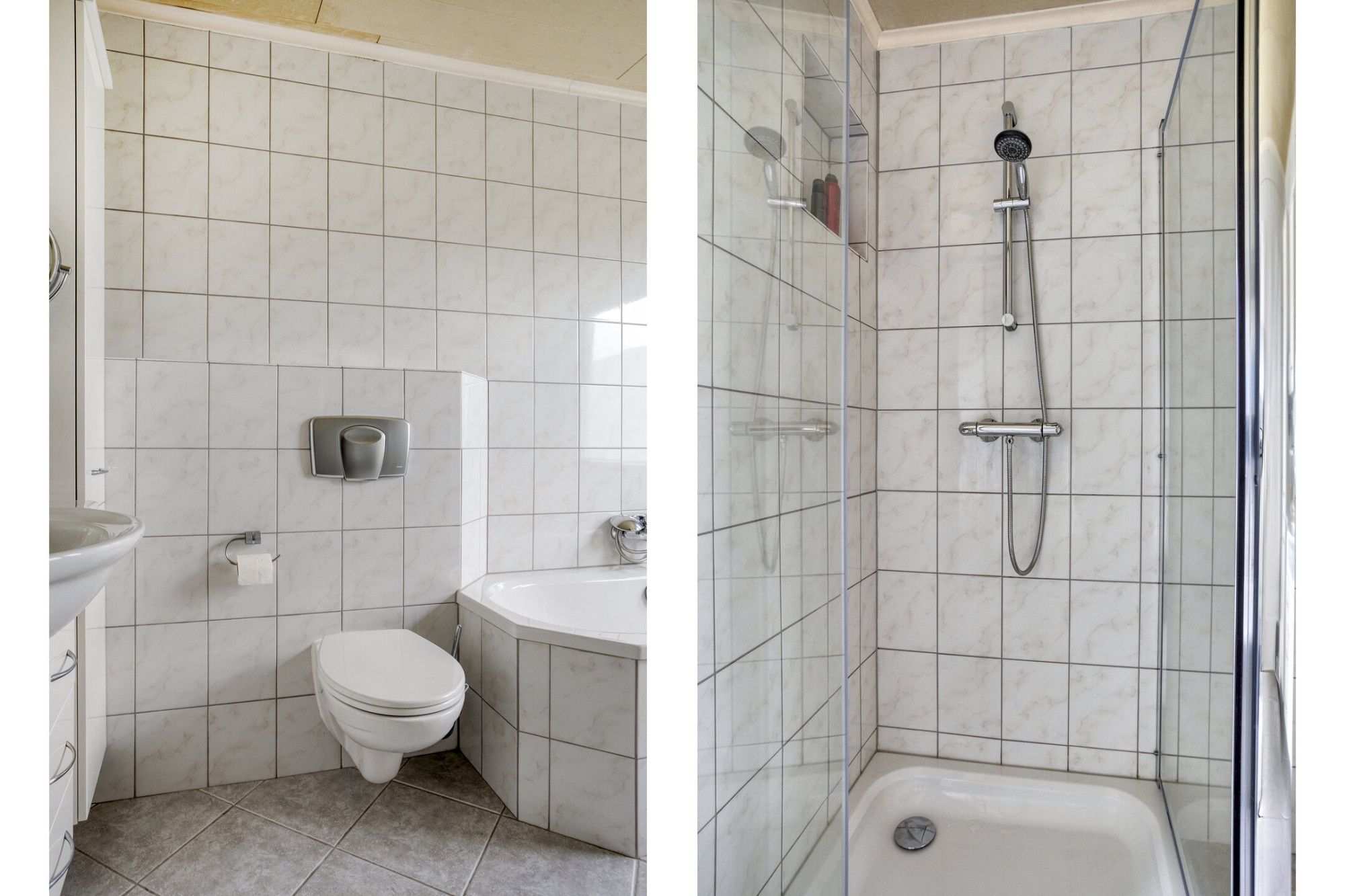 De badkamer is volledig betegeld en voorzien van een wastafel met meubel, douchecabine, ligbad, toilet en een designradiator. Vanuit de badkamer is er toegang tot een klein balkon aan de achterzijde.