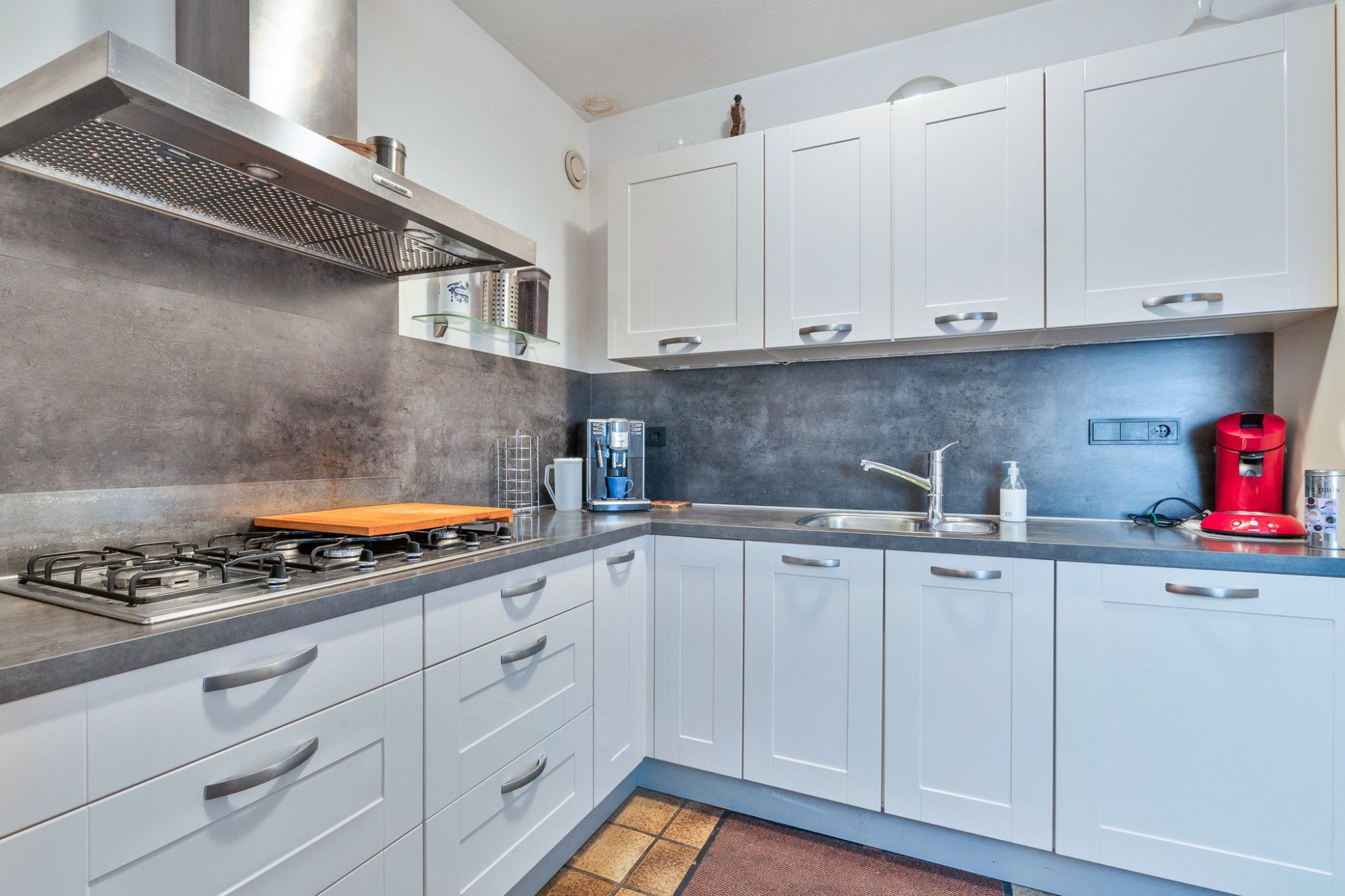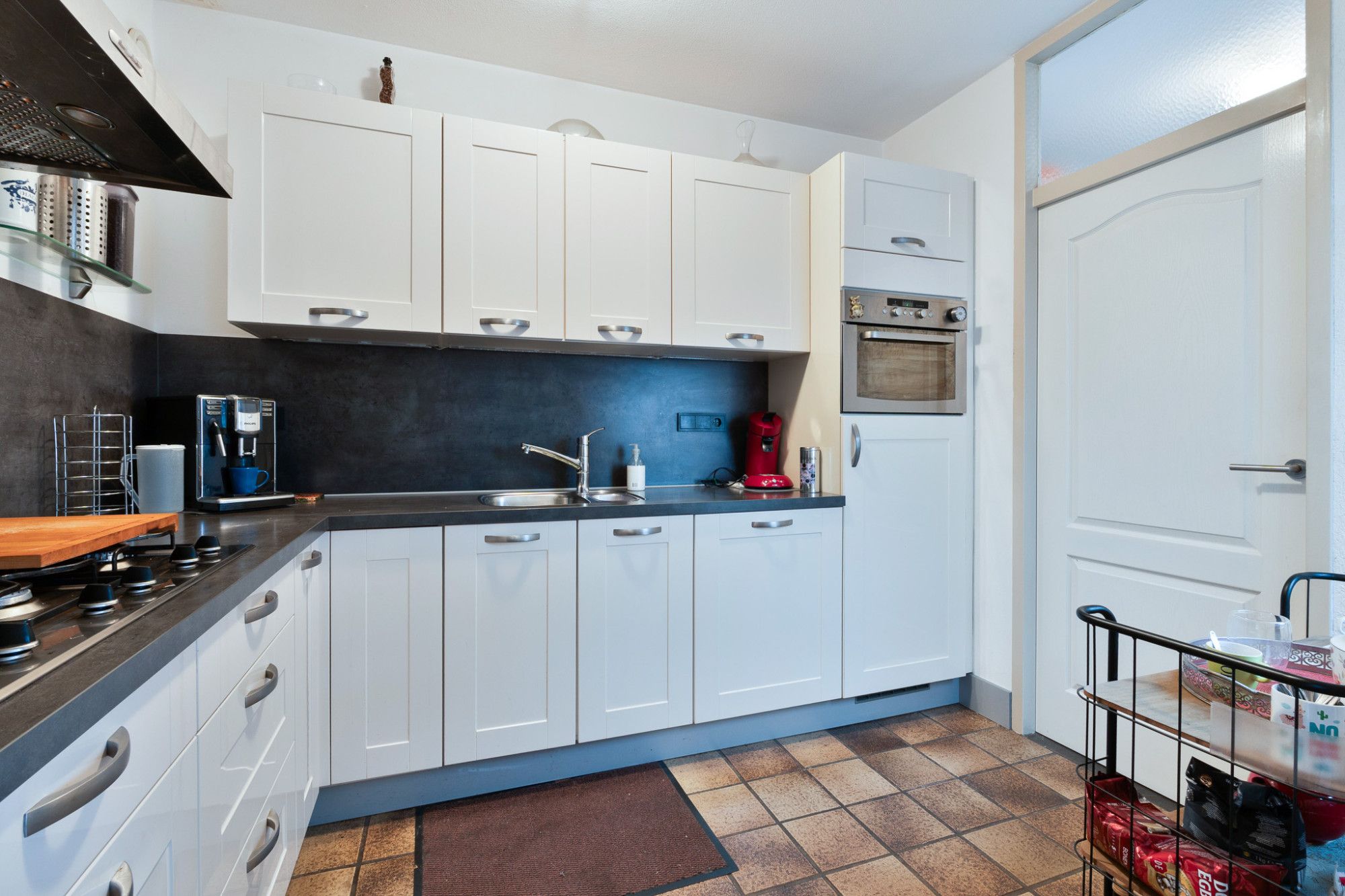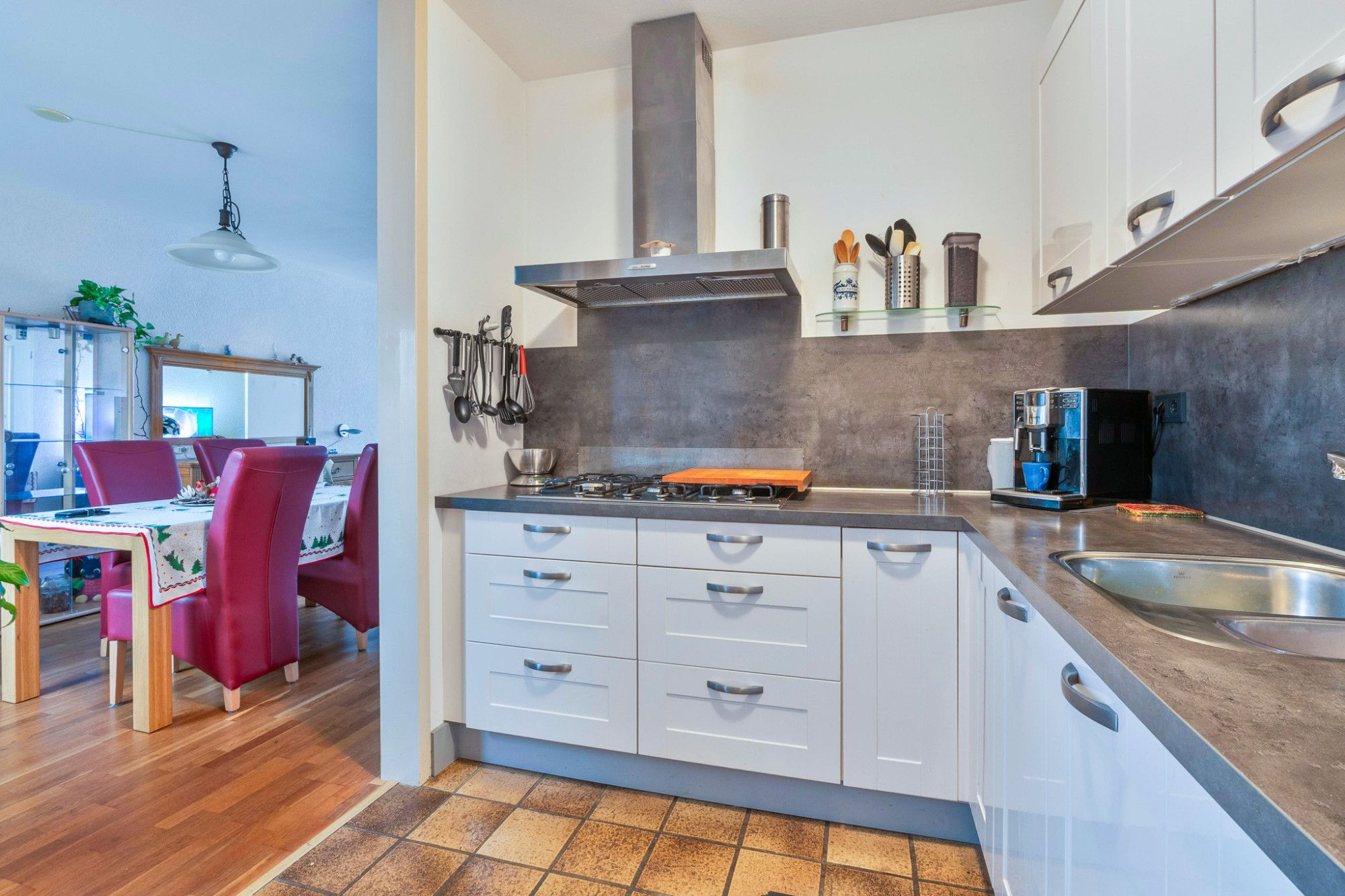Hal/entree met meterkast, toilet en trap naar de verdieping. Toegang tot de woonkamer met een keurige laminaatvloer. Aan de voorzijde zijn kunststof kozijnen geplaatst. De open keuken is aan de achterzijde gelegen en dateert van 2021 en is voorzien van een 5-pits gaskooktoestel, afzuigkap en koelkast. In de uitbouw is een praktische bijkeuken gesitueerd waar zich de witgoedaansluiting bevindt en de deur naar de achtertuin.