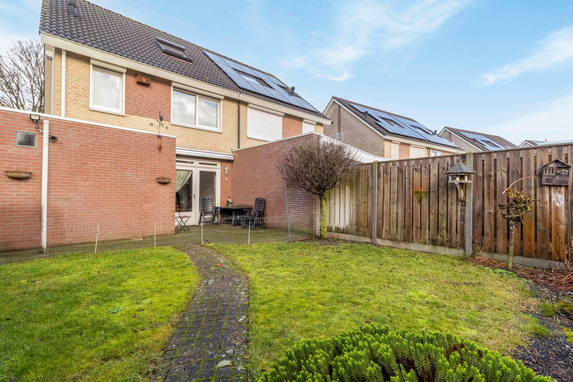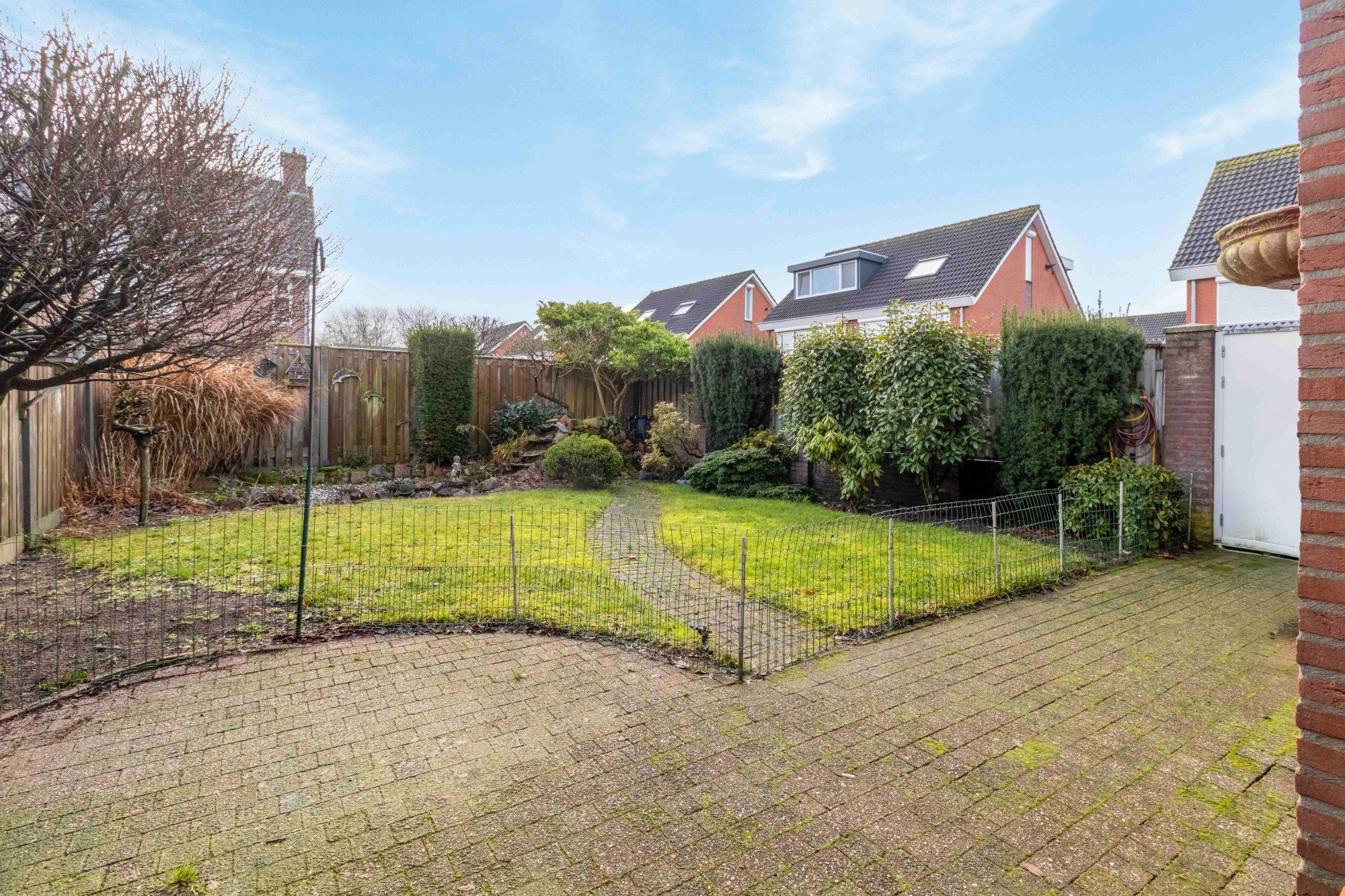 De keurige achtertuin is gelegen op het zuidoosten en is aangelegd met een terras aan huis, gazon, plantenborder en een achterom aan de zijkant van het perceel.