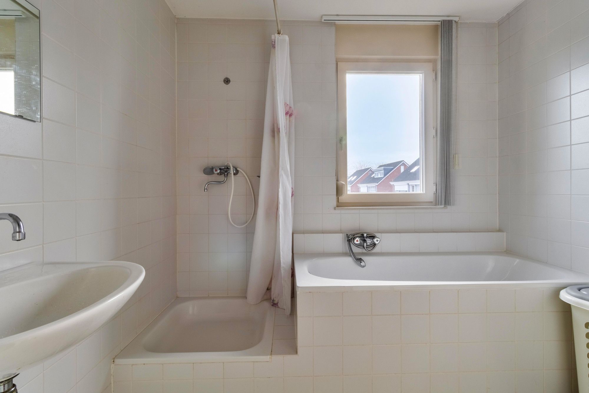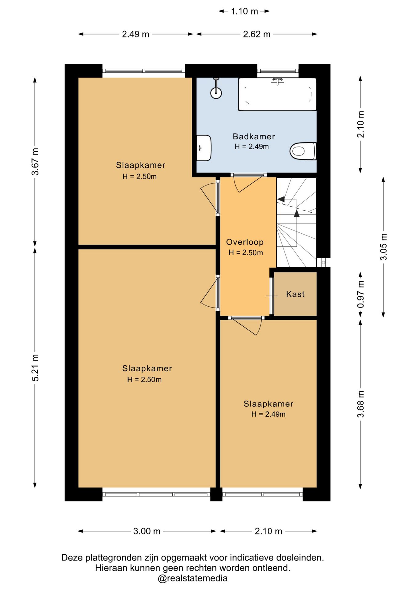 Overloop naar 3 slaapkamers en een badkamer. Op de verdieping ligt overal vloerbedekking en de kozijnen zijn voorzien van rolluiken. De badkamer is volledig betegeld en beschikt over een ligbad, douche, wastafel en 2e toilet. Op de overloop bevindt zich voorts nog een inbouwkast en de vaste trap naar de 2e verdieping.