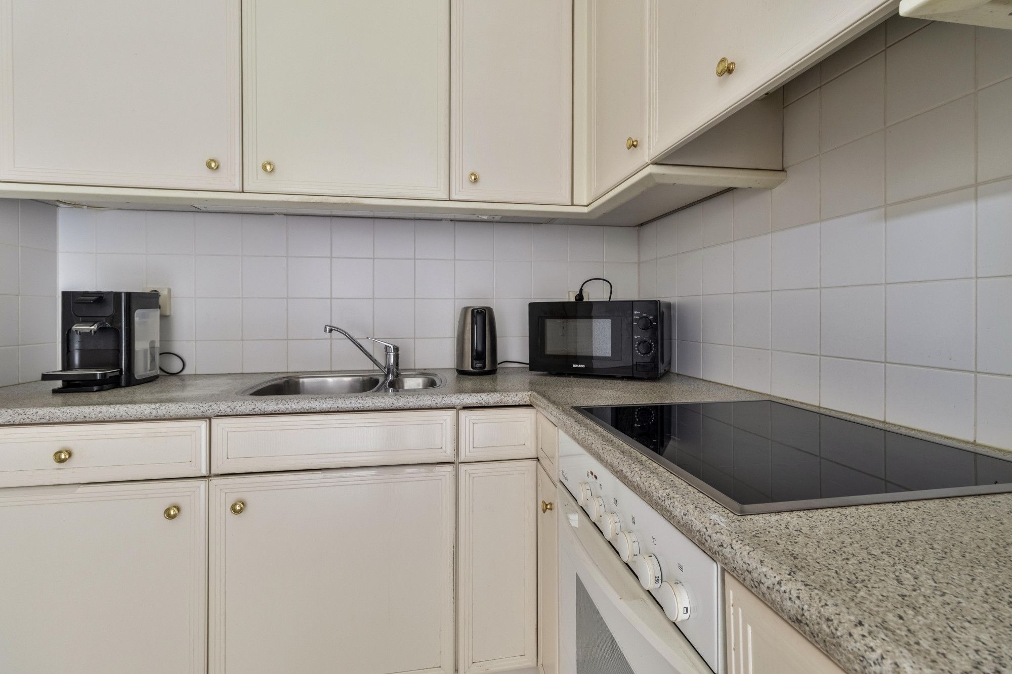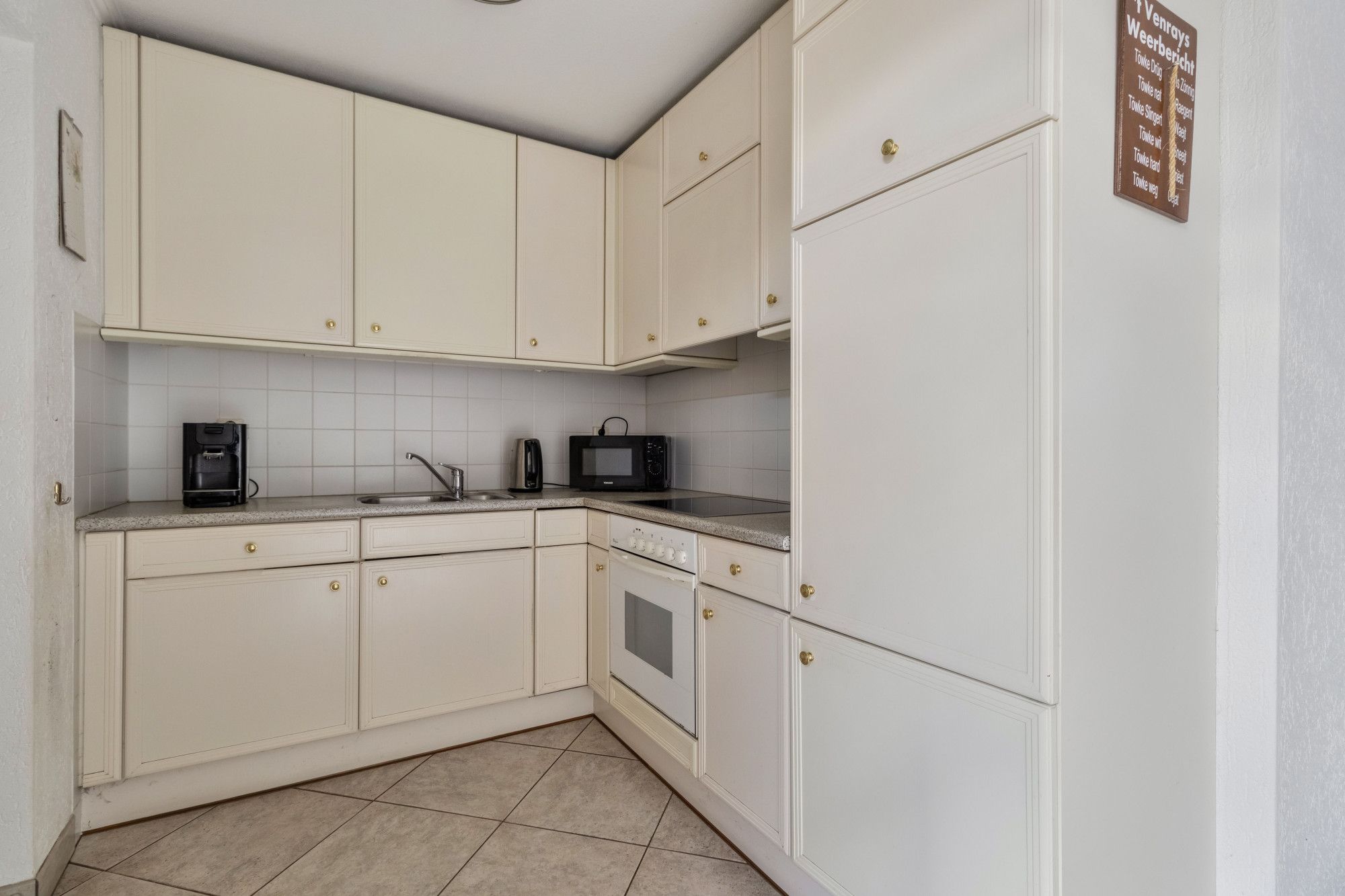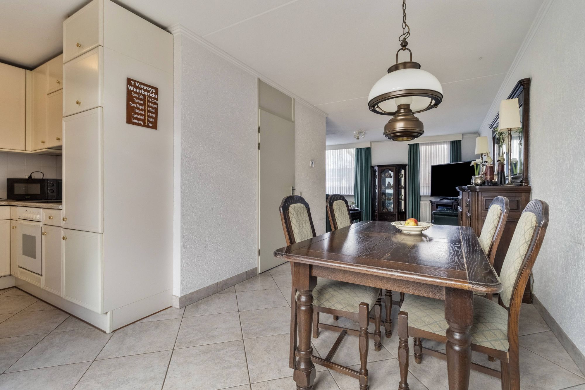 De L-vormige woonkamer heeft een goede lichtinval door de grote ramen aan de voorzijde en de openslaande tuindeuren aan de achterzijde. De keuken is gelegen aan de achterzijden en voorzien van een eenvoudige inbouwkeuken met koelkast, inductiekookplaat, afzuigkap en oven.