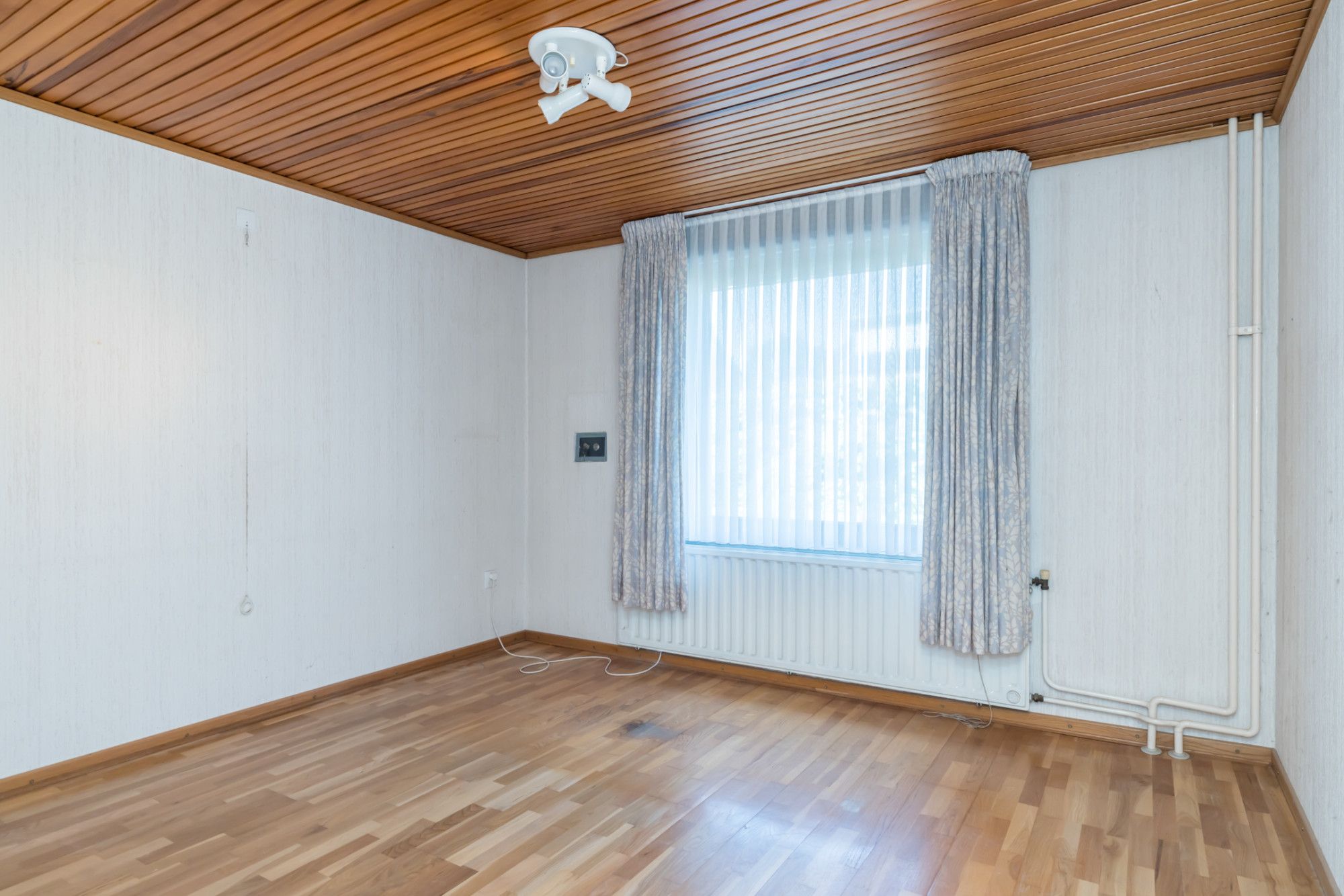 De L-vormige woonkamer is voorzien van inbouwspots en een tegelvloer. In de aanbouw is er tuincontact via twee grote ramen en een deur. Vanuit de woonkamer is er toegang tot de oprit en de keuken.