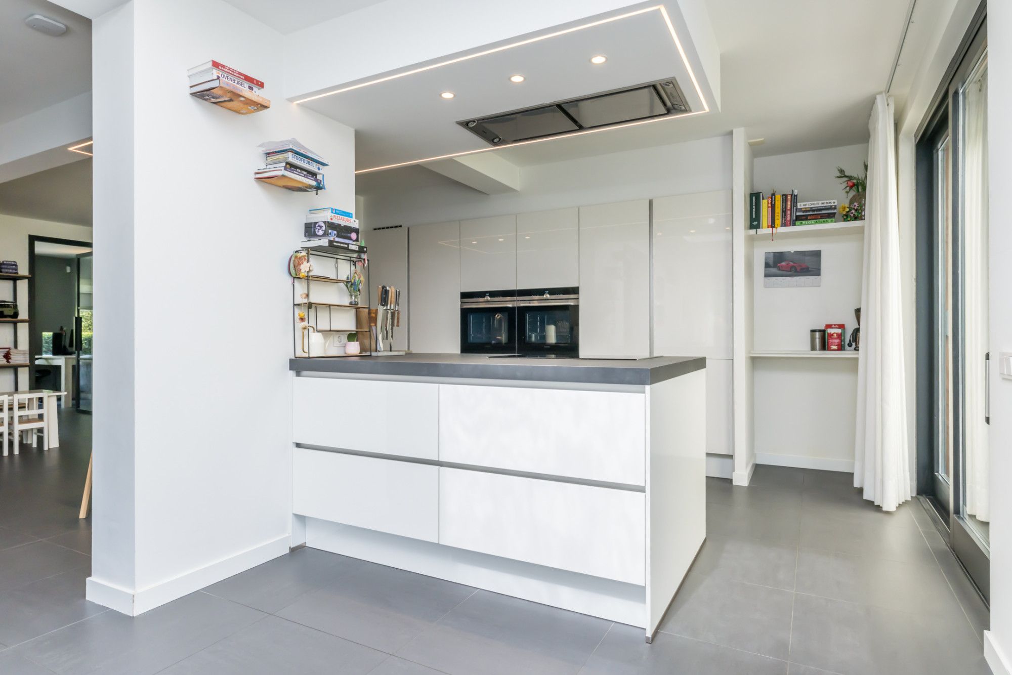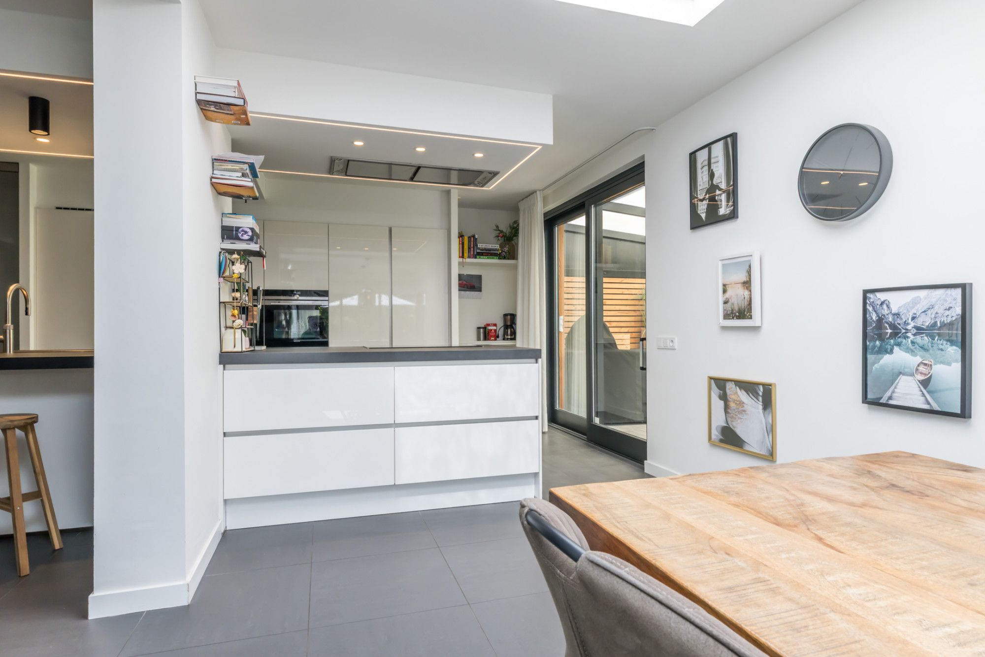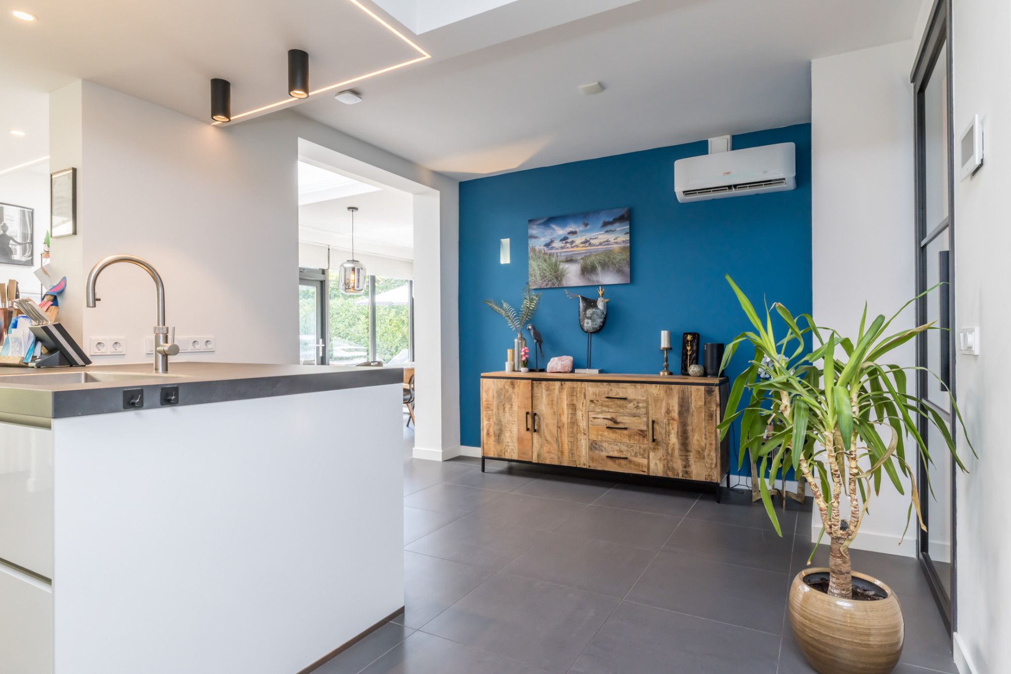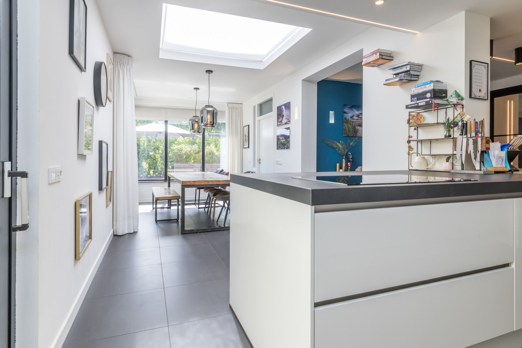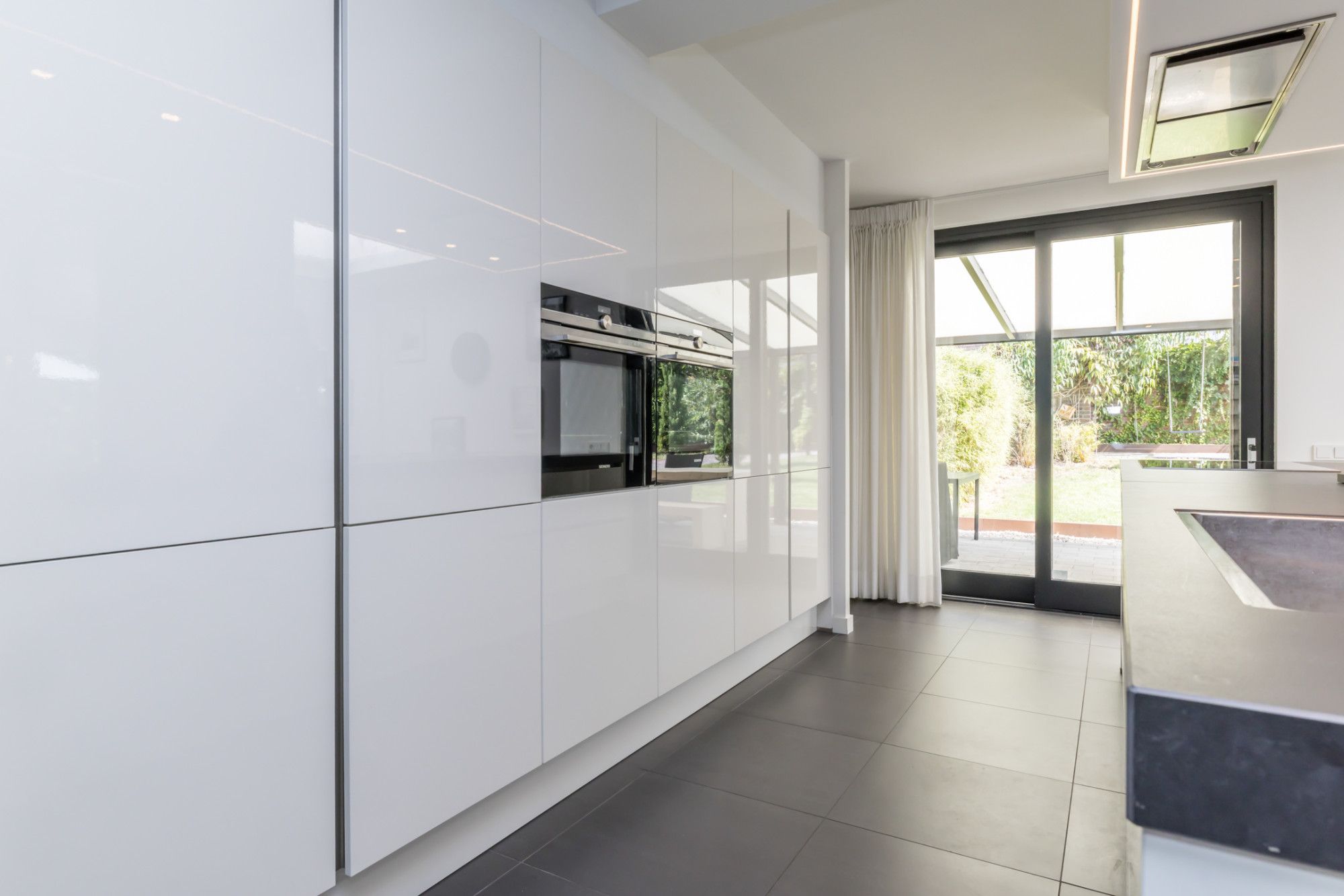 Moderne semi- open leefkeuken (ca 52 m2) verdeeld in kook en eetgedeelte. De keuken met kookeiland, installatie en apparatuur t.w.: Quooker kraan, oven, combi oven/ magnetron, 5 pits inductiekookplaat en koelkast. Vanuit het eetgedeelte heeft men toegang tot de inpandige berging/ bijkeuken. Berging/ bijkeuken (4,27 m x 3,00 m) met vaste kastenwand en mogelijkheid voor praktijk- c.q. kantoorruimte. Middels schuifpui en openslaande deur heeft men vanuit de leefkeuken het ideale tuincontact.