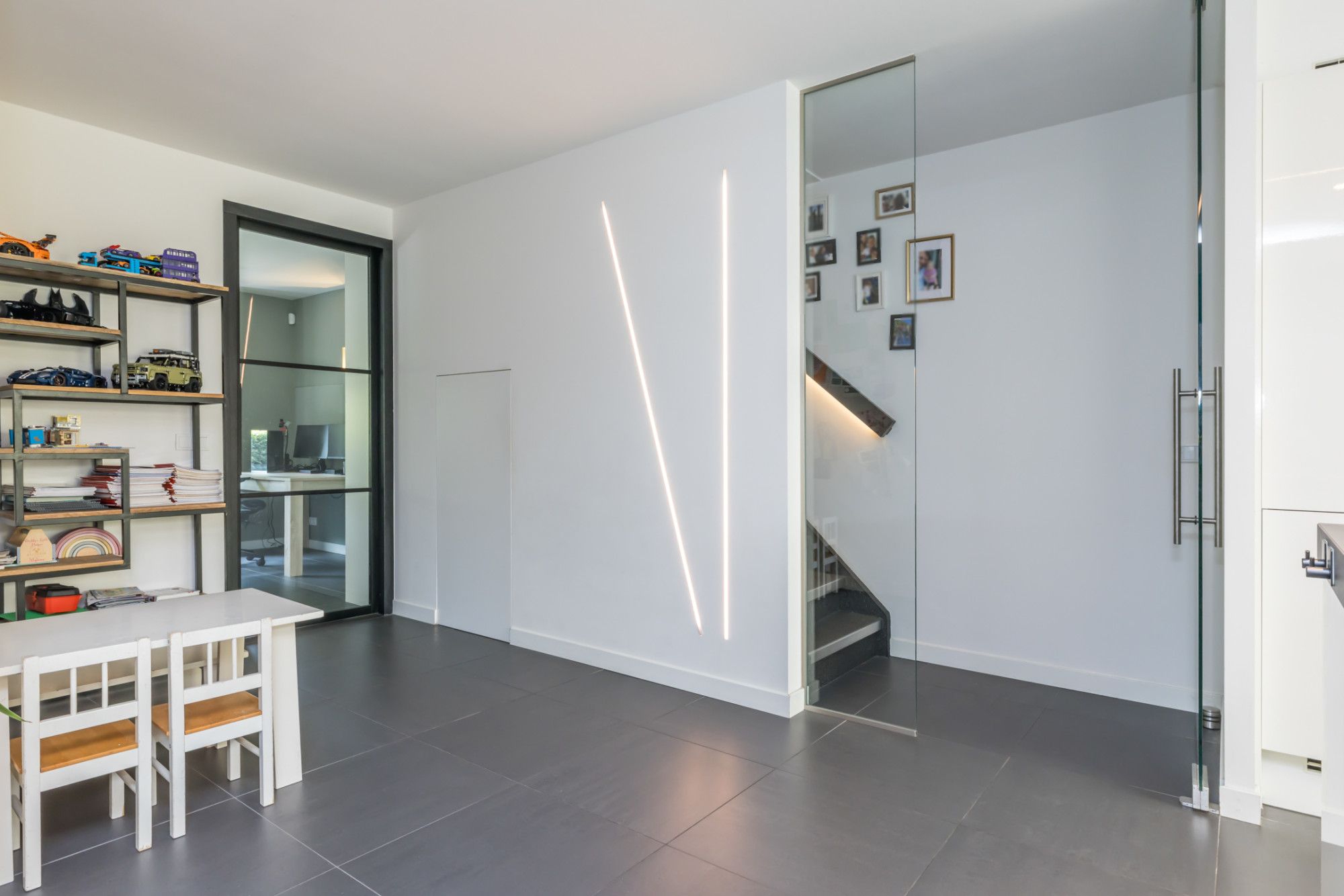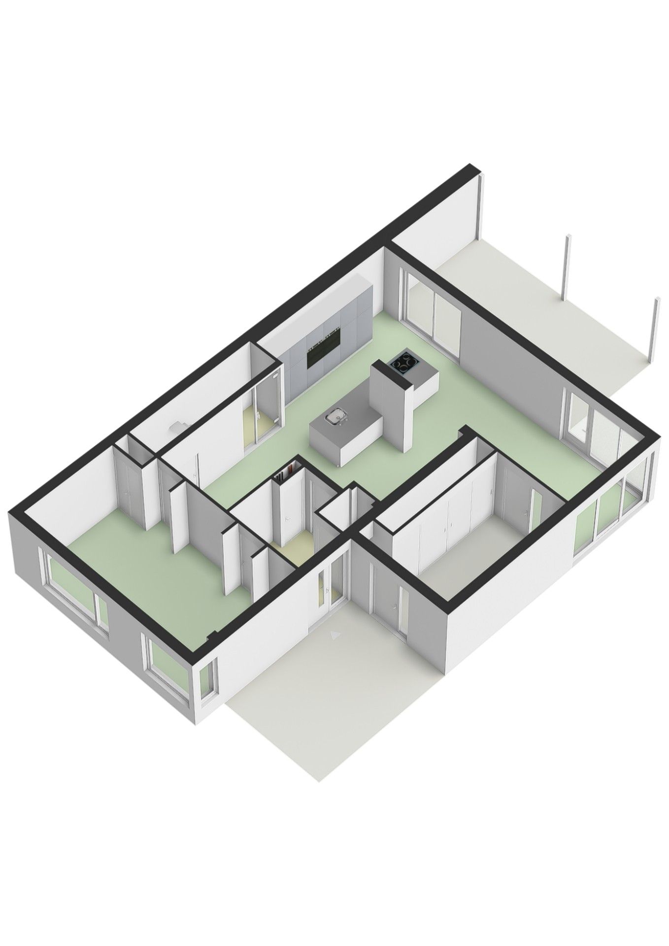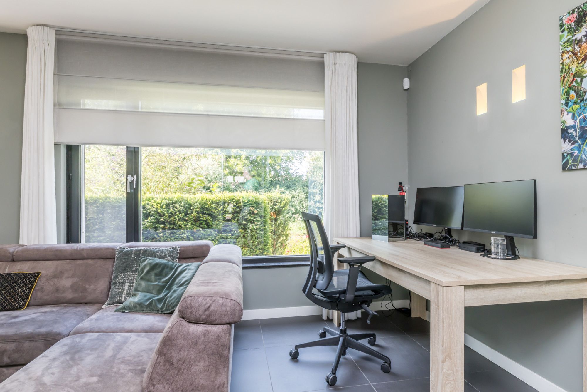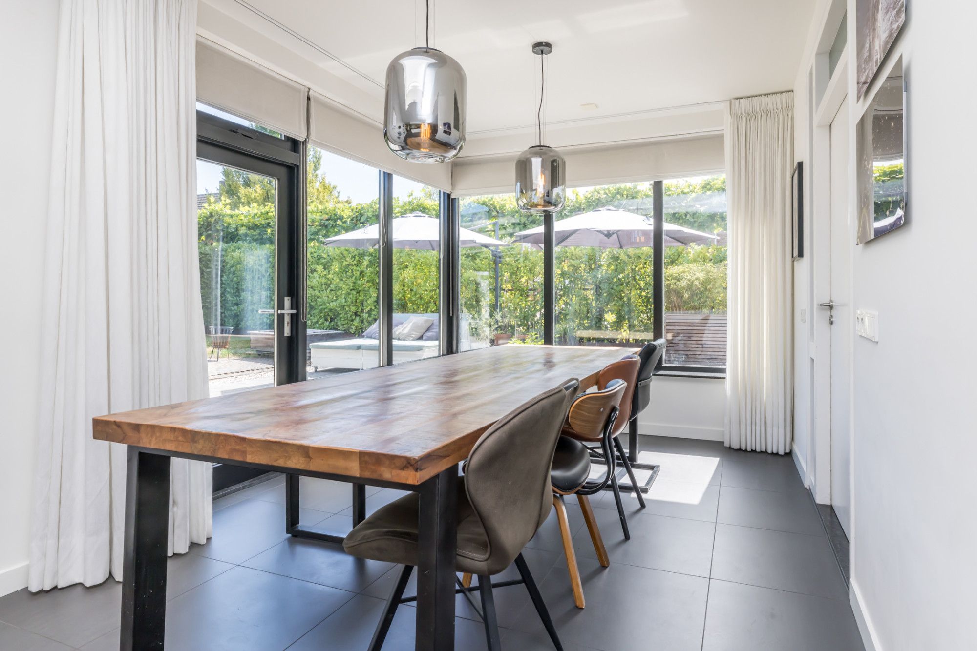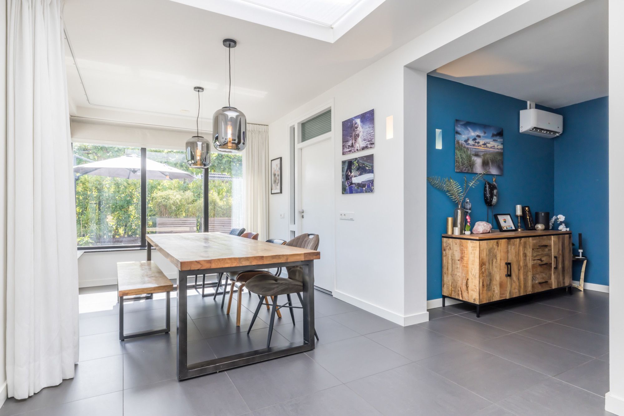 Moderne semi- open leefkeuken (ca 52 m2) verdeeld in kook en eetgedeelte. De keuken met kookeiland, installatie en apparatuur t.w.: Quooker kraan, oven, combi oven/ magnetron, 5 pits inductiekookplaat en koelkast. Vanuit het eetgedeelte heeft men toegang tot de inpandige berging/ bijkeuken. Berging/ bijkeuken (4,27 m x 3,00 m) met vaste kastenwand en mogelijkheid voor praktijk- c.q. kantoorruimte. Middels schuifpui en openslaande deur heeft men vanuit de leefkeuken het ideale tuincontact.
