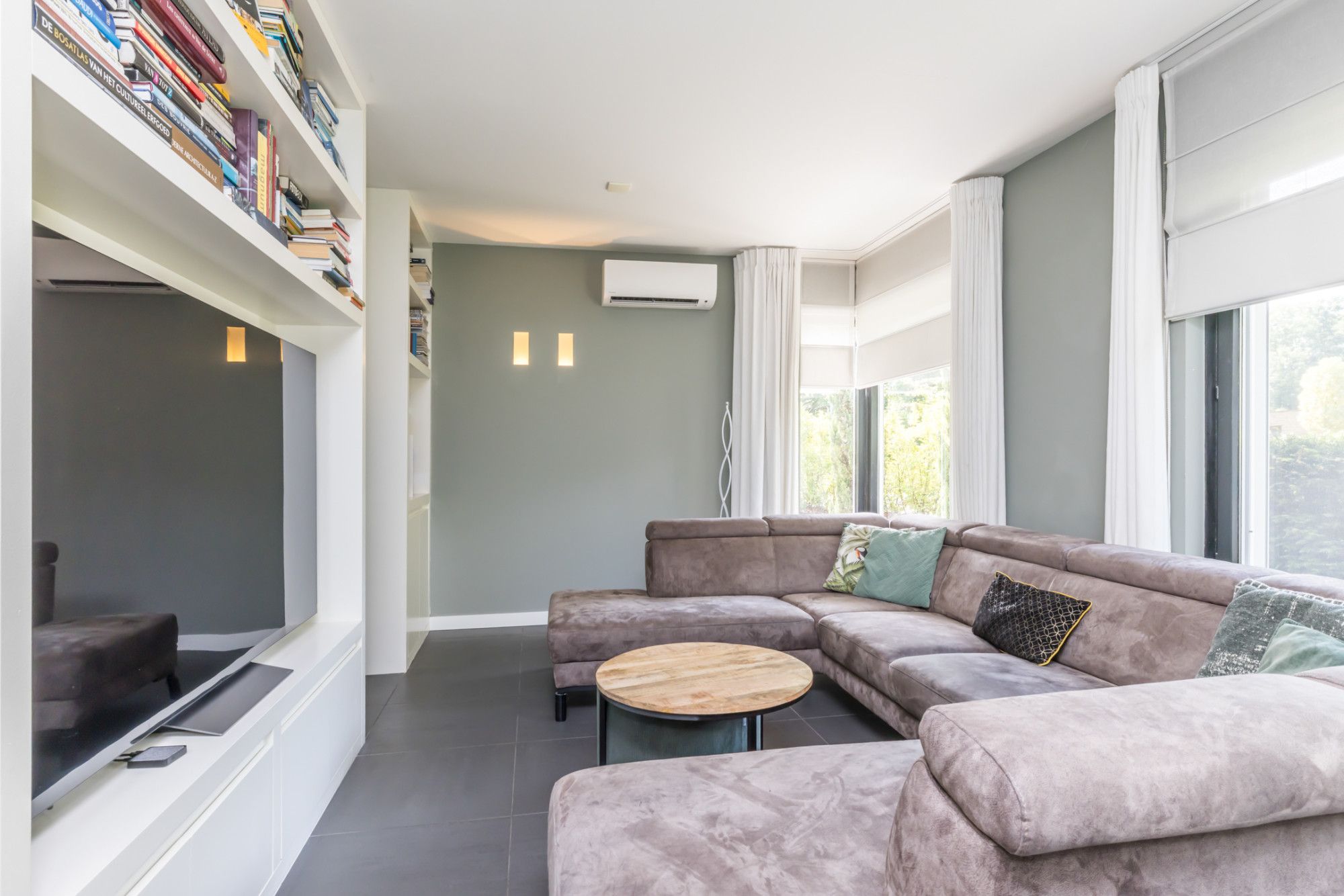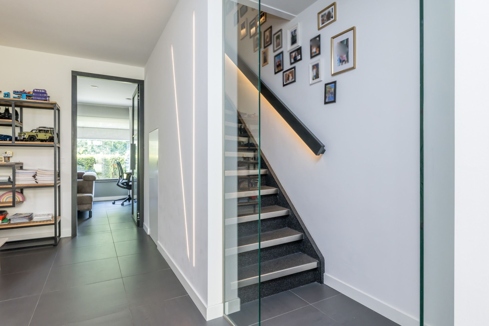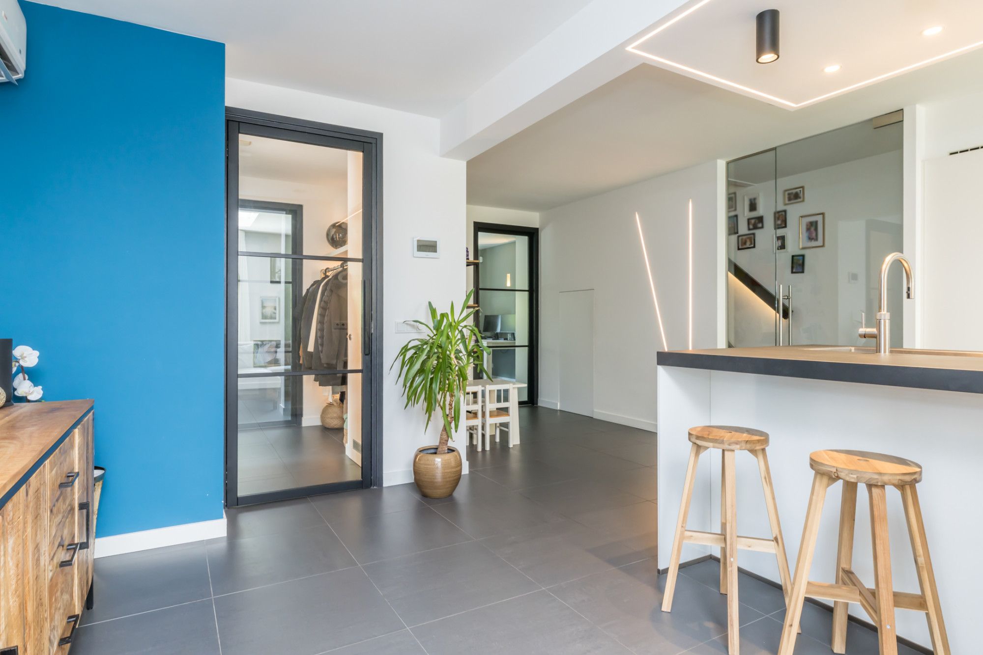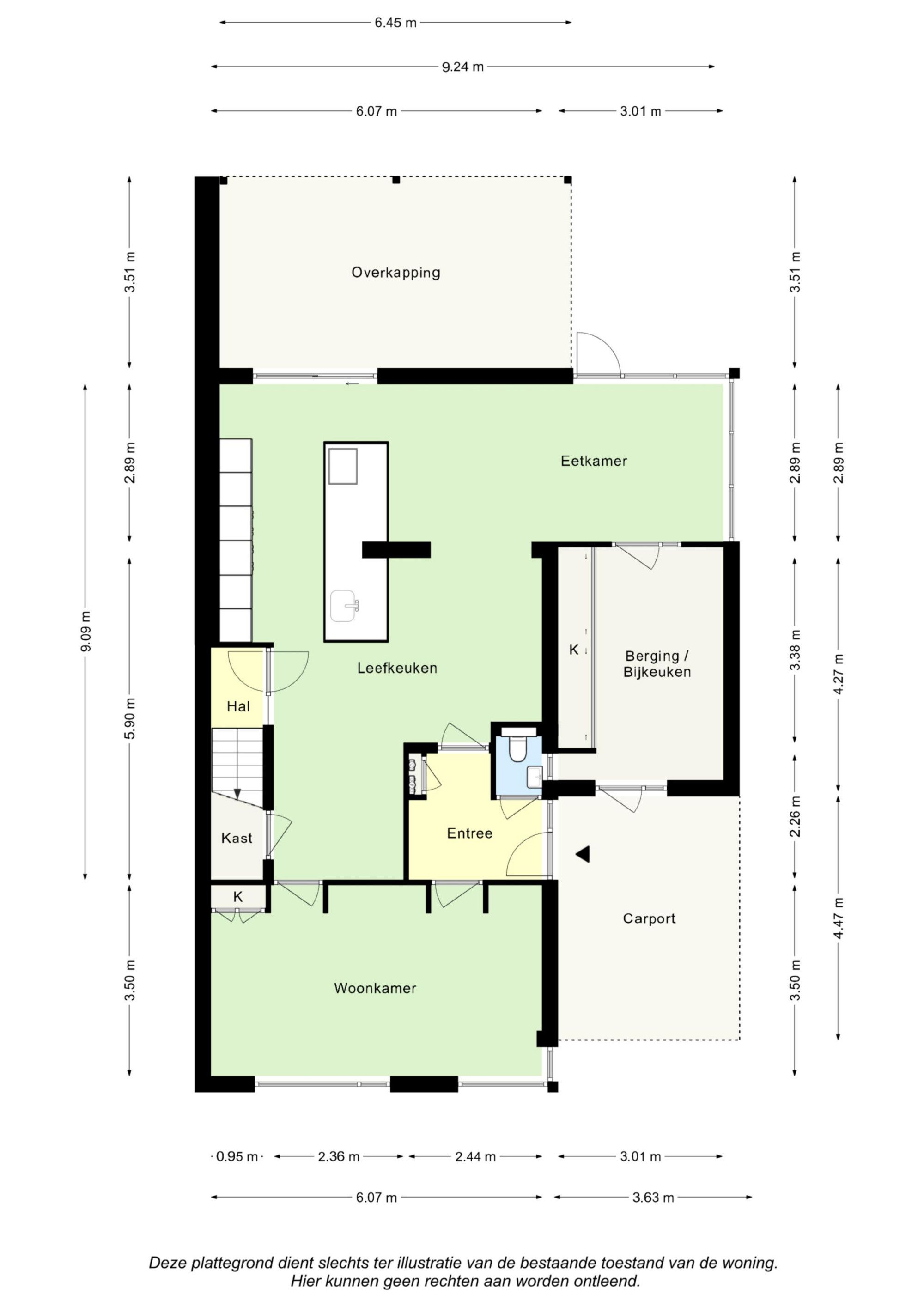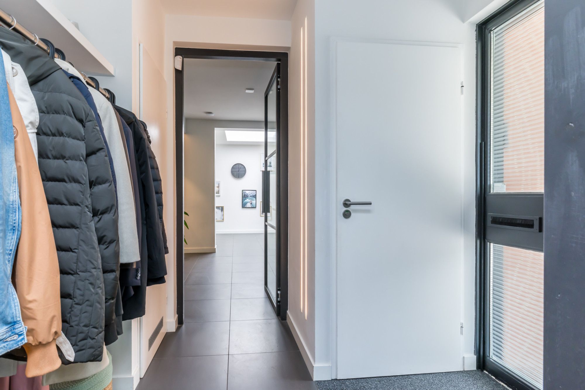 Vanuit de ruime oprit v.v. carport te bereiken entree, de hal-entree biedt toegang tot moderne toiletruimte, living en leefkeuken. De sfeervolle living (6,07 m x 3,50 m) is aan de voorzijde gelegen, is v.v. een op maat gemaakte kastenwand en biedt toegang tot leefkeuken.