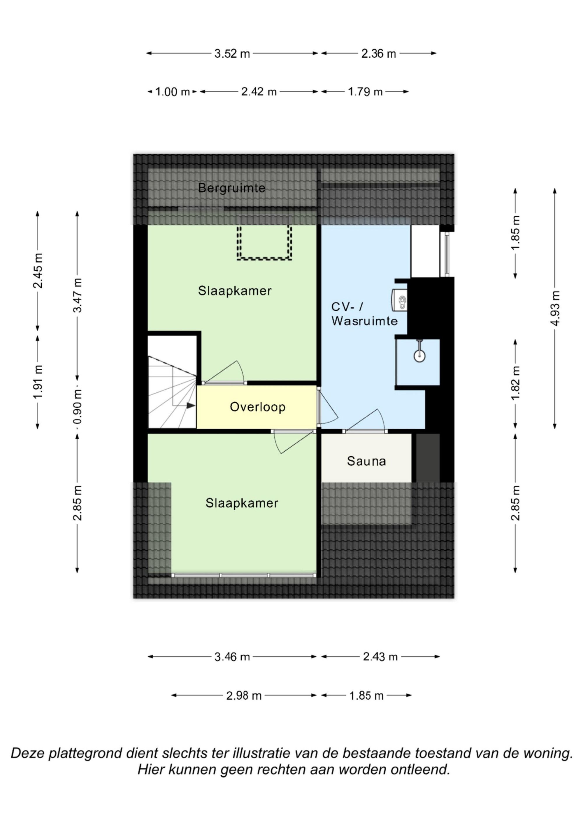 De overloop biedt toegang tot 2 slaapkamers en cv/ wasruimte. Slaapkamer IV (3,46 m x 2,85 m) en slaapkamer V (3,52 m x 3,47 m). Was/ cv-ruimte (4,93 m x 2,36 m) is v.v. een douche en biedt toegang tot sauna (de sauna is op dit moment niet operationeel).