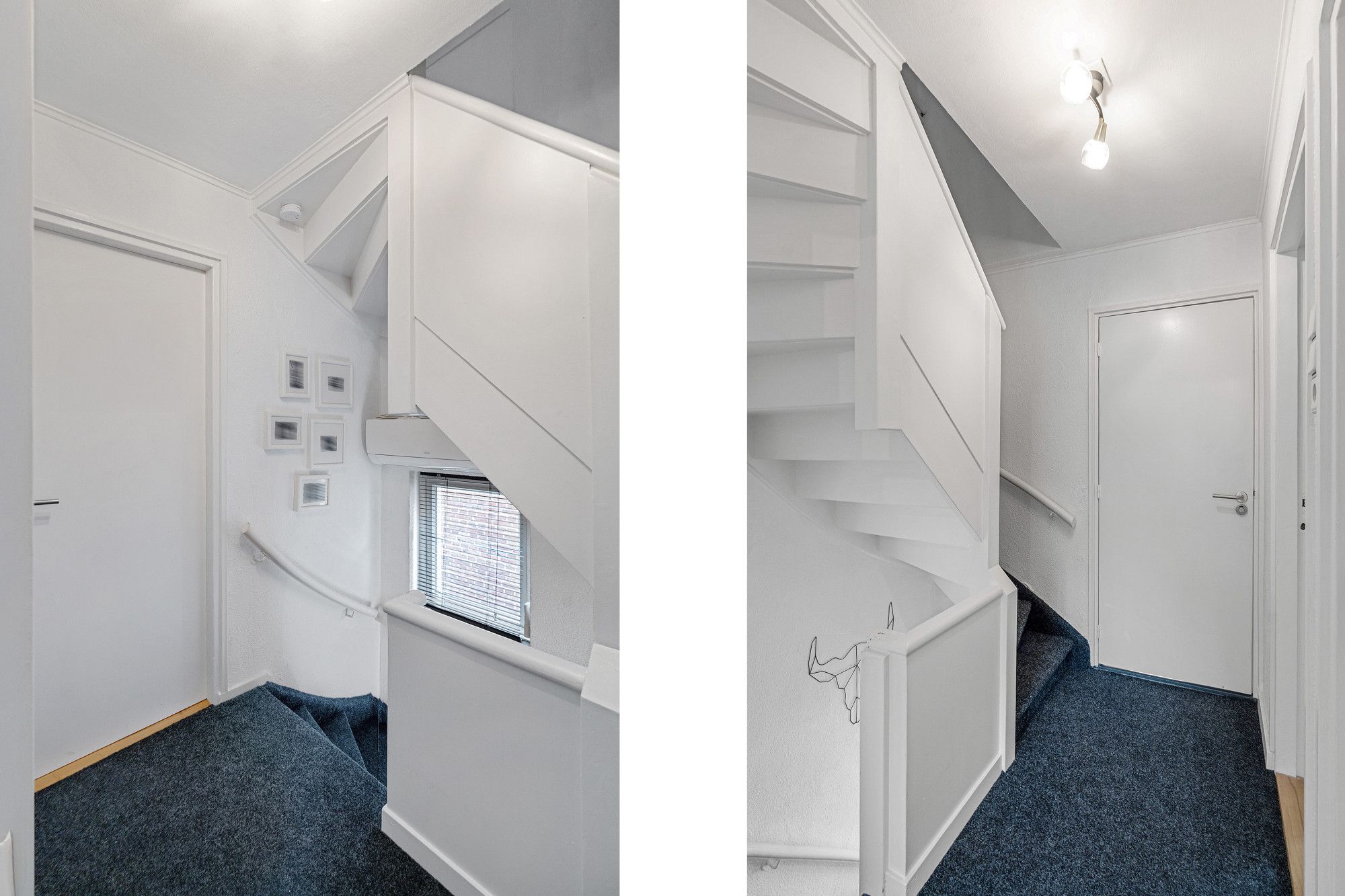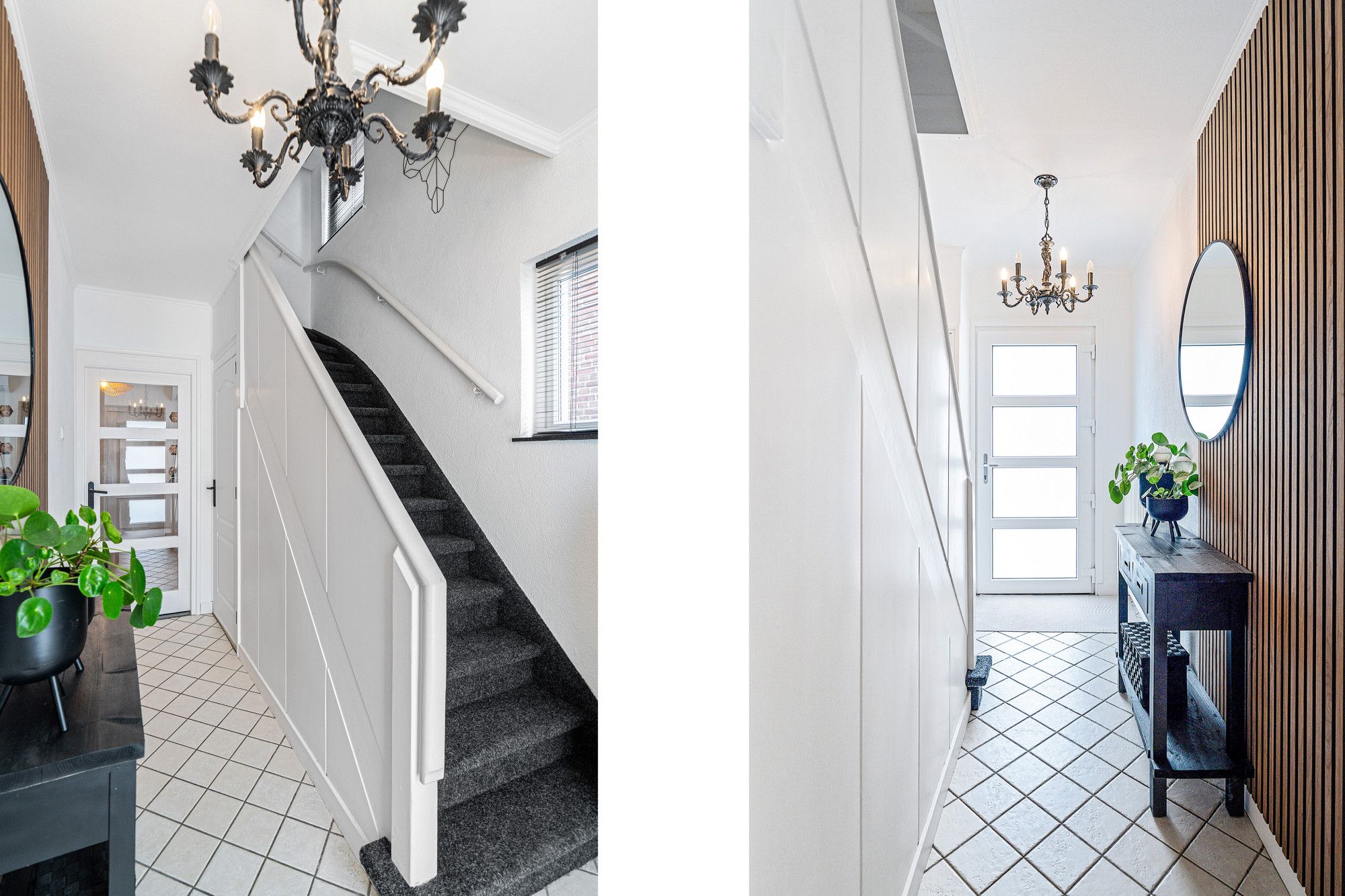 Bij binnenkomst in de hal heeft u toegang tot de trap naar de eerste verdieping, de meterkast, de kelder en de woonkamer.