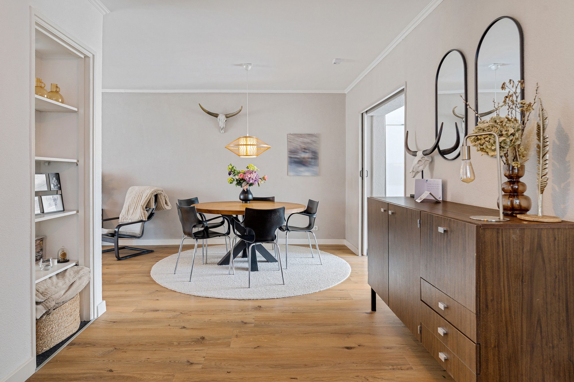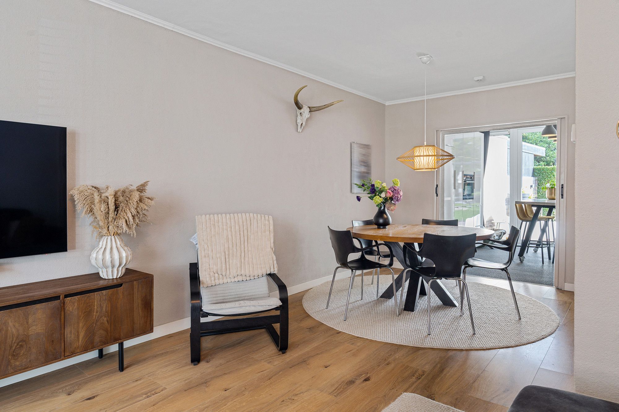 De lichte woonkamer is ruim opgezet en biedt voldoende plek voor een zit- en eetgedeelte. Twee vaste muurkasten zorgen voor extra bergruimte.
