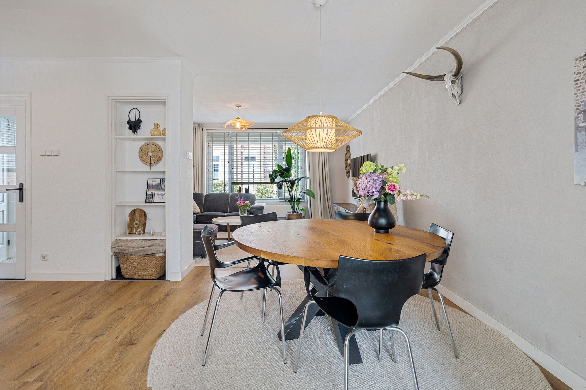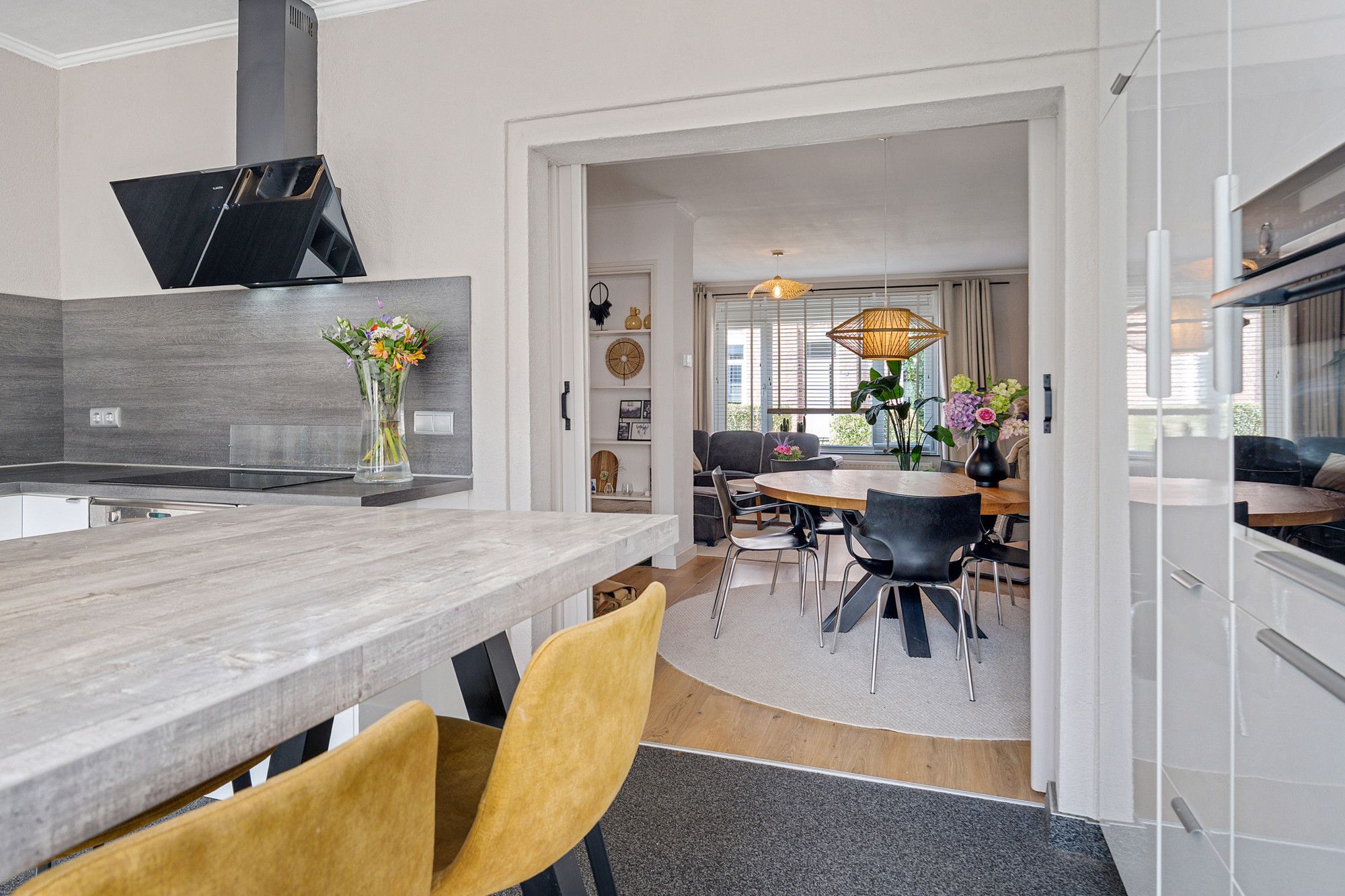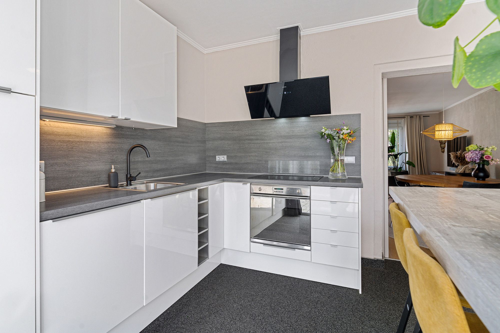 Via twee schuifdeuren bereikt u de moderne keuken, voorzien van inbouwapparatuur zoals een inductiekookplaat, oven, afzuigkap spoelbak met kraan en koelkast. Vanuit de keuken heeft u via dubbele glazen deuren direct toegang tot de tuin — een groot pluspunt op zonnige dagen!