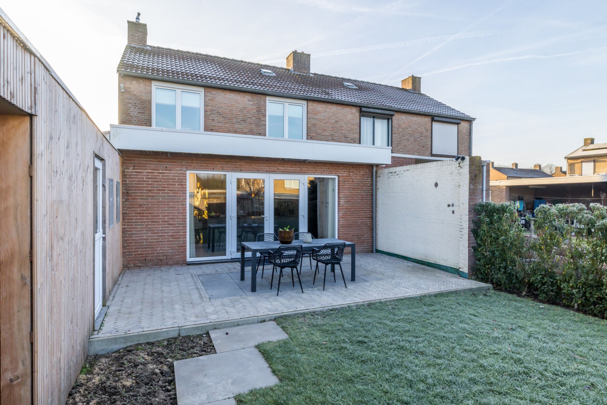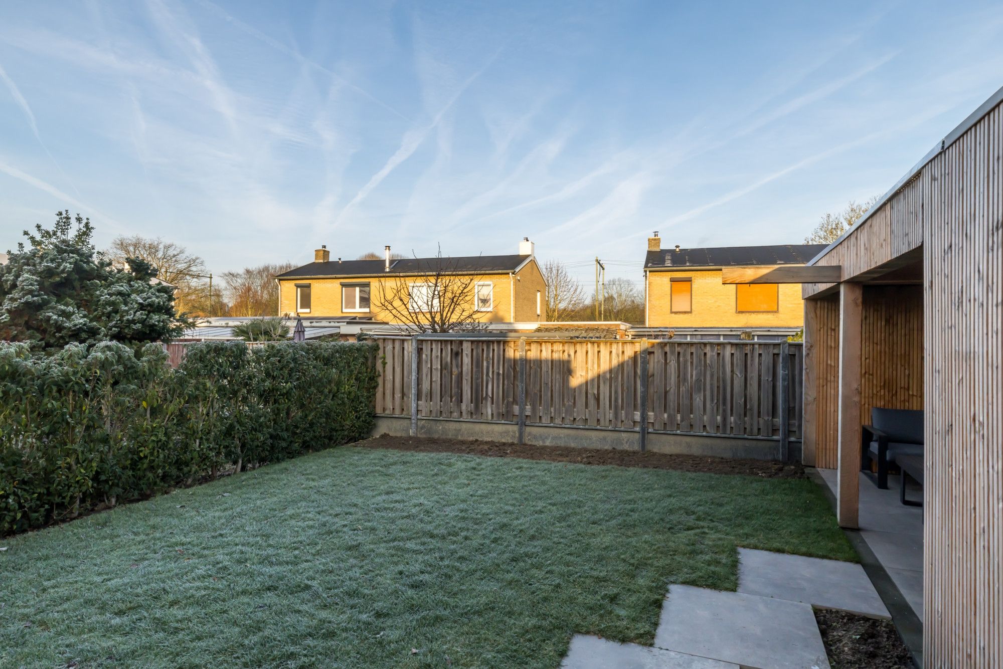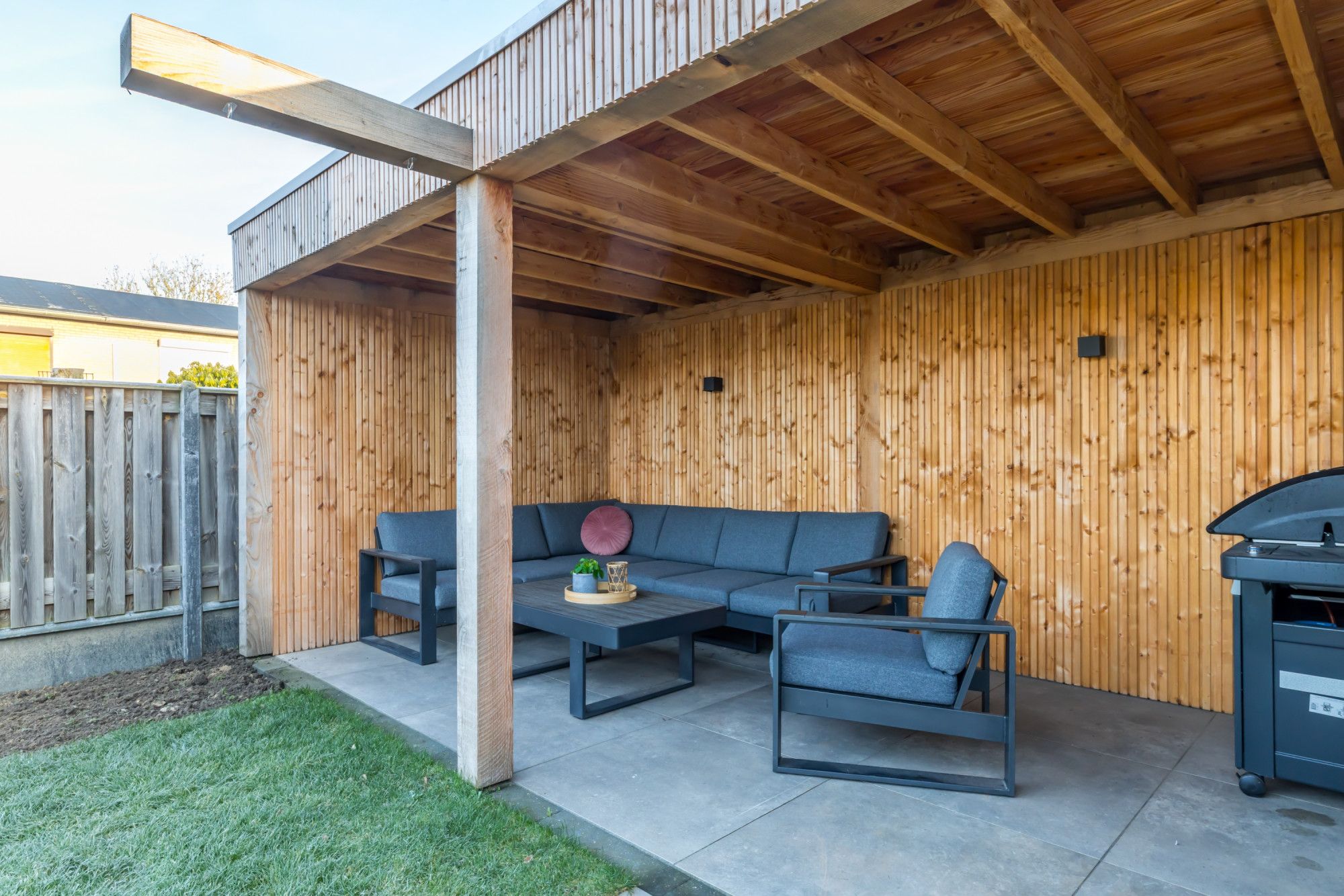 Achtertuin met terras en houten overkapping met een nieuw aangelegde oprit.