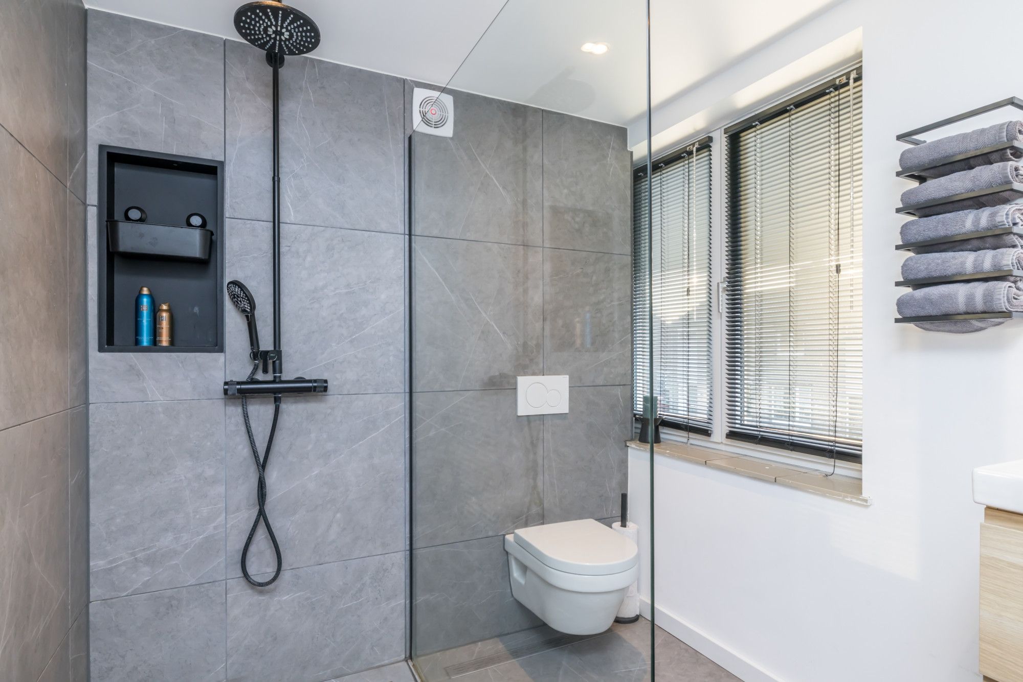 De moderne badkamer (2022), voorzien van betegelde vloer, inloopdouche, hangend toilet en wastafelmeubel.