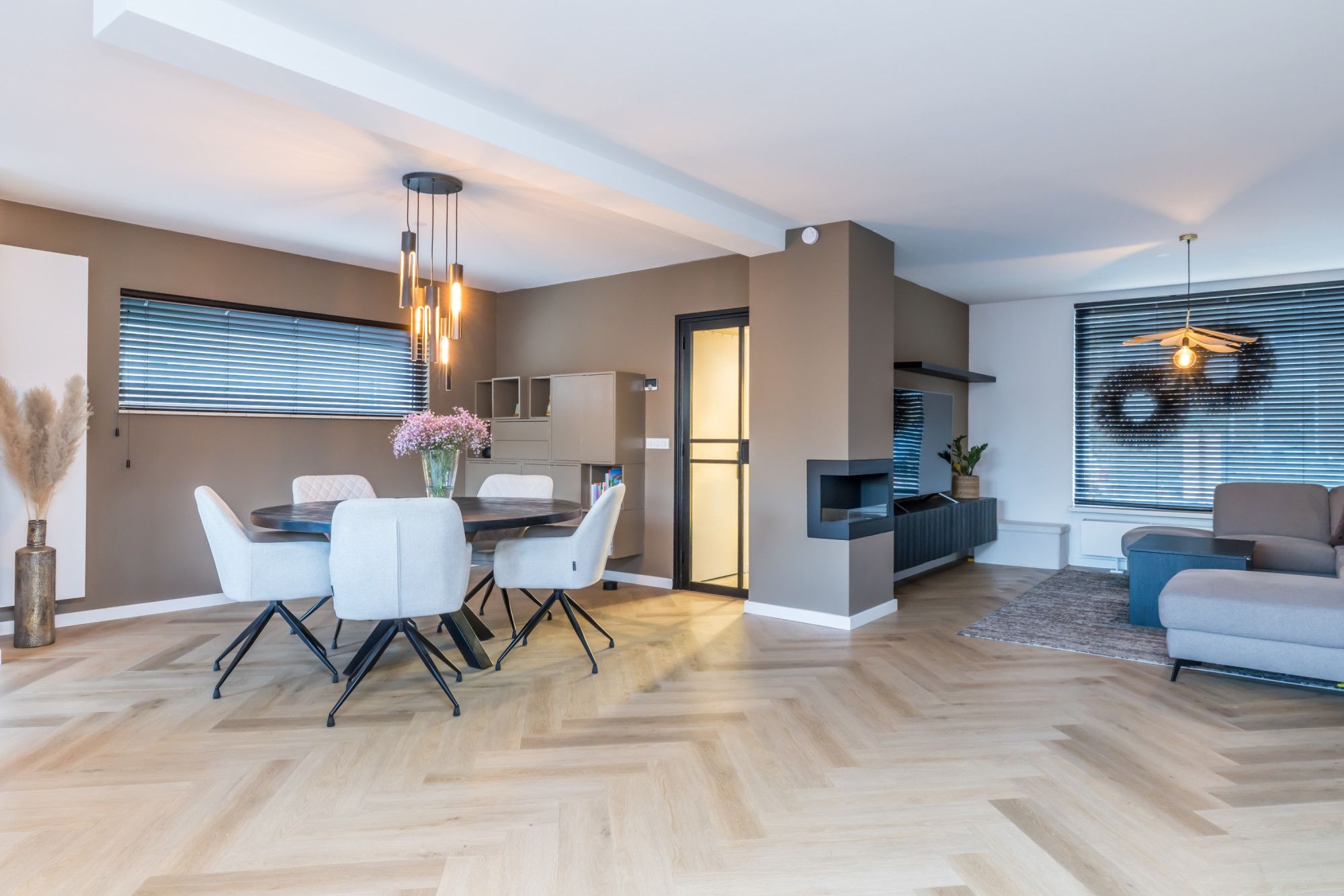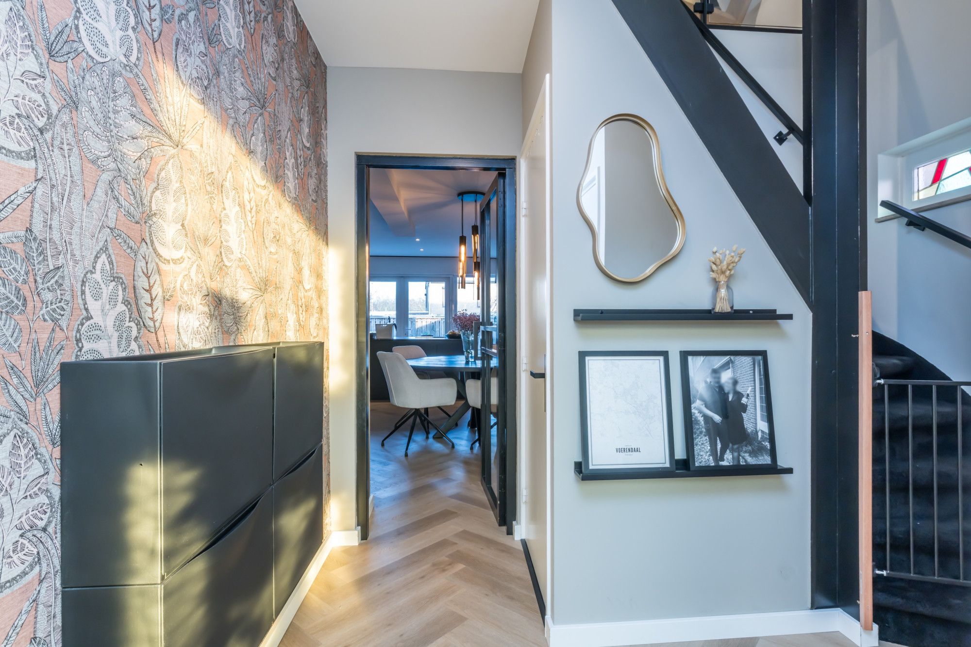 Entree/hal, met een vaste trap naar 1e verdieping en met een vaste trap naar kelder. De ruimte heeft een meterkast. volledig voorzien van PVC vloer. Separate toiletruimte (2022), voorzien van hangend toilet. Vanuit de hal kom je in de ruime open woonkamer terecht met een moderne luxe keuken, voorzien van diverse inbouwapparatuur, met o.a. inductie kookplaat, oven, koelkast, vriezer, bora downdraft afzuiger en vaatwasser.