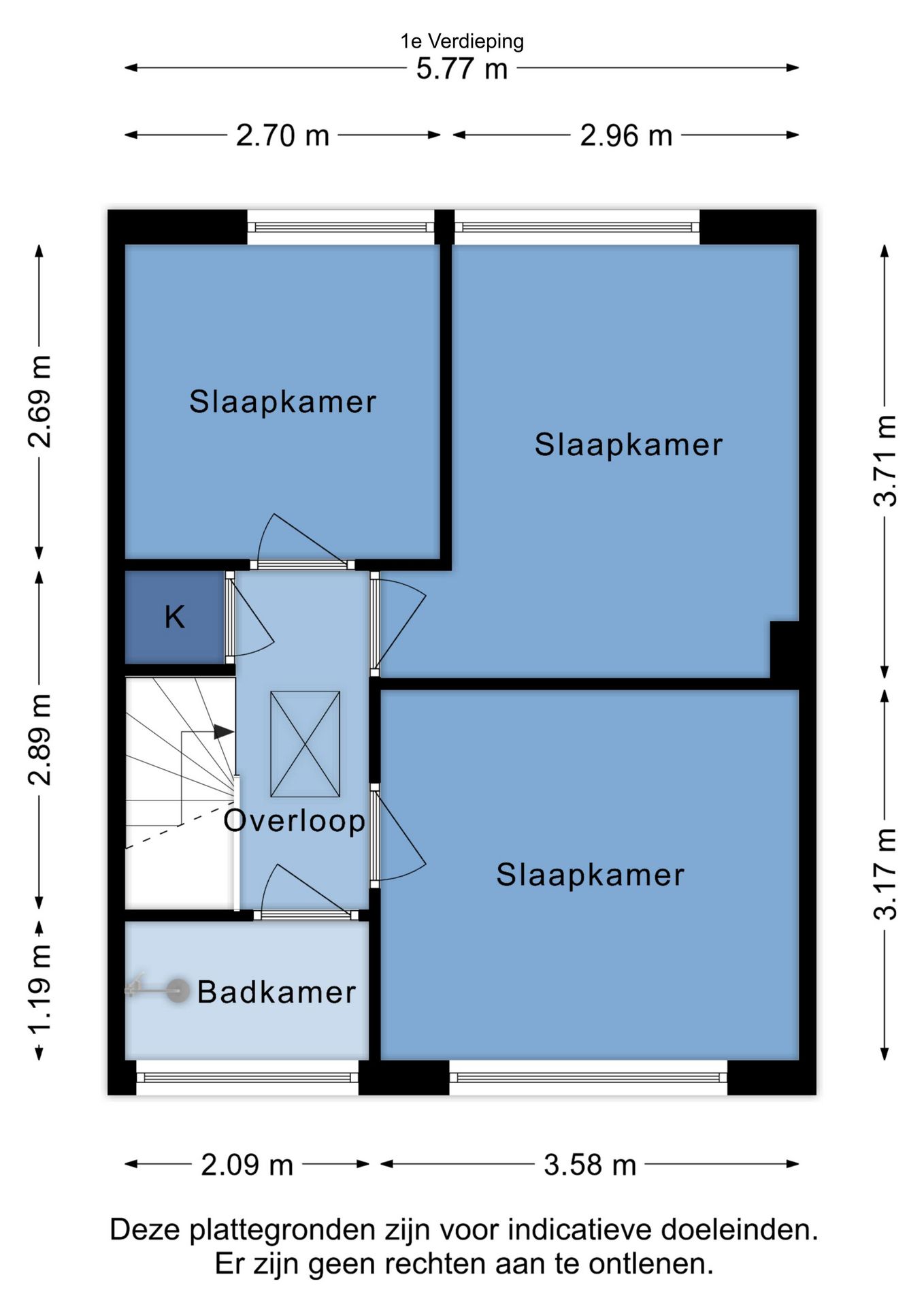 De verdieping is middels de trap in de entree te bereiken. De overloop biedt toegang tot 3 slaapkamers, de badkamer en een muurkast.