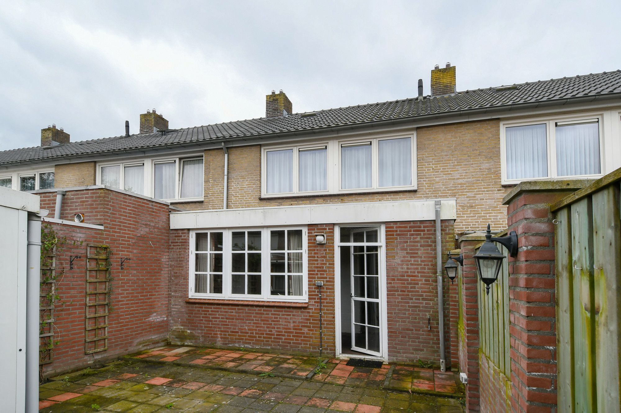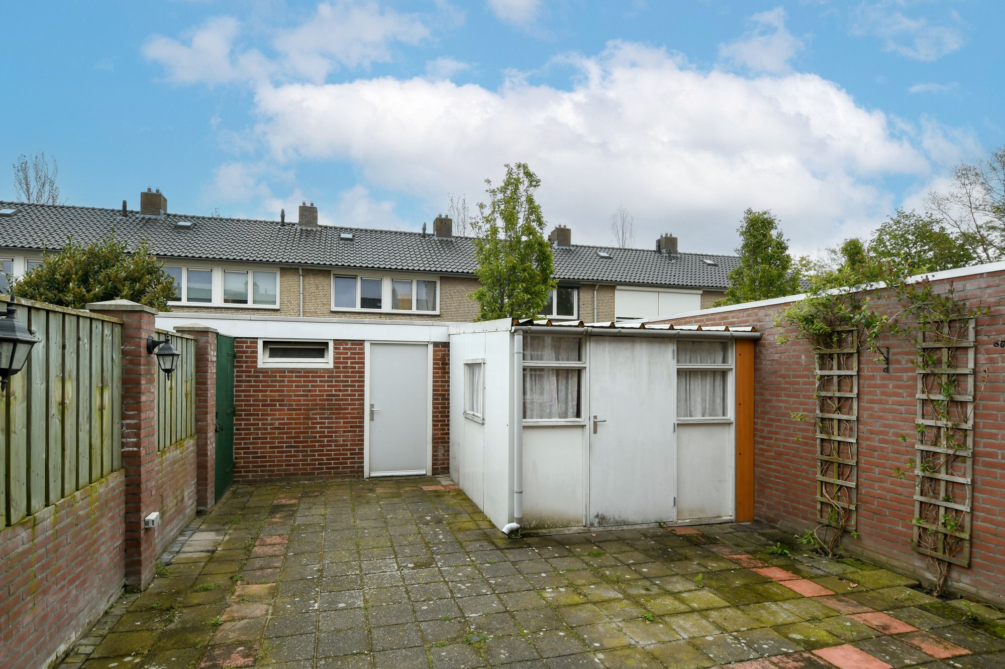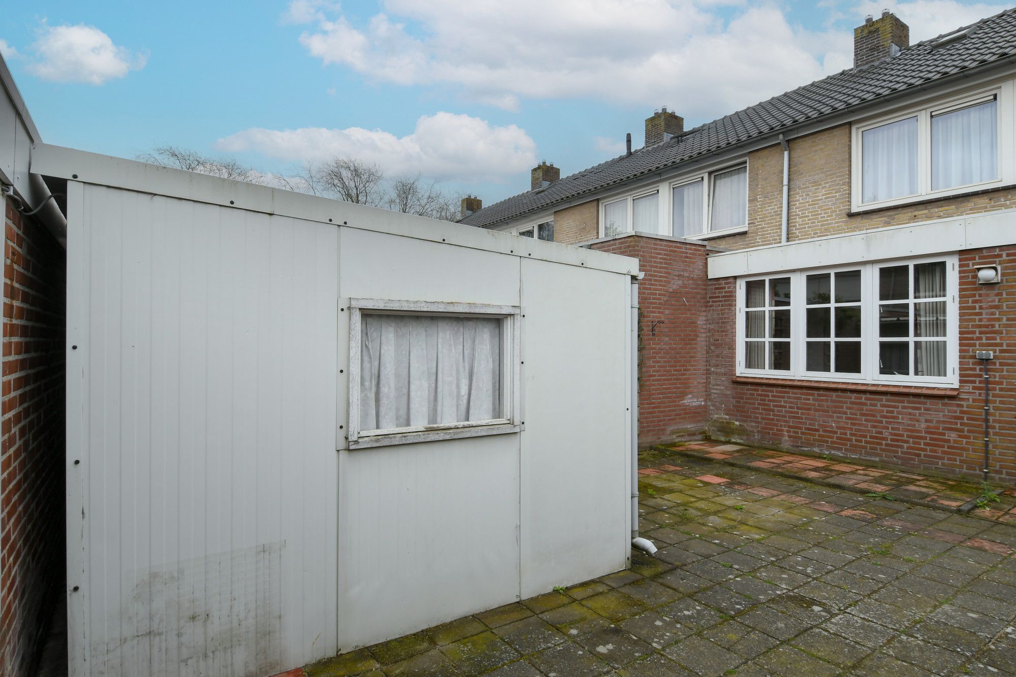 De achtertuin is volledig betegeld en beschikt over een enkelsteense fietsenberging en een eenvoudige tuinberging.