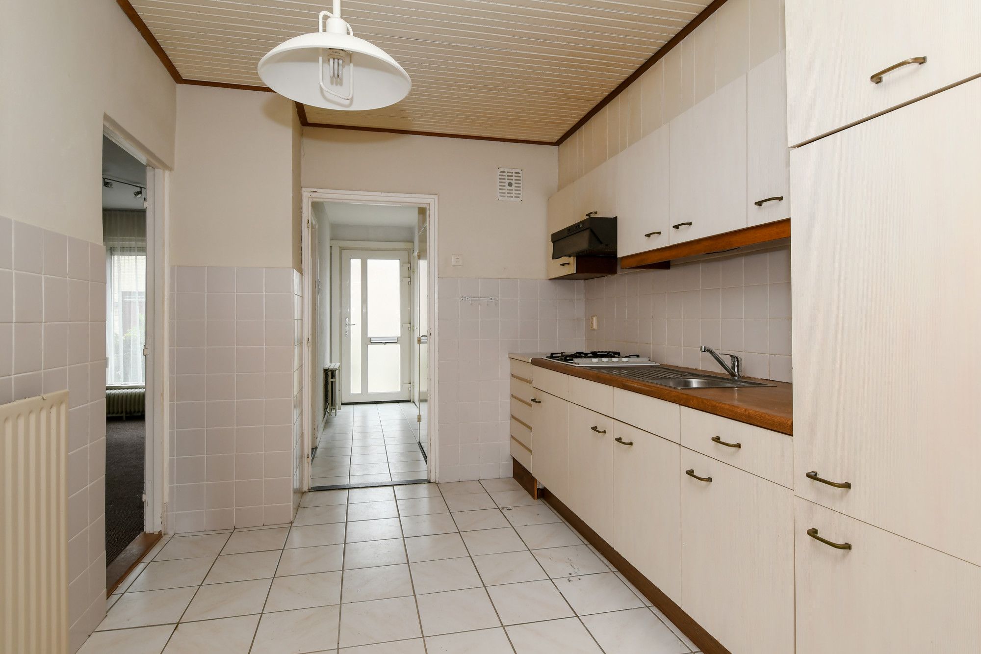 De woonkamer biedt voldoende ruimte voor het plaatsen van een zit- en eethoek en is ca 24 m2 groot. De keuken (ca. 9 m2) met tegelvloer heeft een eenvoudig keukenblok met gasfornuis, afzuigkap en koelkast. Aan de achterzijde is de woning uitgebouwd (ca. 13 m2) en voorzien van een houten kozijn(dubbel glas) en houten deur(enkel glas).