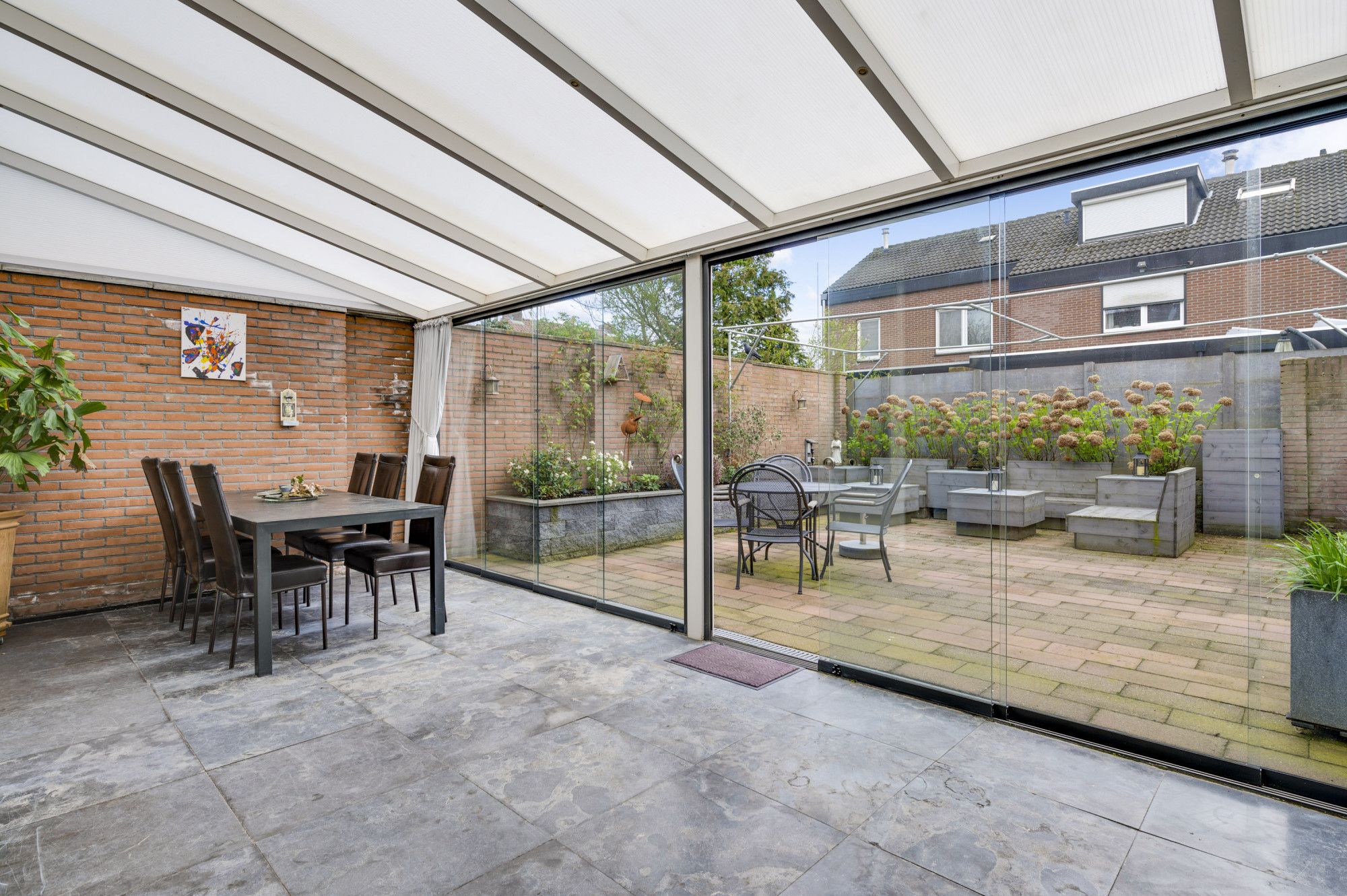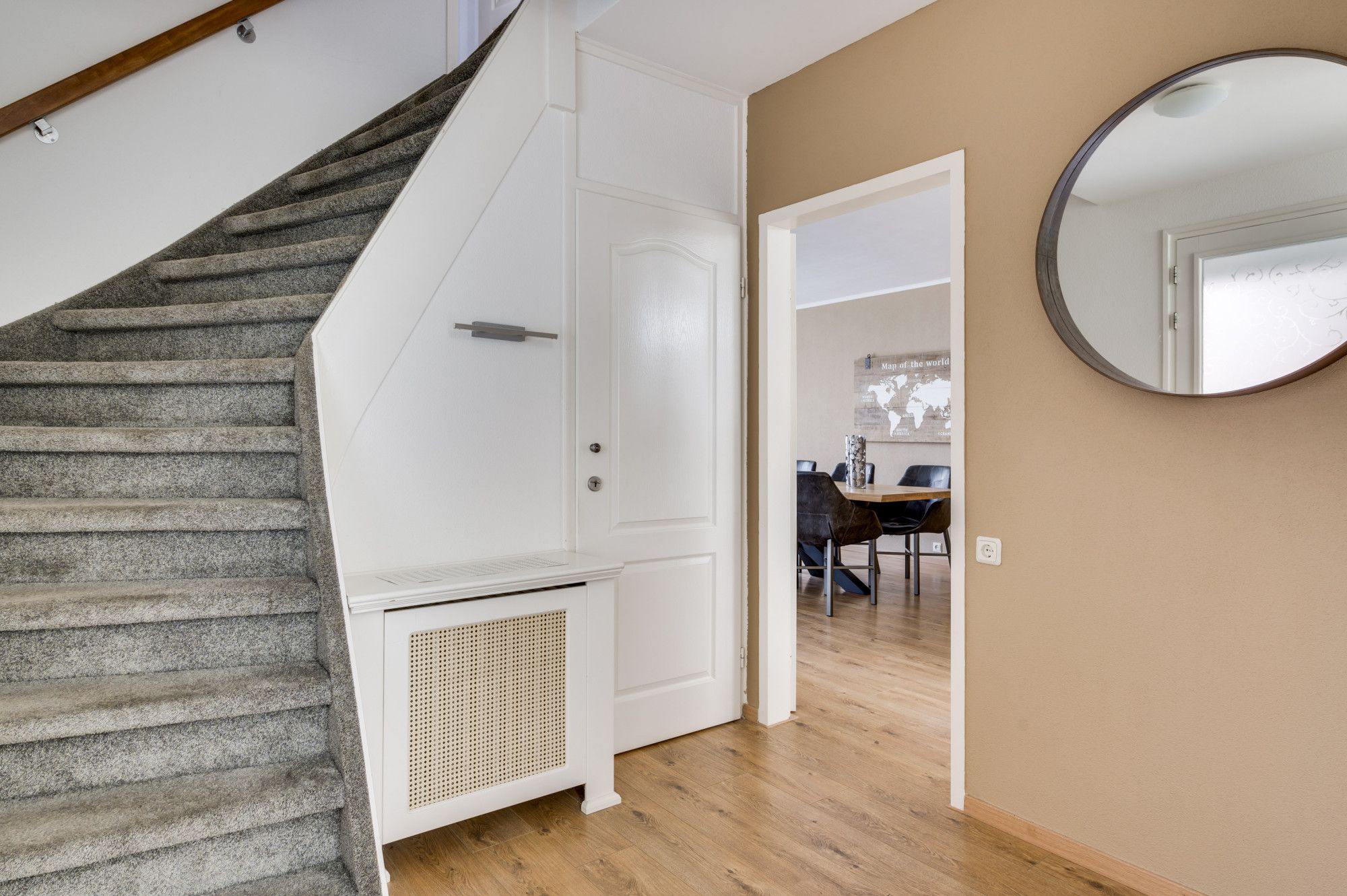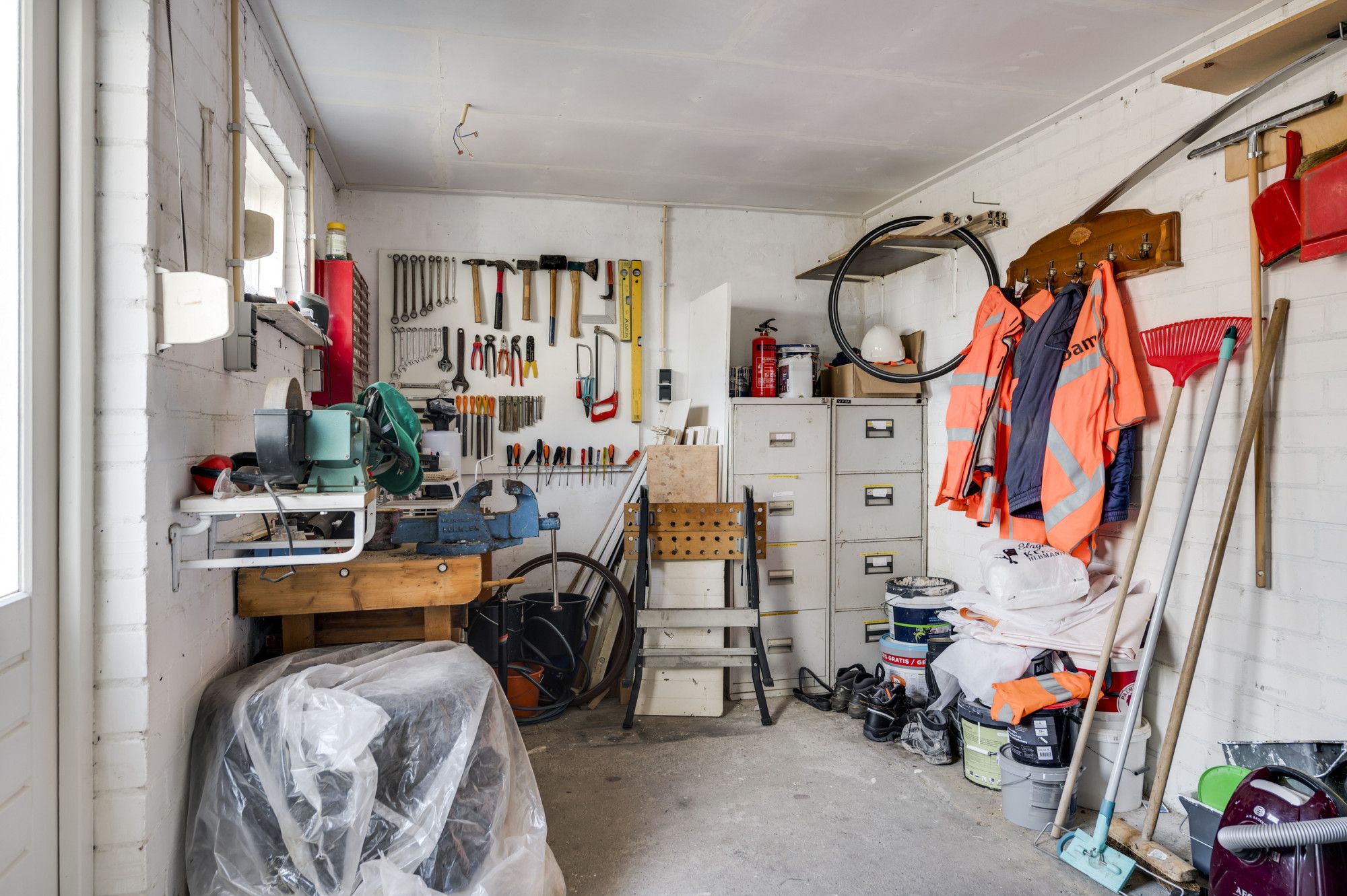 Via een overdekte entree is de woning te betreden. De ruime ontvangsthal beschikt over een toiletruimte met toilet en fonteintje en meterkast (met elektrische groepen) en biedt toegang tot de inpandig bereikbare garage/hobbyruimte, de trapopgang naar de eerste verdieping en de praktische trapkast. De hal biedt tevens toegang tot de royale L-vormige woonkamer met voldoende ruimte voor een zit- en eetgedeelte en is uitgerust met een fraaie laminaatvloer welke doorloopt in de keuken. De keuken met een moderne combinatie in hoekopstelling beschikt over de navolgende apparatuur; 5-pits gasfornuis, afzuigkap, combi-oven en koelkast en geeft middels openslaande deuren toegang tot de riante serre/overkapping. Deze ruimte met een mooie tegelvloer is dankzij de glazen schuifpanelen het hele jaar door een prettige ruimte om in te verblijven. Vanuit hier is tevens de garage toegankelijk. De ruime garage met een tegelvloer beschikt over de witgoedaansluitingen, een wasbank, elektra, verwarming en openslaande deuren naar de voorgelegen oprit. Op de begane grond is achter de eerste berging die via de garage en de achtertuin bereikbaar is nog een tweede berging die via de achtertuin toegankelijk is (achter het rolluik).