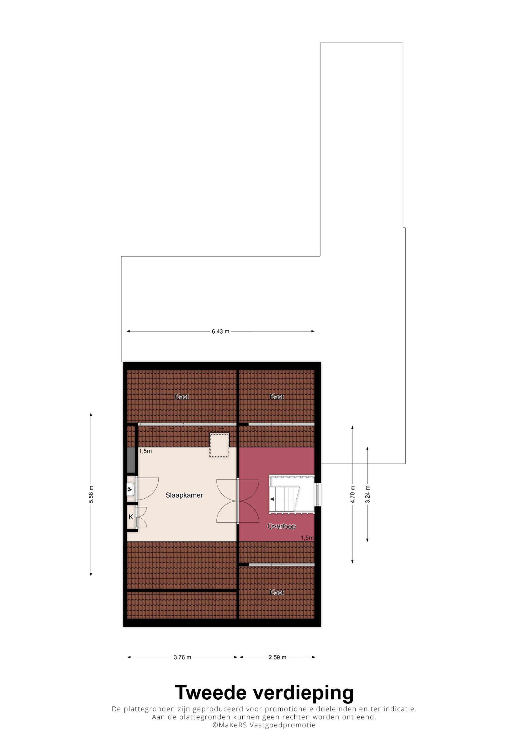 Via een vaste trap toegankelijk. Overloop met toegang tot de 5e slaapkamer met een dakraam. Tevens bevindt zich op deze verdieping de opstelling van de cv-ketel (Nefit HR, eigendom, ca. 2013).