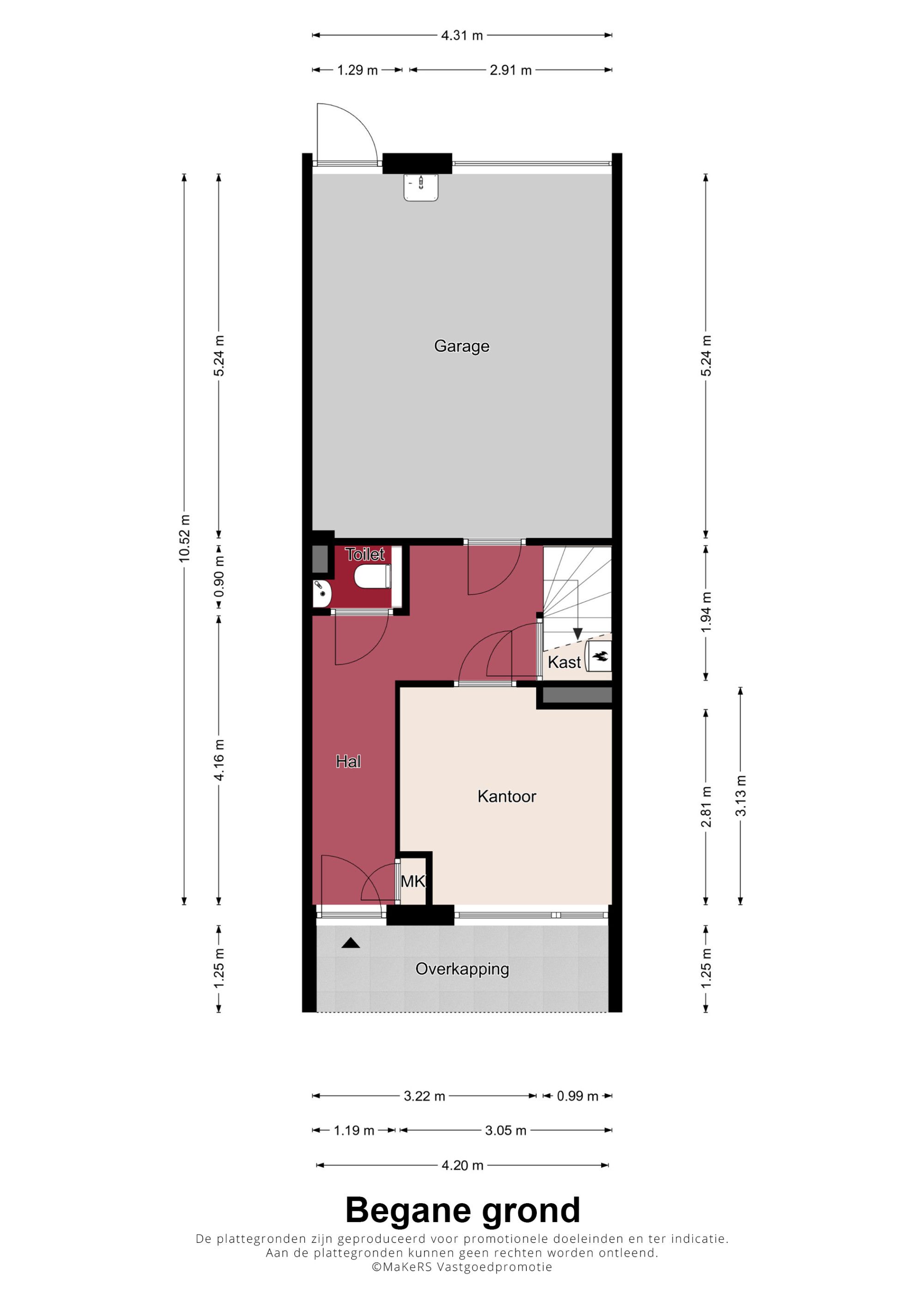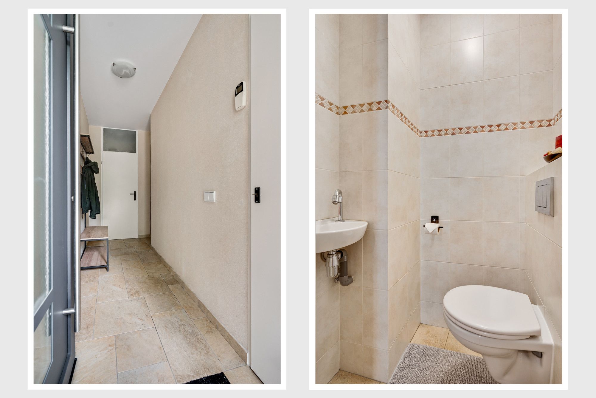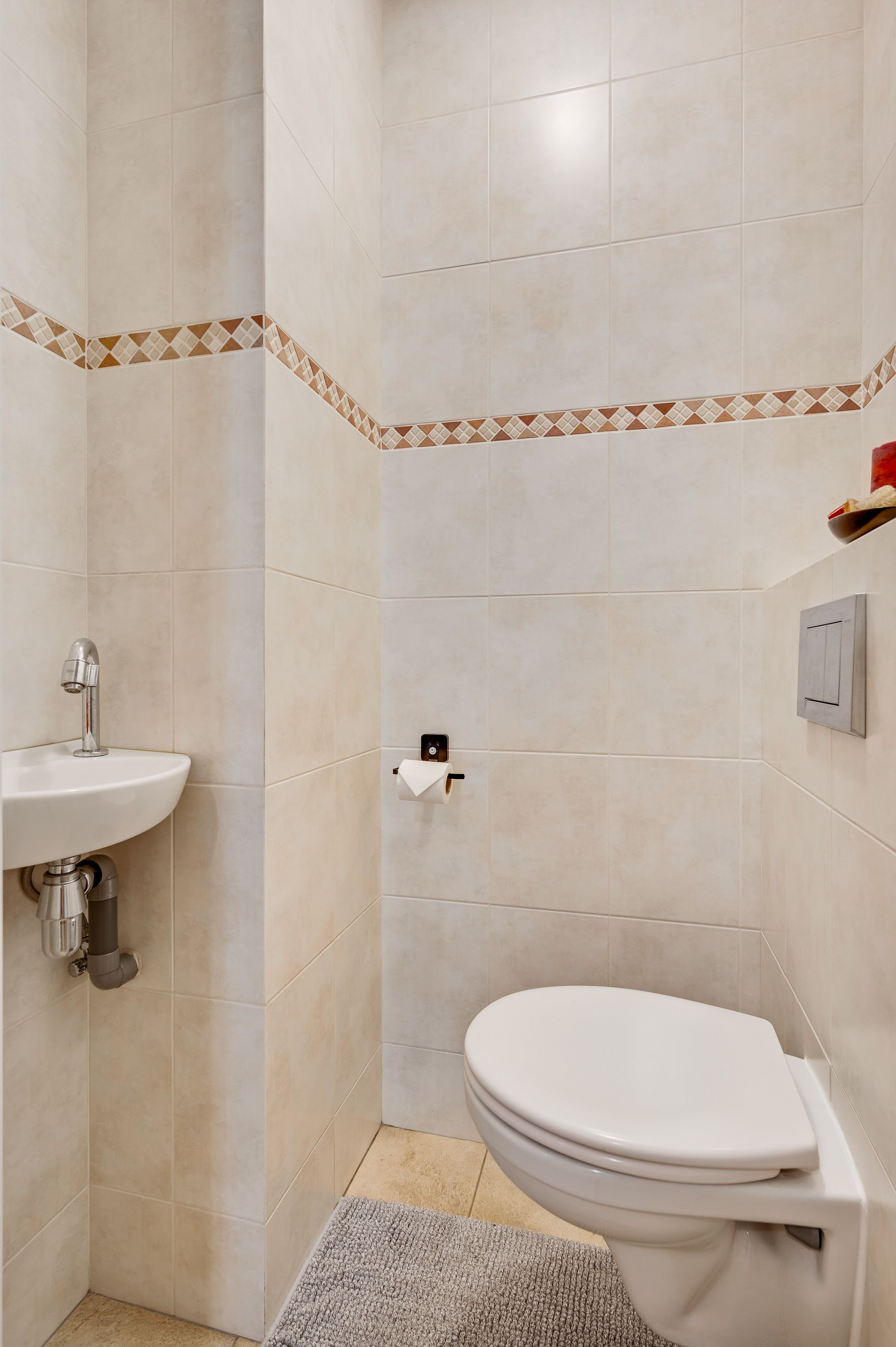 Via de overdekte entree is een royale, uitnodigende ontvangsthal toegankelijk welke is voorzien van de meterkast, toilet met fonteintje, trapopgang met ingebouwde trapverlichting naar de verdieping en een 1e slaap-/hobby-/kantoorkamer (nu in gebruik als salon). Voorts is er inpandig vanuit de hal een zeer ruime garage/hobbyruimte toegankelijk met een elektrische sectionaalpoort en extra loopdeur, een wastafel en witgoedaansluitingen. Vanuit de hal is verder nog apart een praktische cv/bergruimte toegankelijk met de opstelling van de CV combi-ketel (Nefit HR 107, ca. 2015, eigendom). De begane grond is voorzien van een tegelvloer.