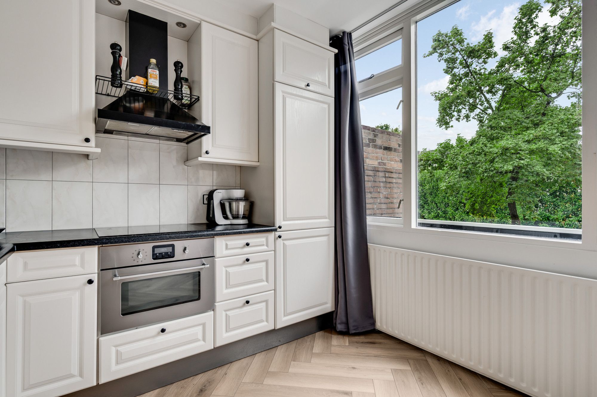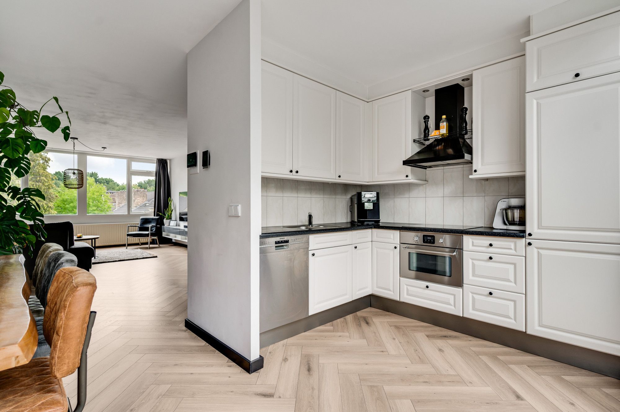 Via de tussenhal is de ruime en sfeervolle woonkamer bereikbaar, De verscholen keuken is voorzien van een moderne combinatie in hoekopstelling met diverse inbouwapparatuur, te weten een inductie kookplaat (2022), afzuigkap, koelkast, diepvries, combi-oven en een vaatwasser. De keuken biedt toegang tot het balkon aan de voorzijde. De gehele 1e verdieping is voorzien van een fraaie visgraat laminaatvloer van 2022.