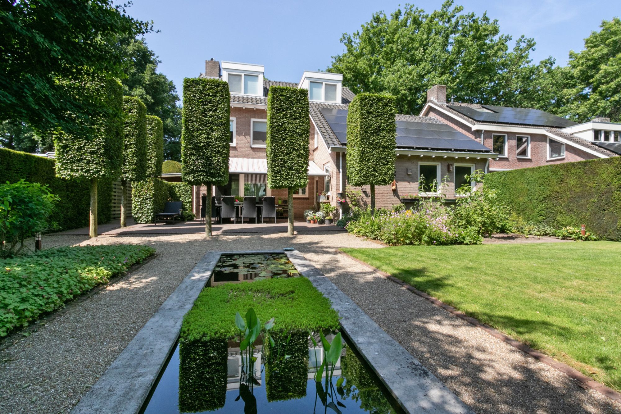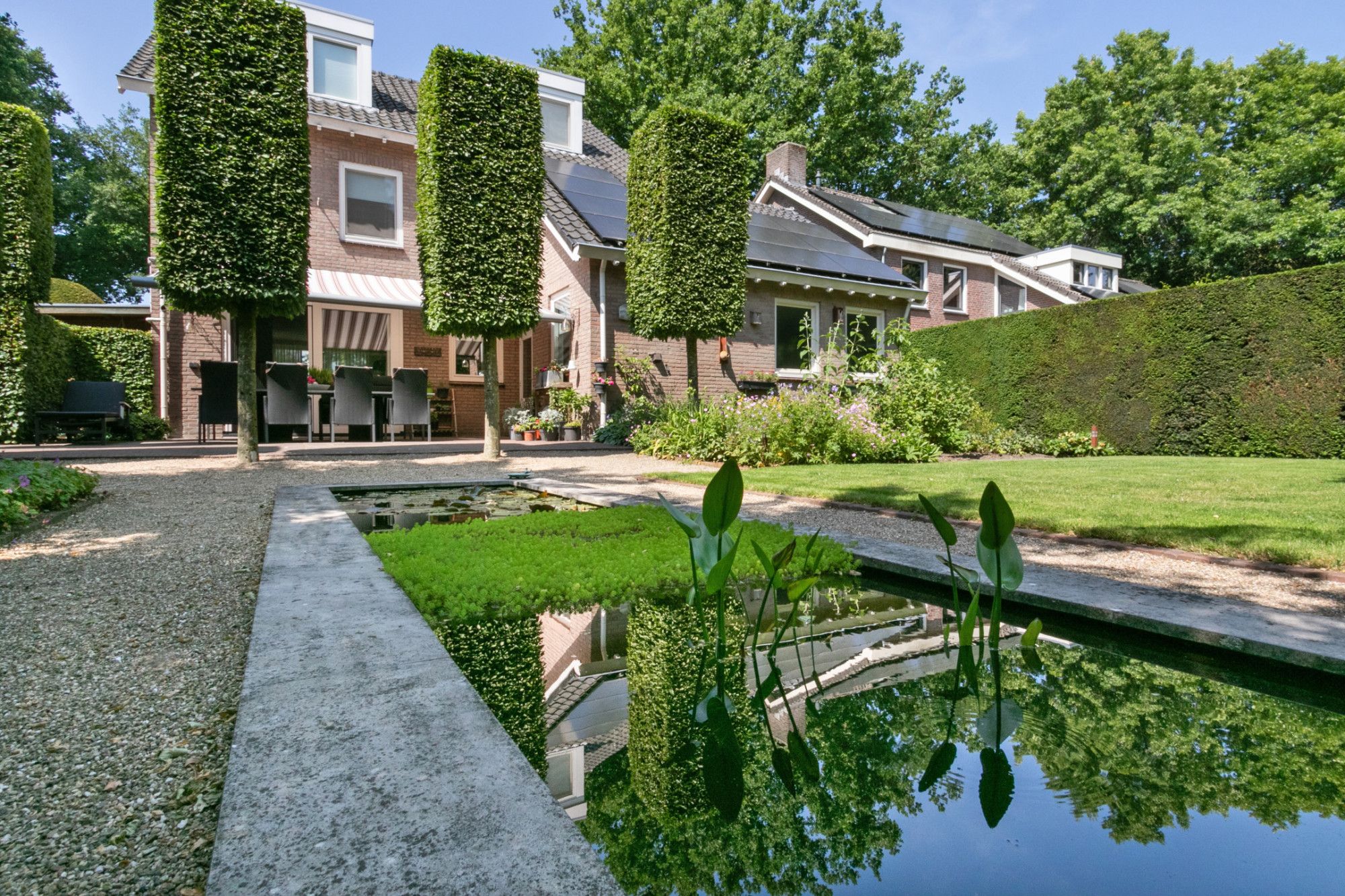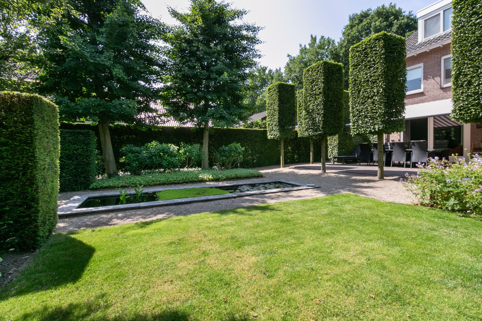 - Tuin onder architectuur met vijver, verlichting, elektrisch bedienbare zonneluifels en tuinhuis
