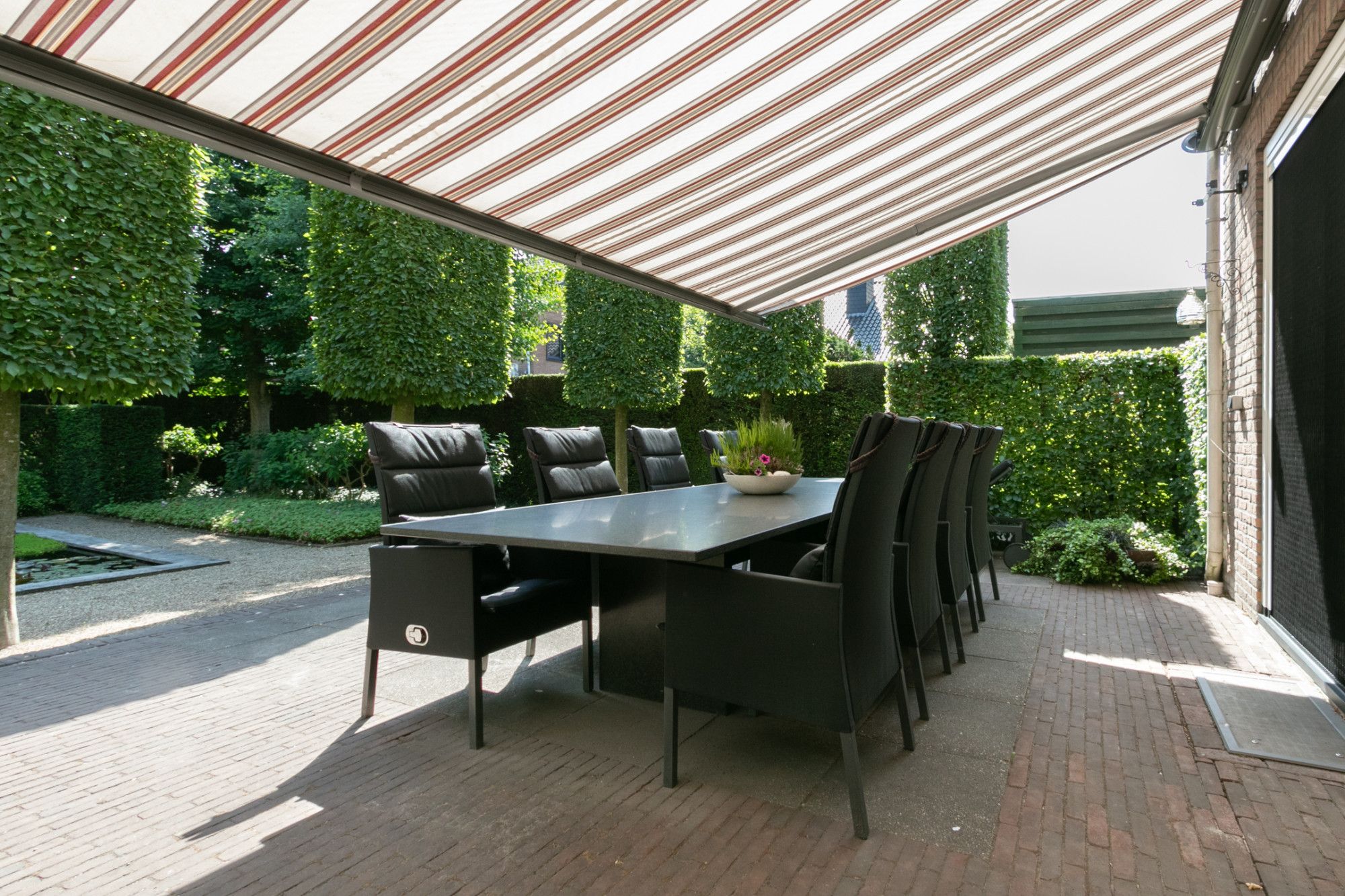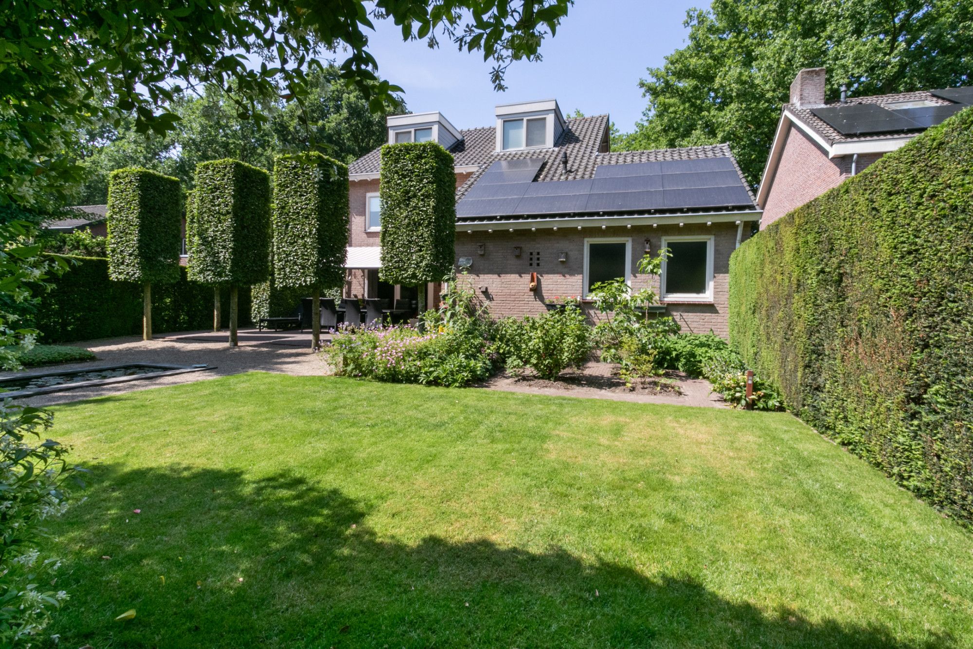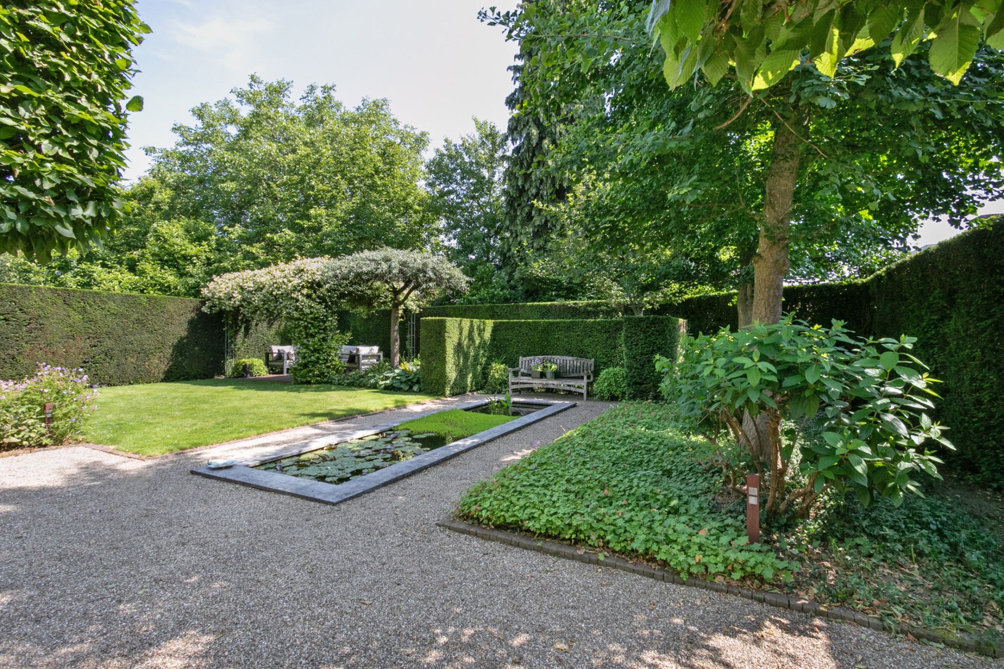 - Tuin onder architectuur met vijver, verlichting, elektrisch bedienbare zonneluifels en tuinhuis