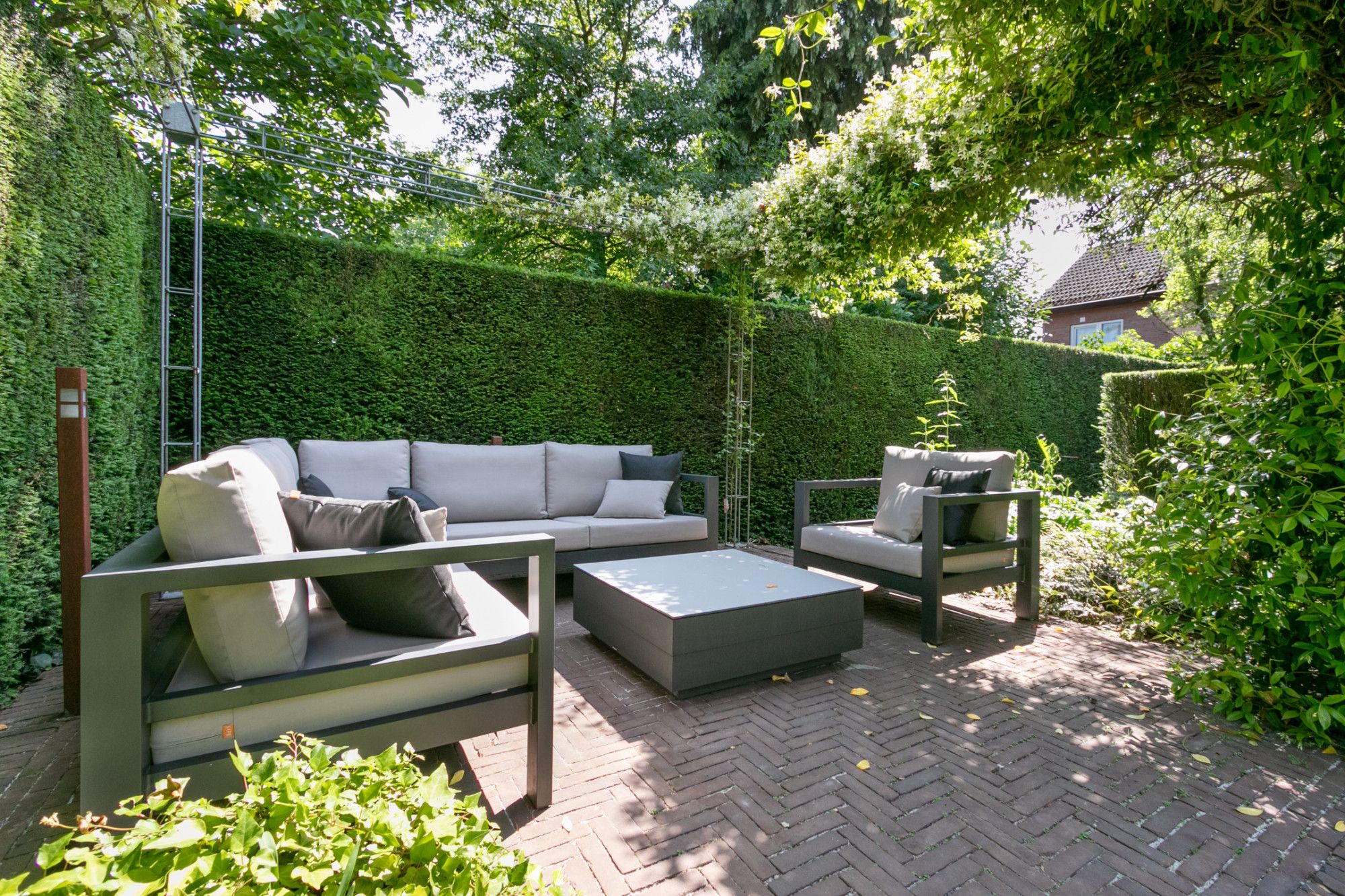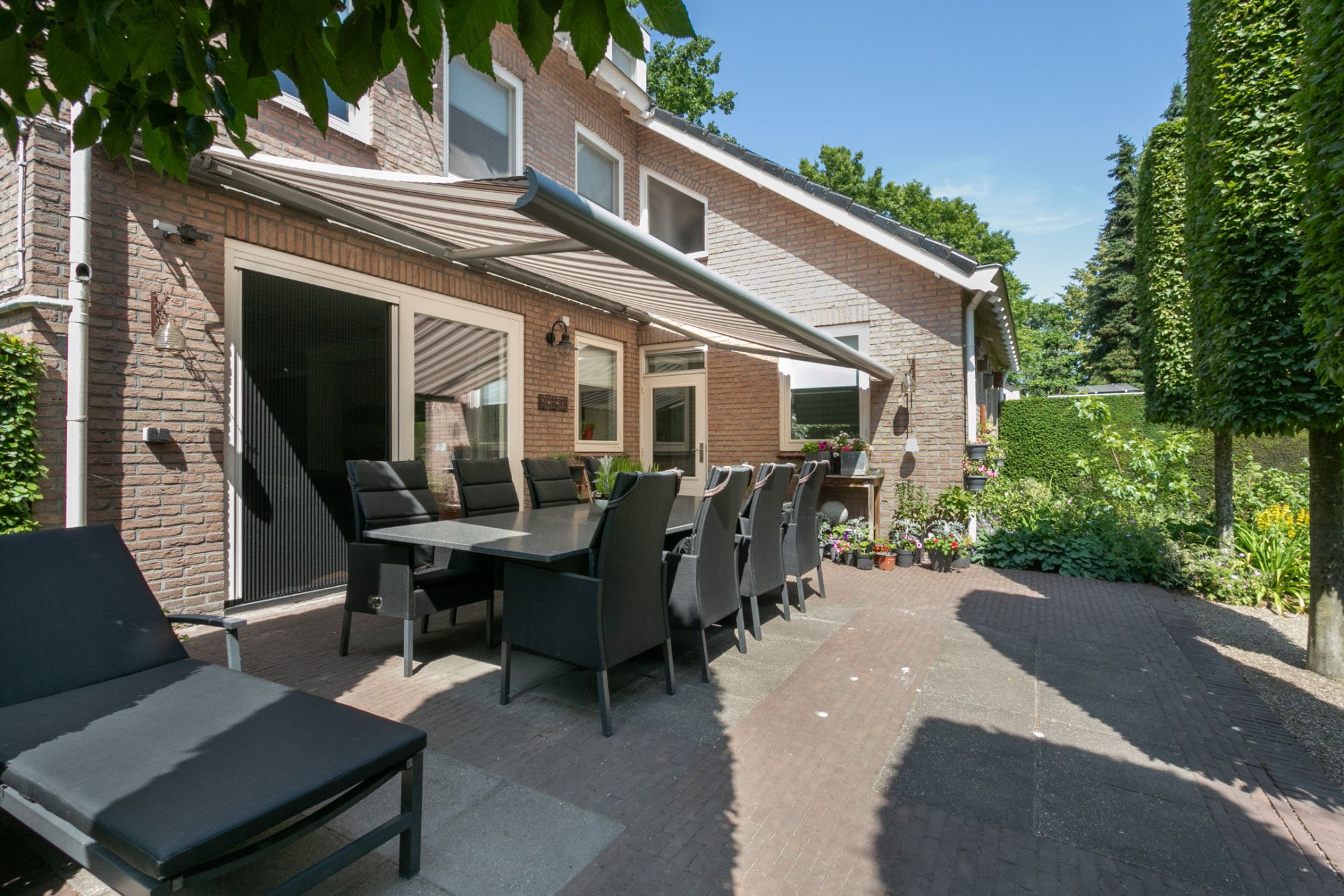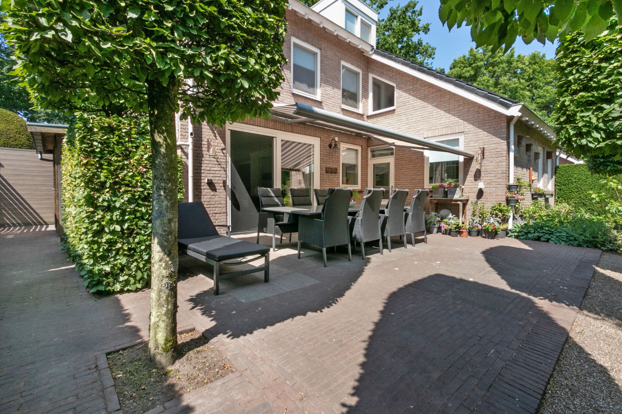 De tuin rondom de woning is onder architectuur aangelegd, met veel aandacht voor detail. Er zit een grote elektrisch bedienbare zonneluifel aan de achtergevel, een vijver, diverse planten en bomen, een knus terras achterin de tuin en een houten tuinhuisje met stroom en beklinkerde vloer. De tuin is sfeervol verlicht en voorzien van extra stroompunten.
