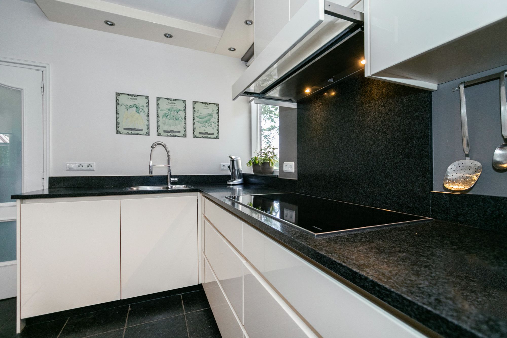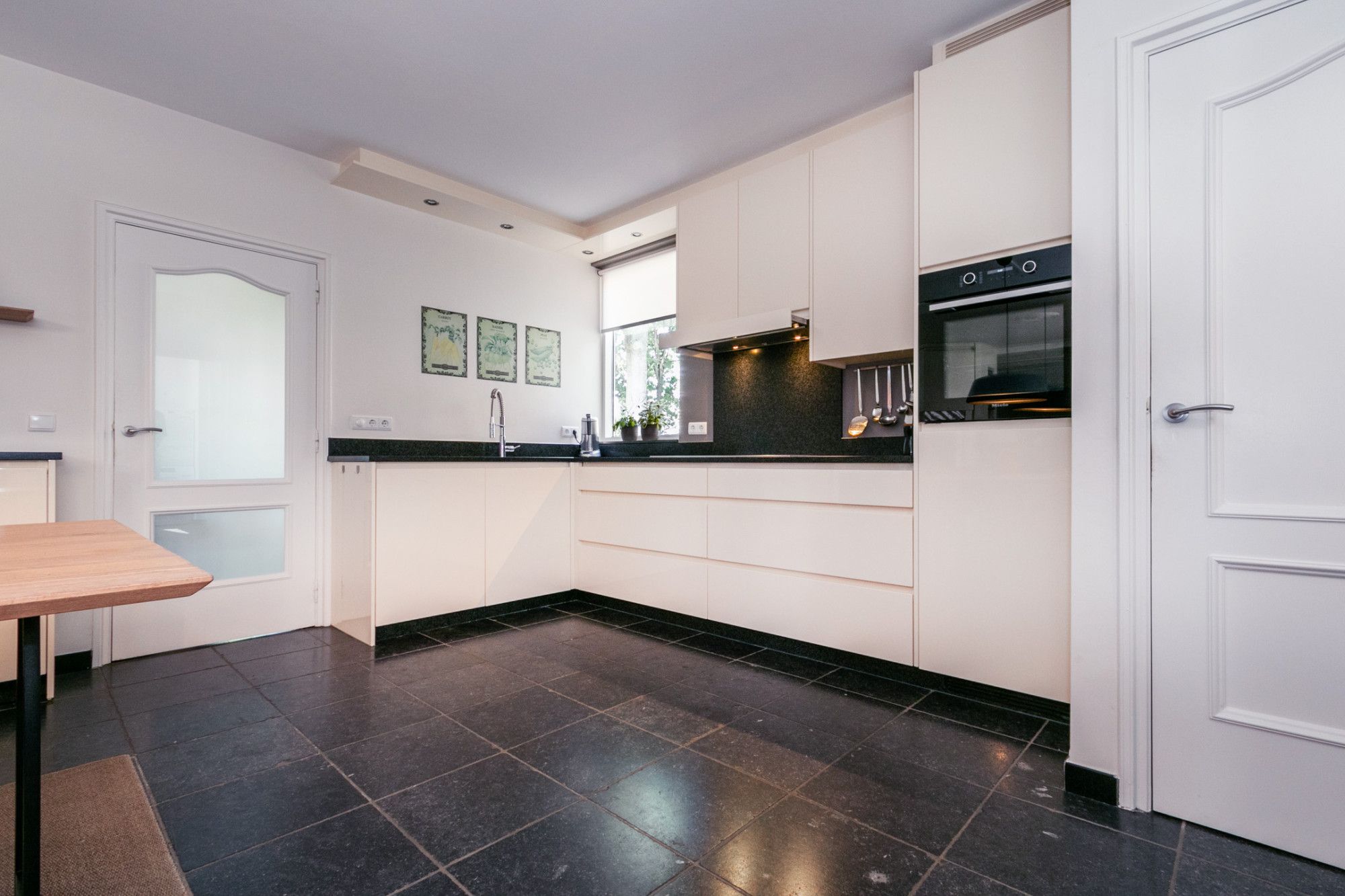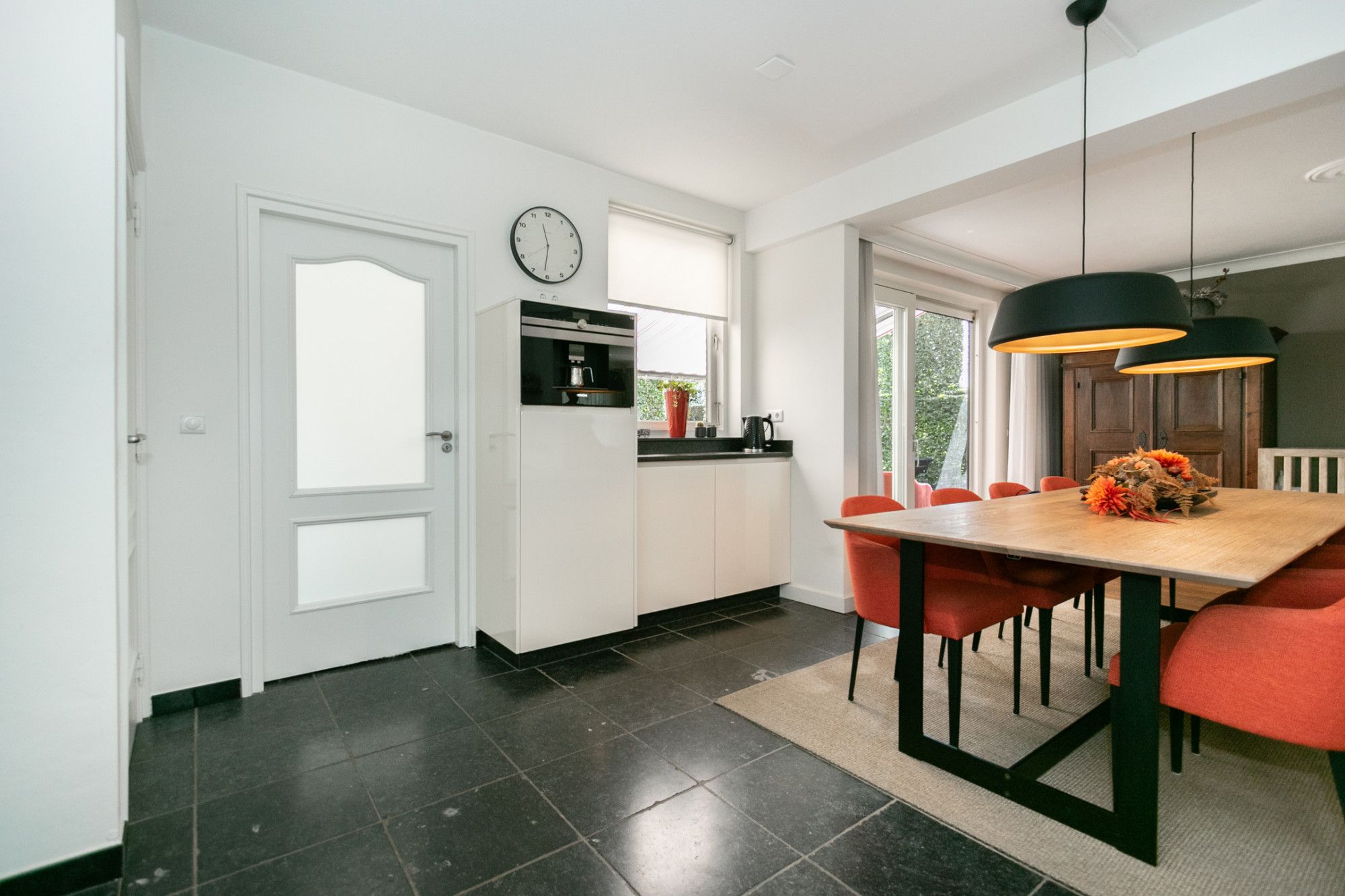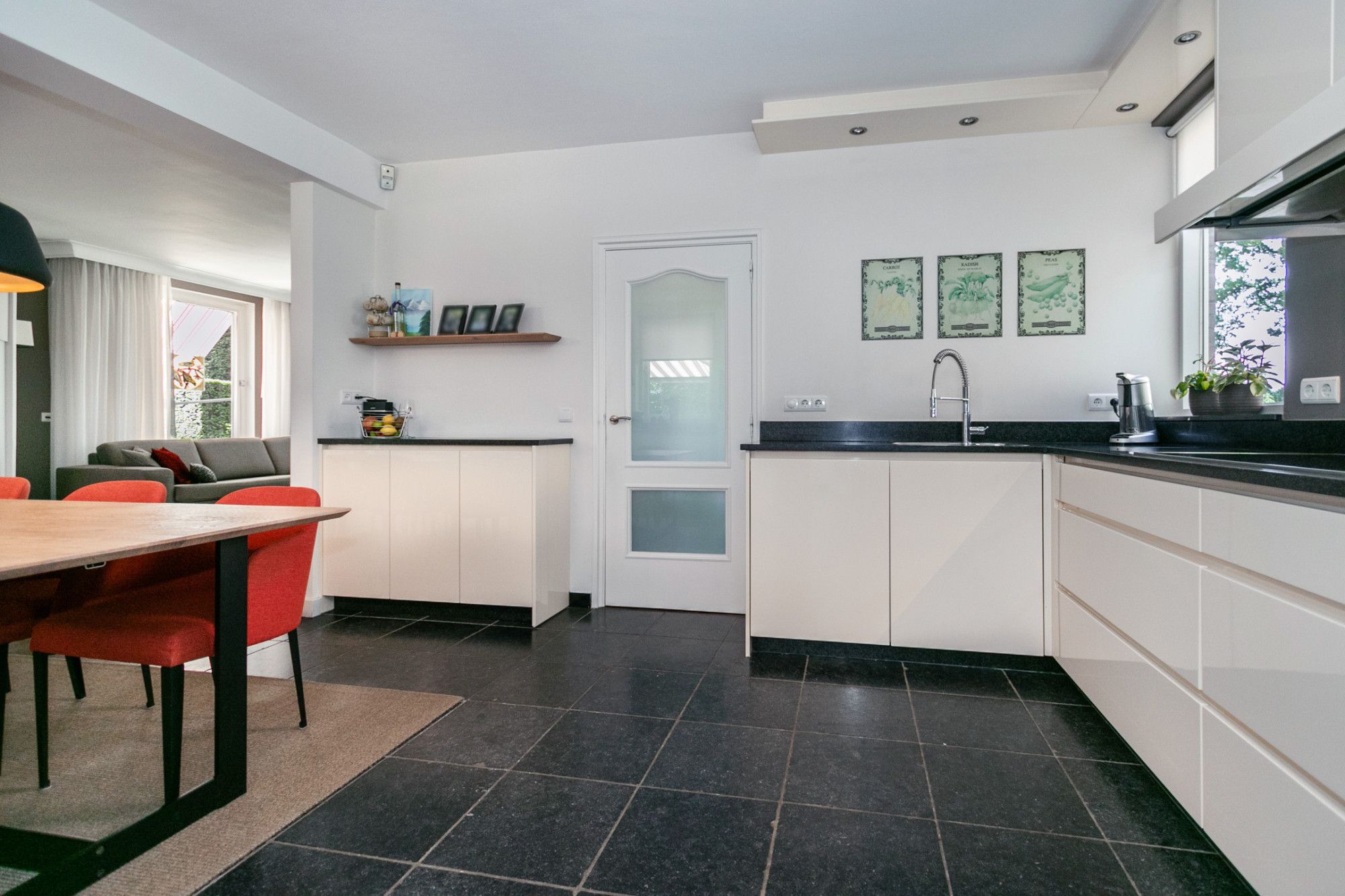 De keuken en woonkamer vormen een open, lichte leefruimte. De keuken is compleet uitgerust met inbouwapparatuur waaronder een inductiekookplaat, vaatwasser, afzuigkap, koelkast, oven, koffiemachine en veel kastruimte. Een deur leidt naar de droge kelder, perfect als provisieruimte.