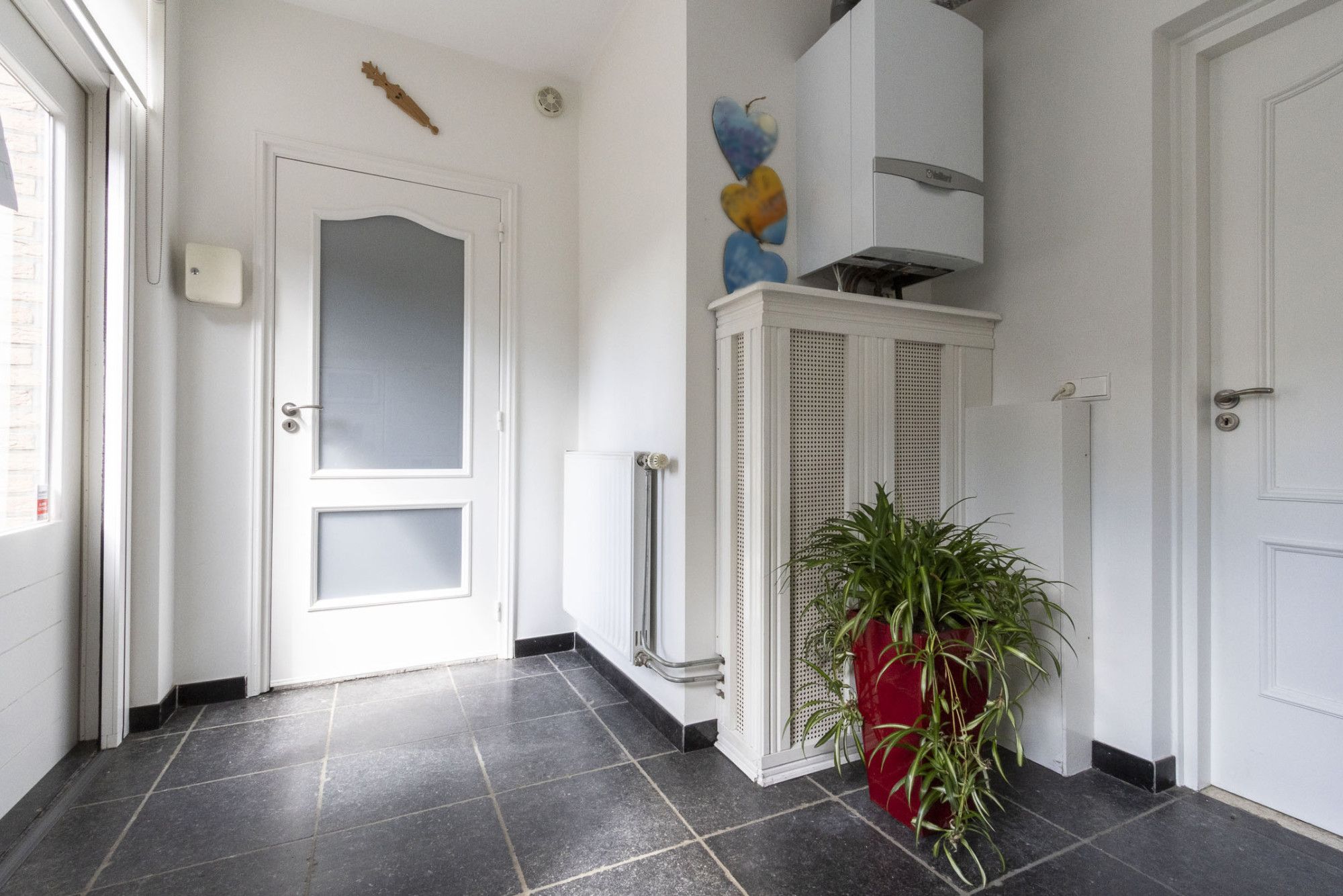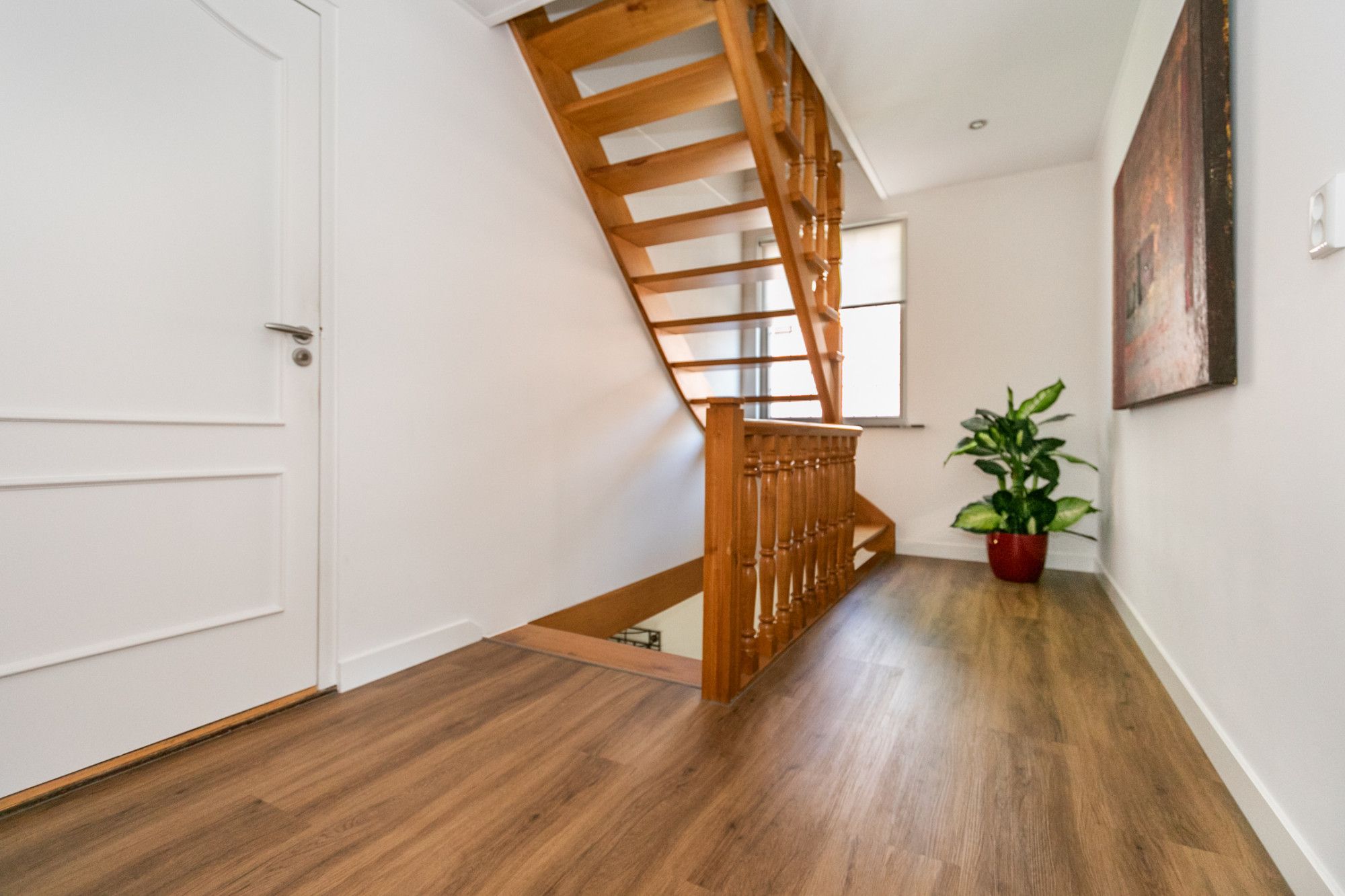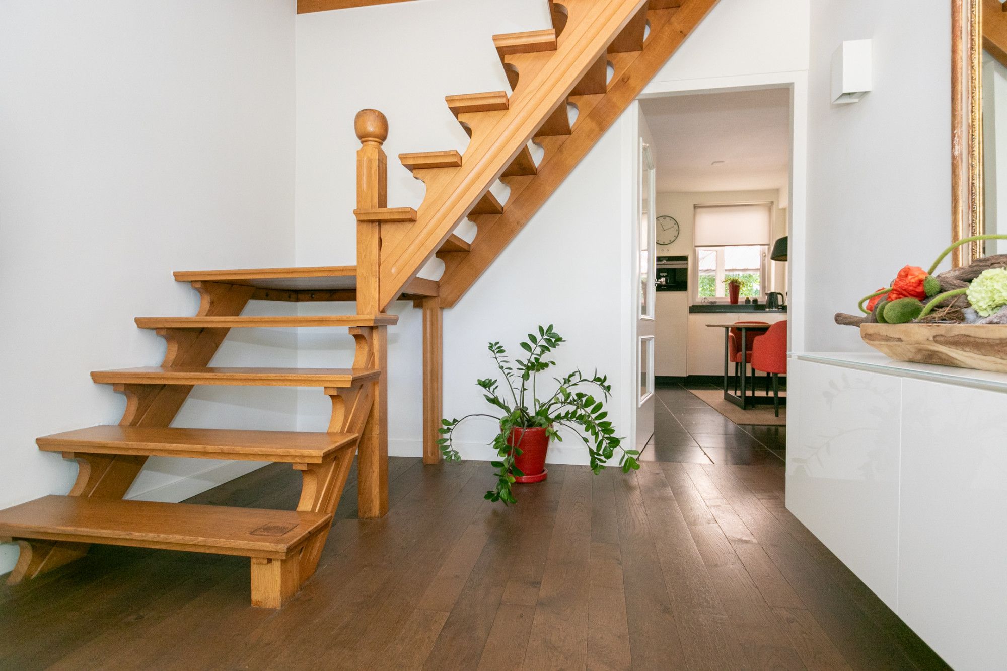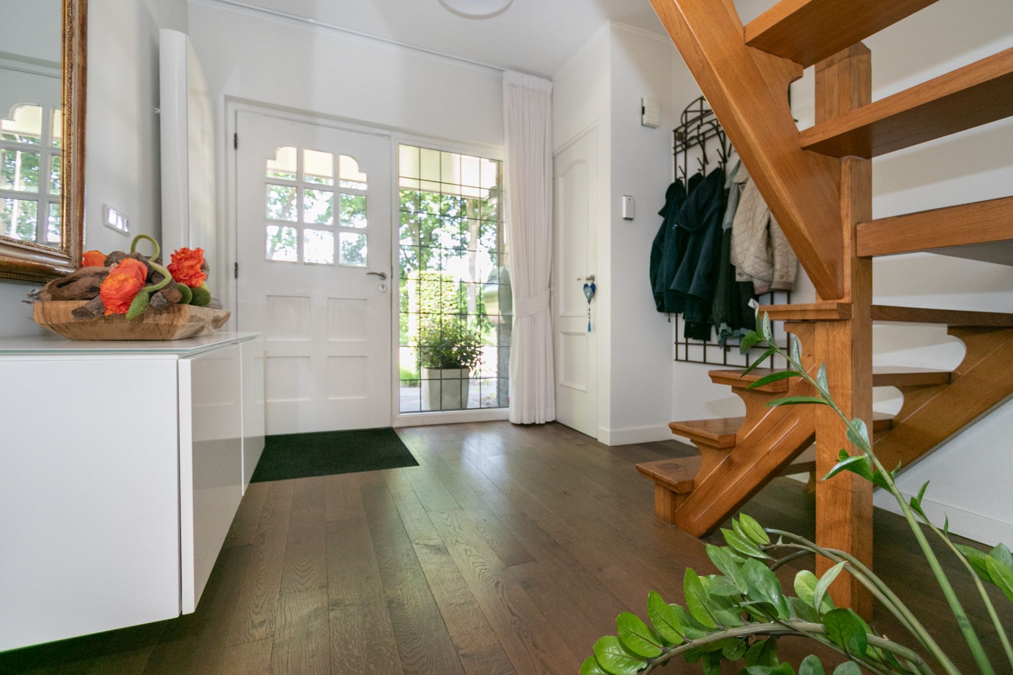 Via de diepe oprit bereik je de entree. In de ruimtelijke ontvangsthal bevinden zich de meterkast, de trap naar de eerste verdieping en toegang tot de woonkamer en keuken.