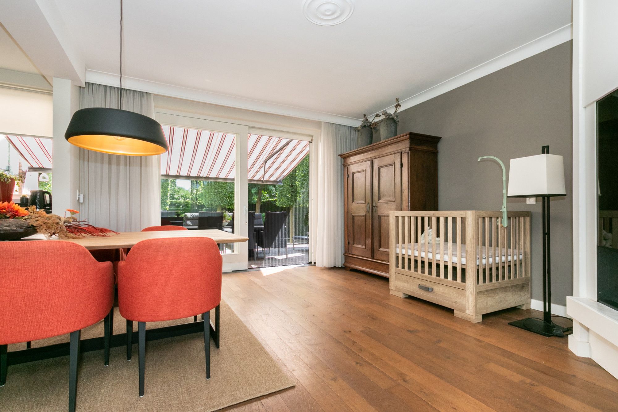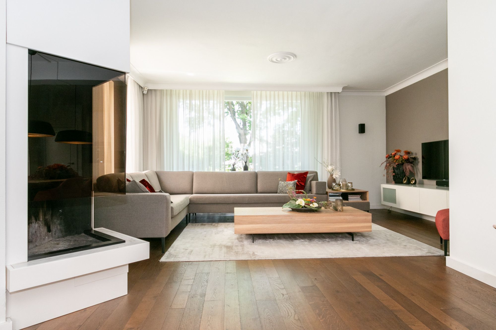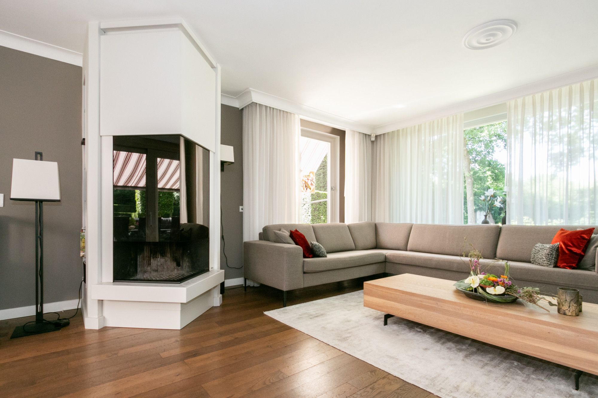 De woonkamer is royaal en sfeervol met veel lichtinval, een houthaard in een schouw en een grote luxe schuifpui naar de tuin. De schuifpui is voorzien van een hordeur.