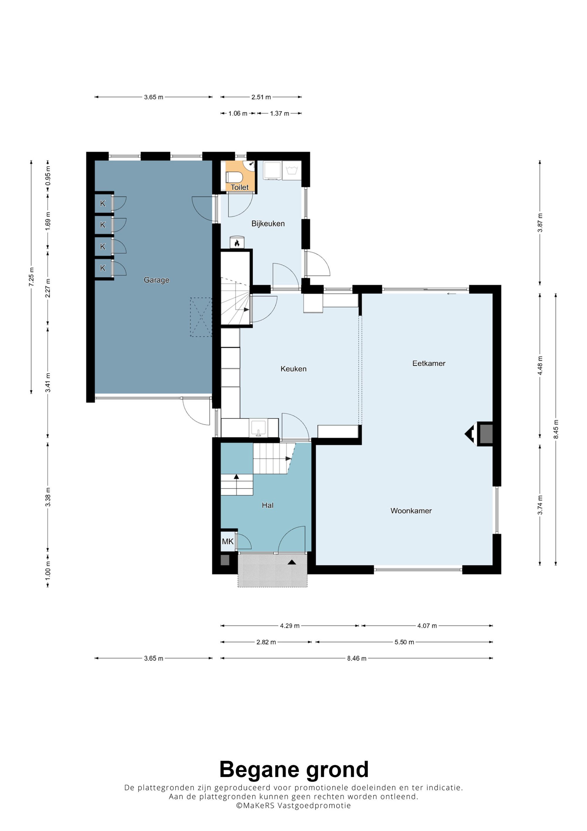 Aan de achterzijde van de keuken bevindt zich de bijkeuken met wasmachine- en drogeraansluiting, toegang tot het toilet en de inpandige garage. De garage is voorzien van warm en koud water, elektra, een automatische garagedeur én een grote vliering voor extra bergruimte.