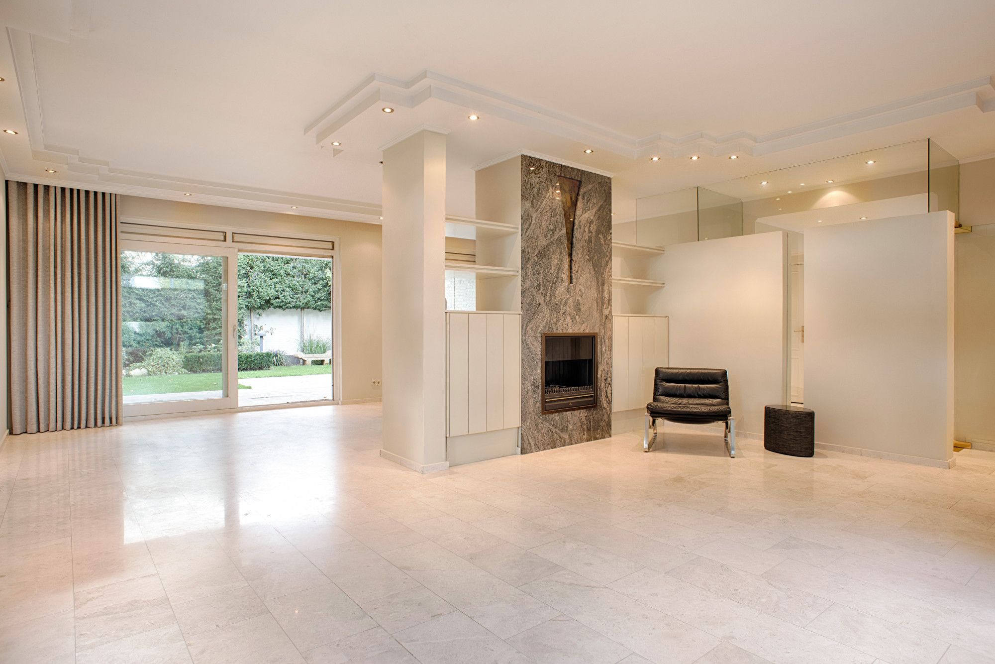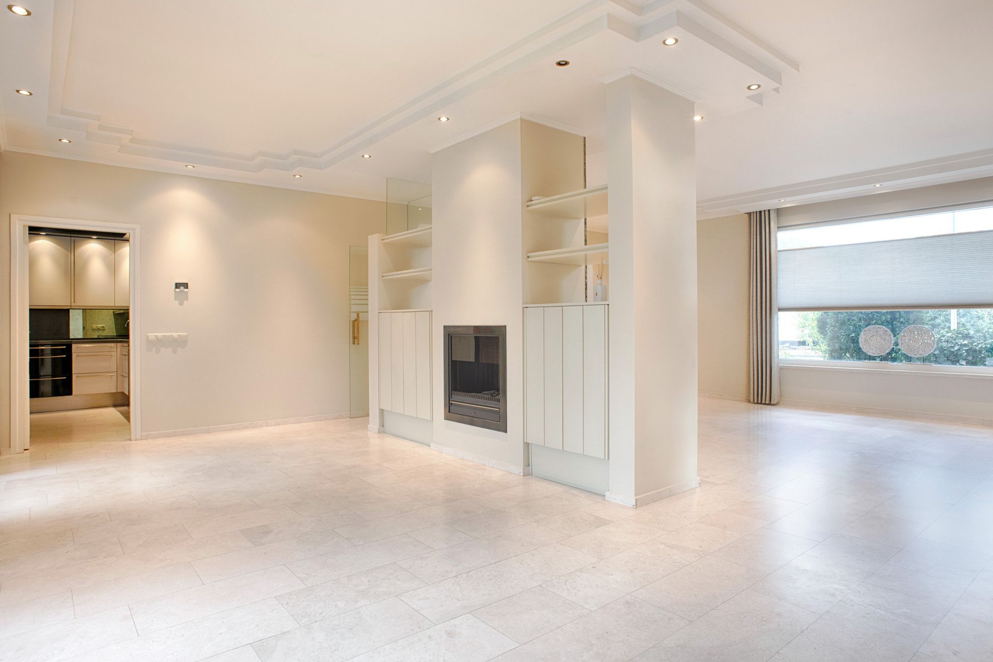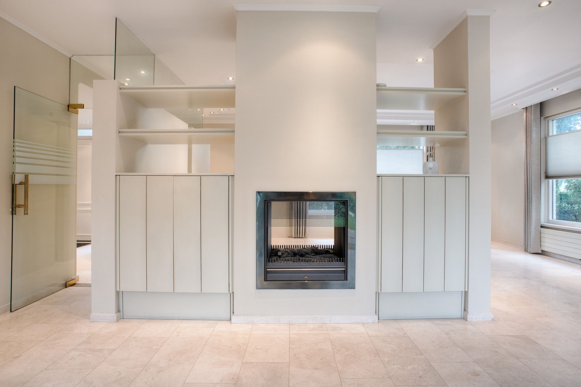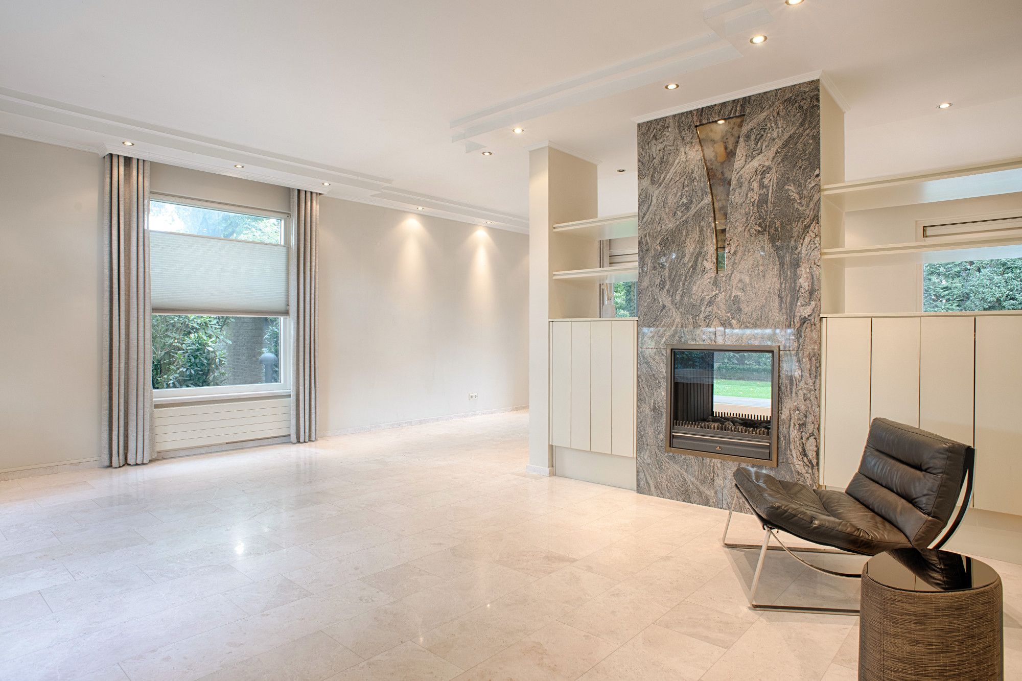Via de overdekte entree bereikt u de ruime ontvangsthal. Vanuit hier zijn de woonkamer, keuken, de eerste drie slaapkamers en de 1e badkamer bereikbaar. Ook vindt u in de hal een garderobe met bergkast en een separate toiletruimte met toilet en fonteintje. De woonkamer is royaal opgezet en voorzien van een natuurstenen vloer met vloerverwarming. De tweezijdige gashaard met natuursteenmantel verdeelt de ruimte op stijlvolle wijze in een zit- en eetgedeelte en zorgt voor een warme, huiselijke sfeer. Grote raampartijen en een schuifpui naar het overdekte terras maken de woonkamer heerlijk licht en luchtig. De keuken is uitgevoerd met een nette combinatie in hoekopstelling, afgewerkt met een corian werkblad en uitgerust met diverse inbouwapparatuur, waaronder een inductiekookplaat, afzuigkap, combi-oven, koelkast en een vaatwasser. Aangrenzend ligt de praktische bijkeuken met extra bergruimte, aansluitingen voor witgoed, een schuifkastenwand en een loopdeur naar de achtertuin. Op de begane grond bevinden zich verder de eerste drie slaapkamers. De hoofdslaapkamer biedt fraai zicht op de achtertuin en beschikt over een maatwerk garderobekast en directe toegang tot de en-suite badkamer. Deze complete 1e badkamer is voorzien van vloerverwarming, een whirlpool, inloopdouche, dubbele wastafel, bidet en tweede toilet. De twee overige kamers zijn multifunctioneel te gebruiken, bijvoorbeeld als werkkamer, logeerkamer, thuiswerkplek of aan huis gebonden beroepen.