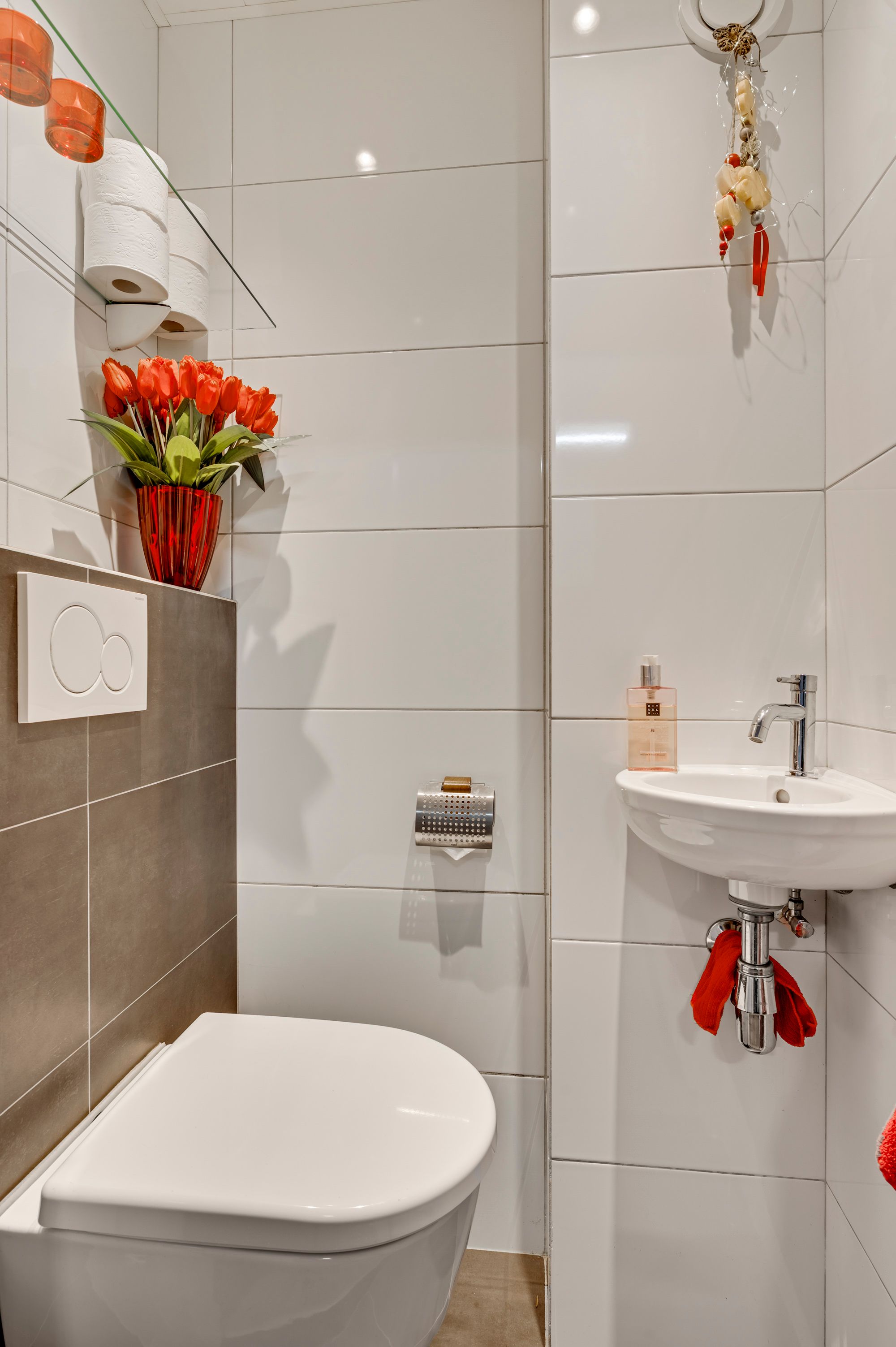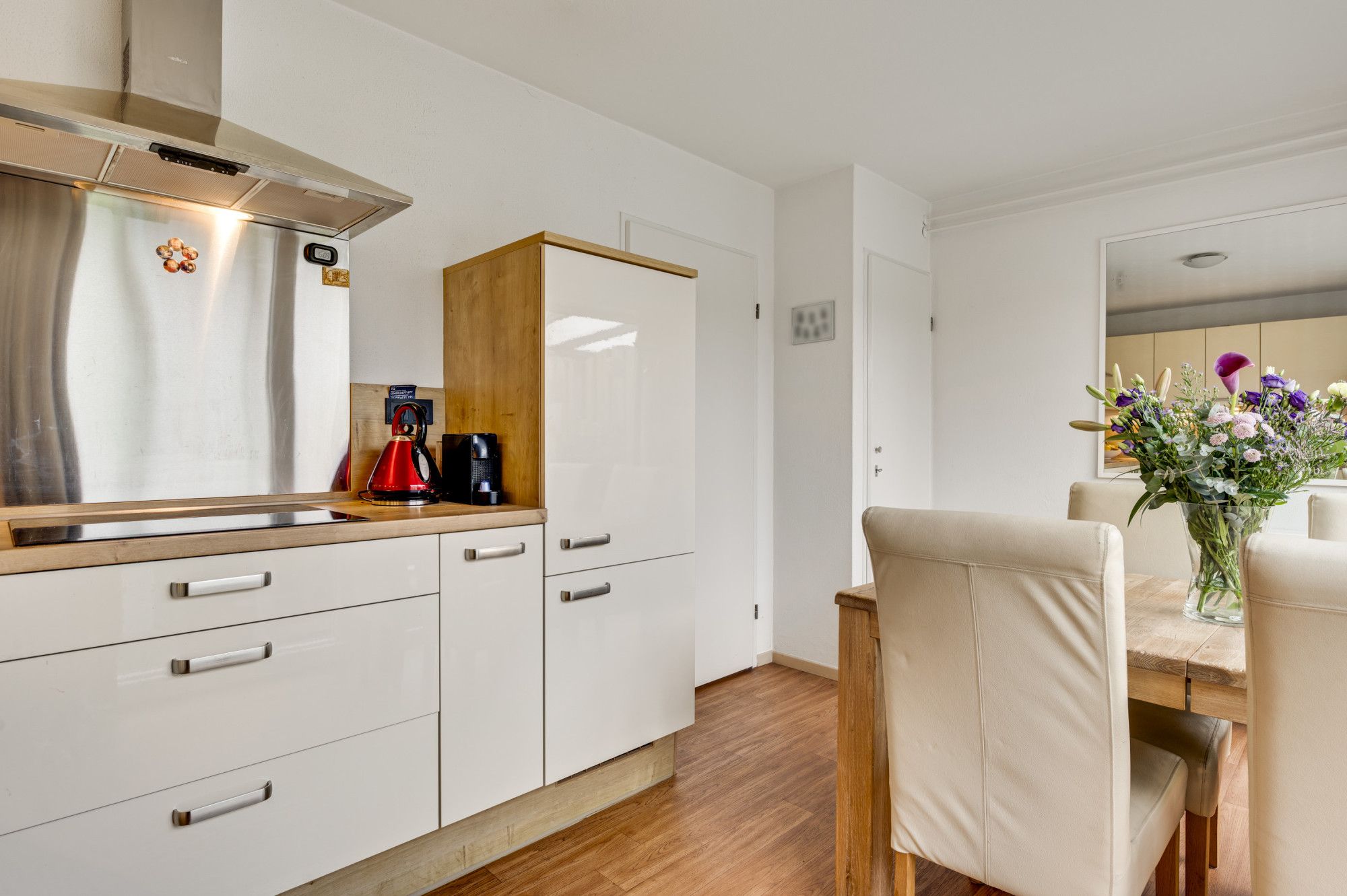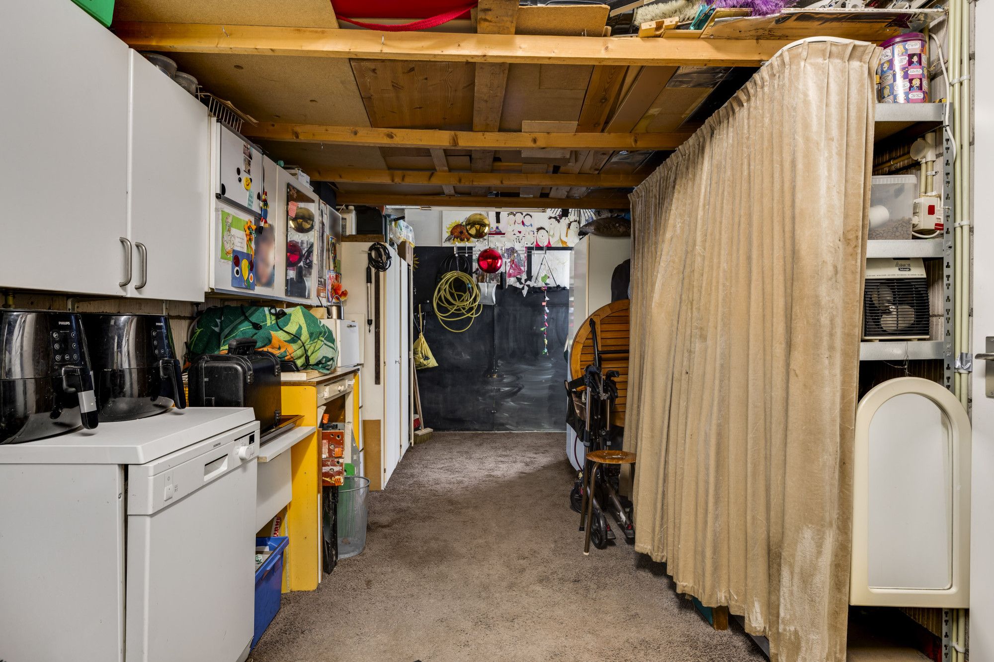 Via de overdekte entree is de hal bereikbaar, voorzien van de meterkast, het toilet met fonteintje en toegang tot de inpandige garage met bijkeuken gedeelte en de woonkeuken. De garage beschikt over witgoedaansluitingen, een wasbak en een loopdeur naar de voortuin. De royale keuken aan de achterzijde biedt middels een grote schuifpui directe toegang tot de privacy volle achtertuin. De keuken is ingericht met een combinatie in hoekopstelling en voorzien van een inductiekookplaat, afzuigkap, magnetron en koelkast, evenals een close-in boiler (in aangrenzende garage gesitueerd). De vaatwasser is om de hoek tevens in de garage/bijkeuken gesitueerd en is ter overname bespreekbaar.