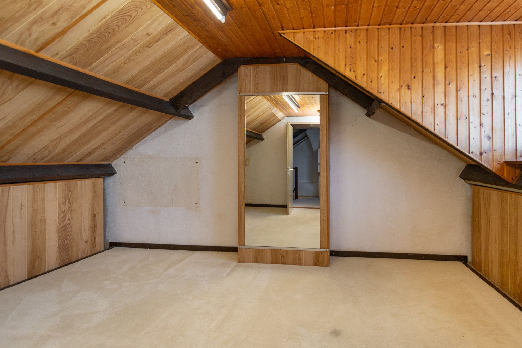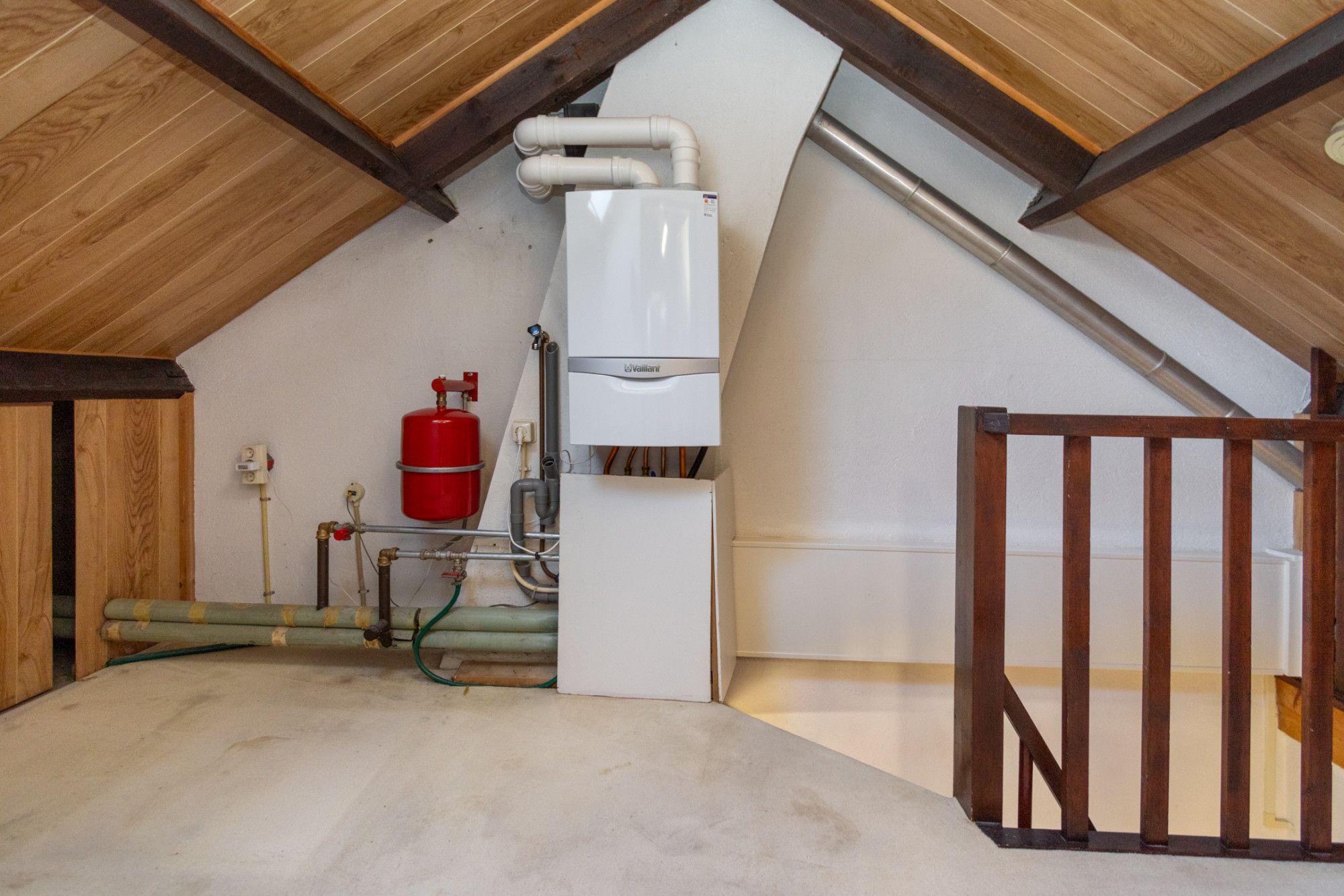 Via de vaste trap kom je op de zolderverdieping, waar de dakkapel zorgt voor extra licht en een verrassend ruimtelijk gevoel. Hierdoor leent deze verdieping zich uitstekend voor het creëren van een extra slaapkamer, werkruimte of hobbykamer. Op het eerste gedeelte van de zolder is de Vaillant cv ketel (2018) geplaatst. Onder de schuine dakvlakken is extra bergruimte gerealiseerd door middel van praktische schuifdeuren, waardoor de ruimte optimaal wordt benut.